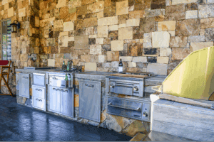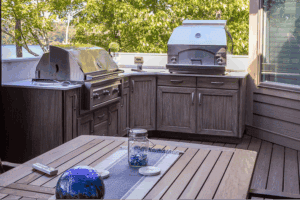 An elegant mountain-view outdoor kitchen outfitted with Lynx appliances, stone veneer, and wood-look finishes—crafted for relaxation, entertainment, and connection to nature.