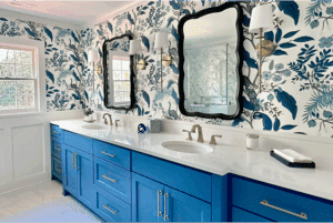 A vibrant, budget-savvy remodel infused with bold peacock tones, creative accessibility, and reimagined space planning—transforming a dated primary bath into a colorful, functional sanctuary.