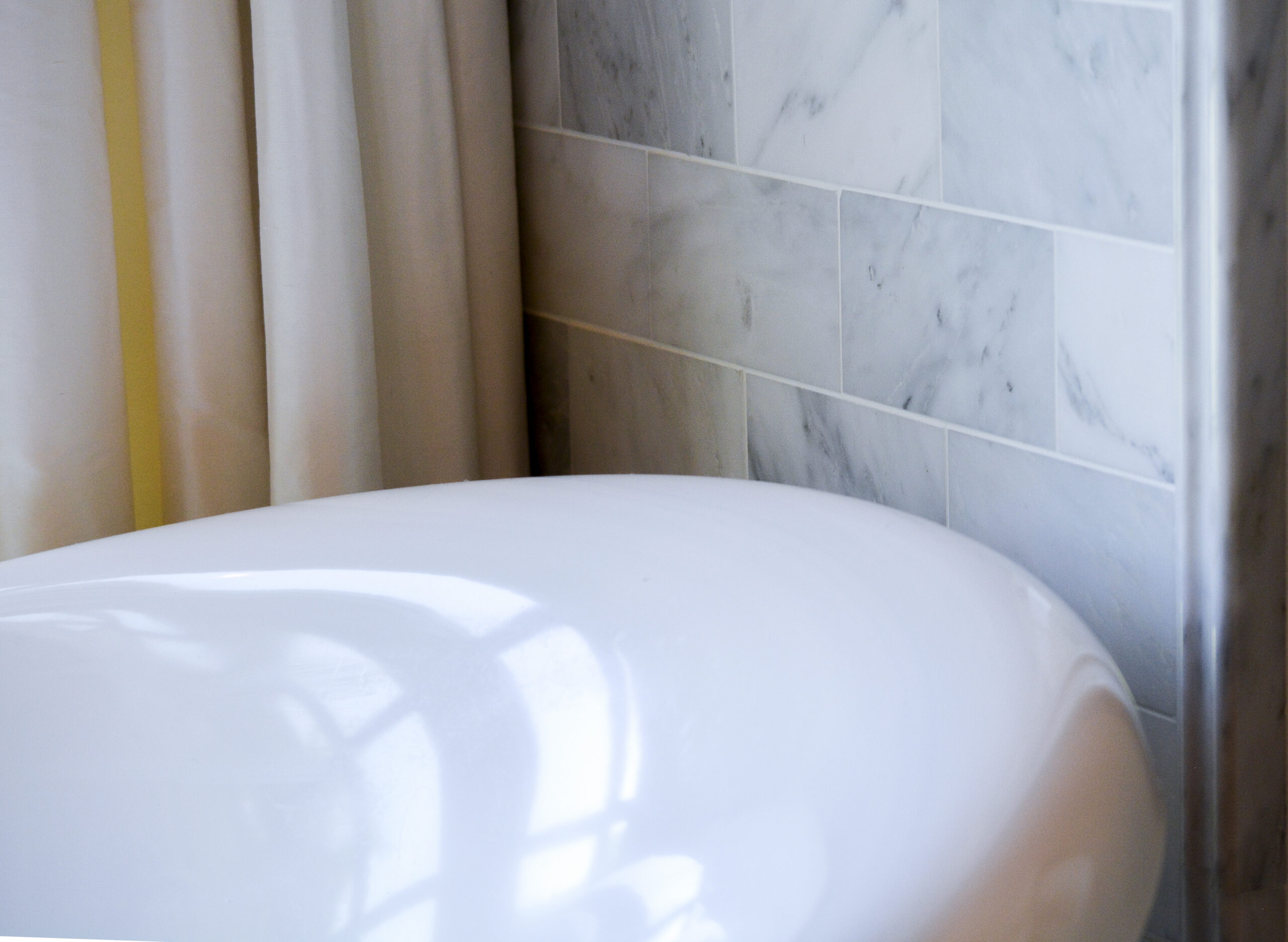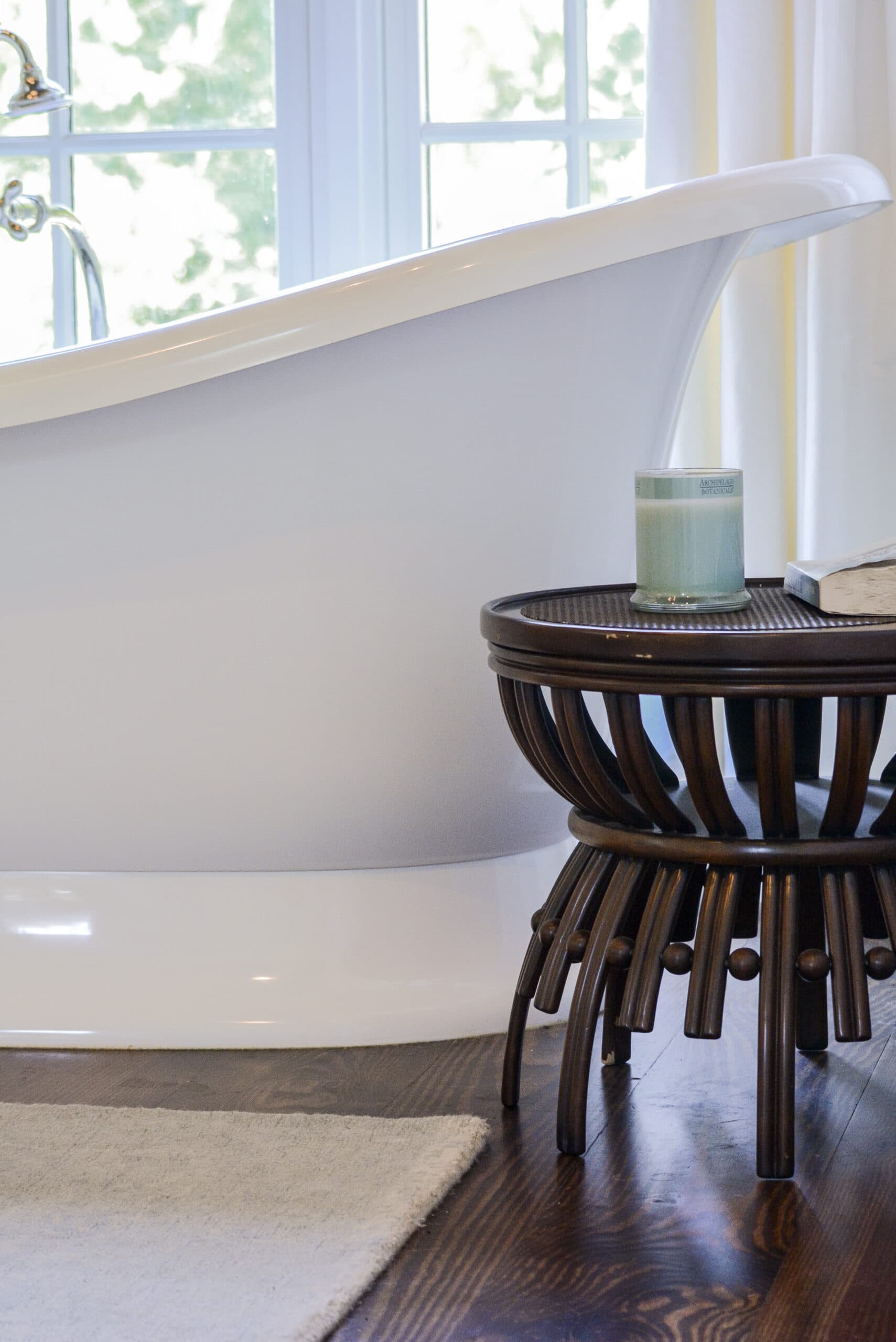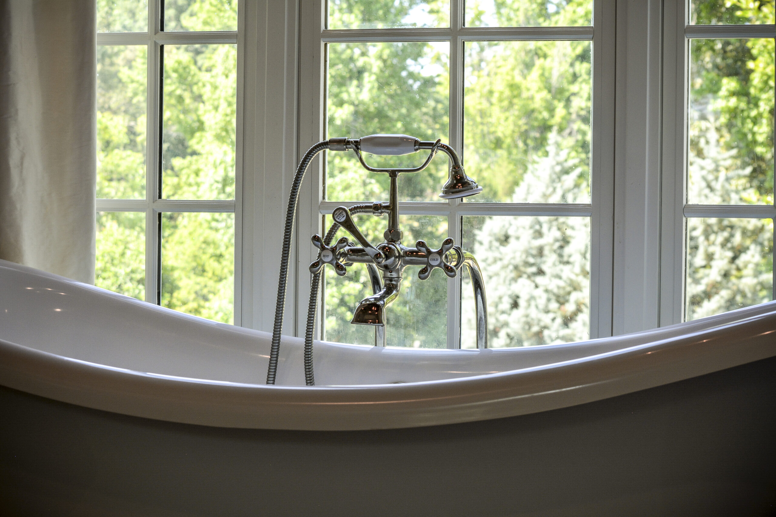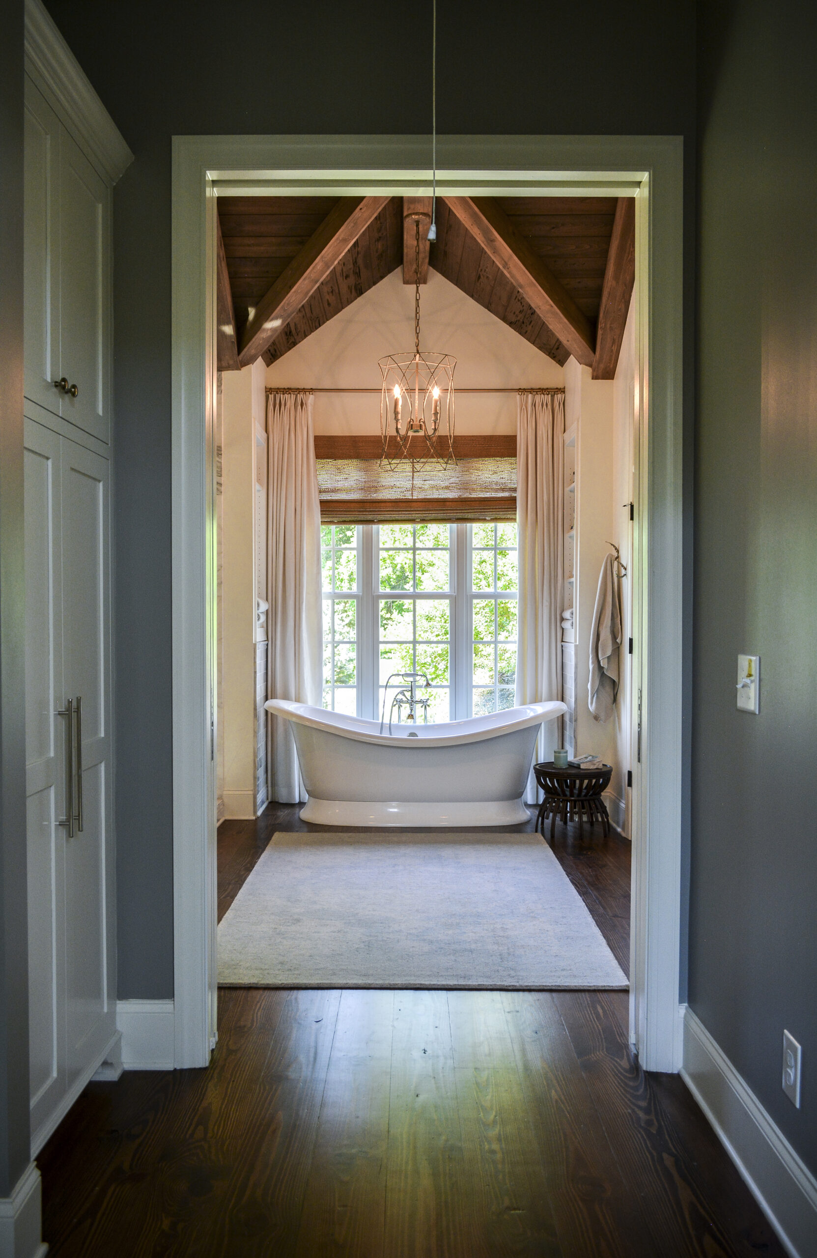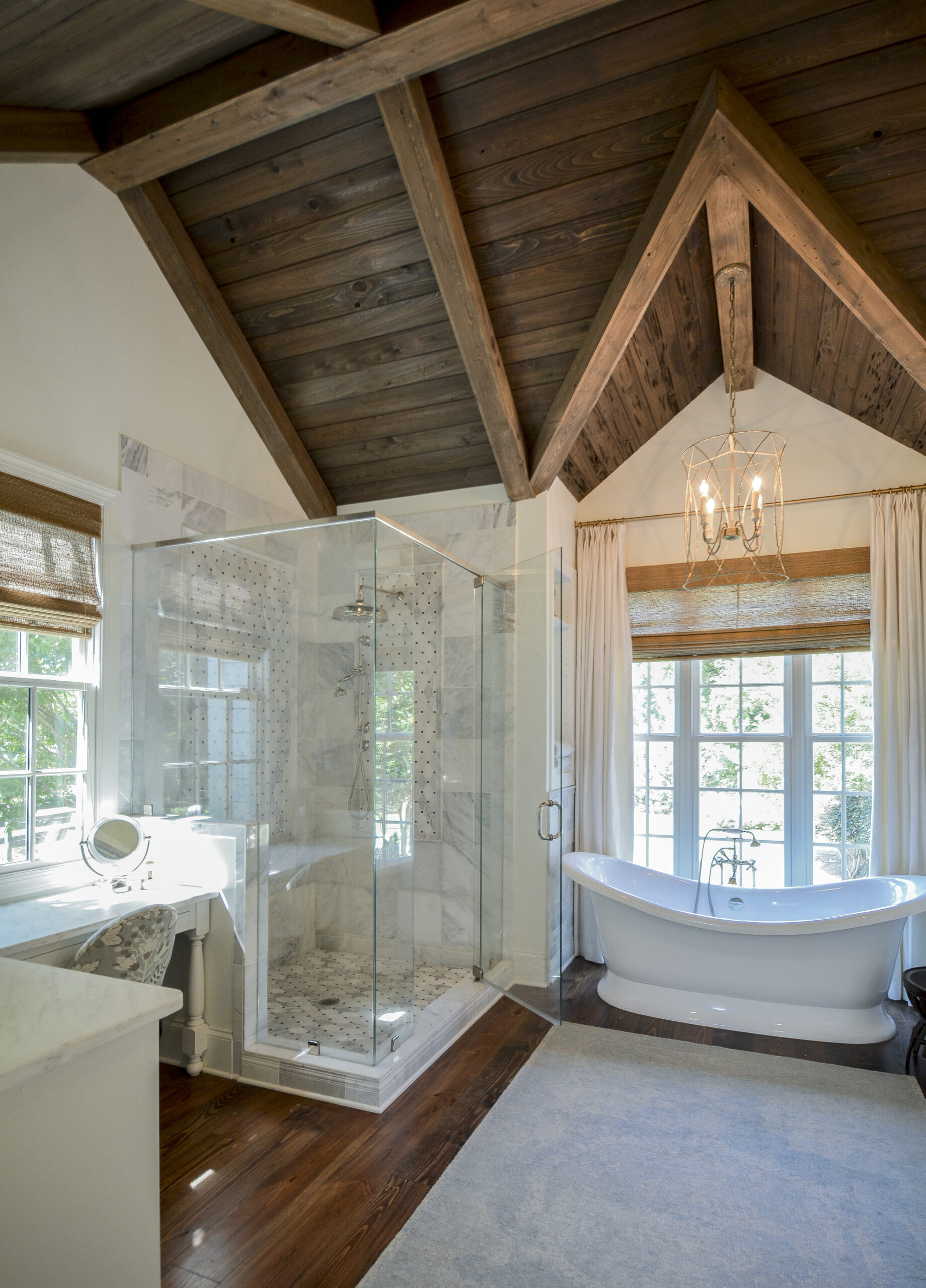 Cathedral ceilings in the new full bath are sheathed with warm wood planks, making the space feel like a luxurious spa getaway. A serene freestanding tub with classic floor-mounted tub filler and traditional hand sprayer, nestled in a historically designed cradle, is centered on the walkway leading from the bedroom to the bathroom—creating a stunning visual scene.