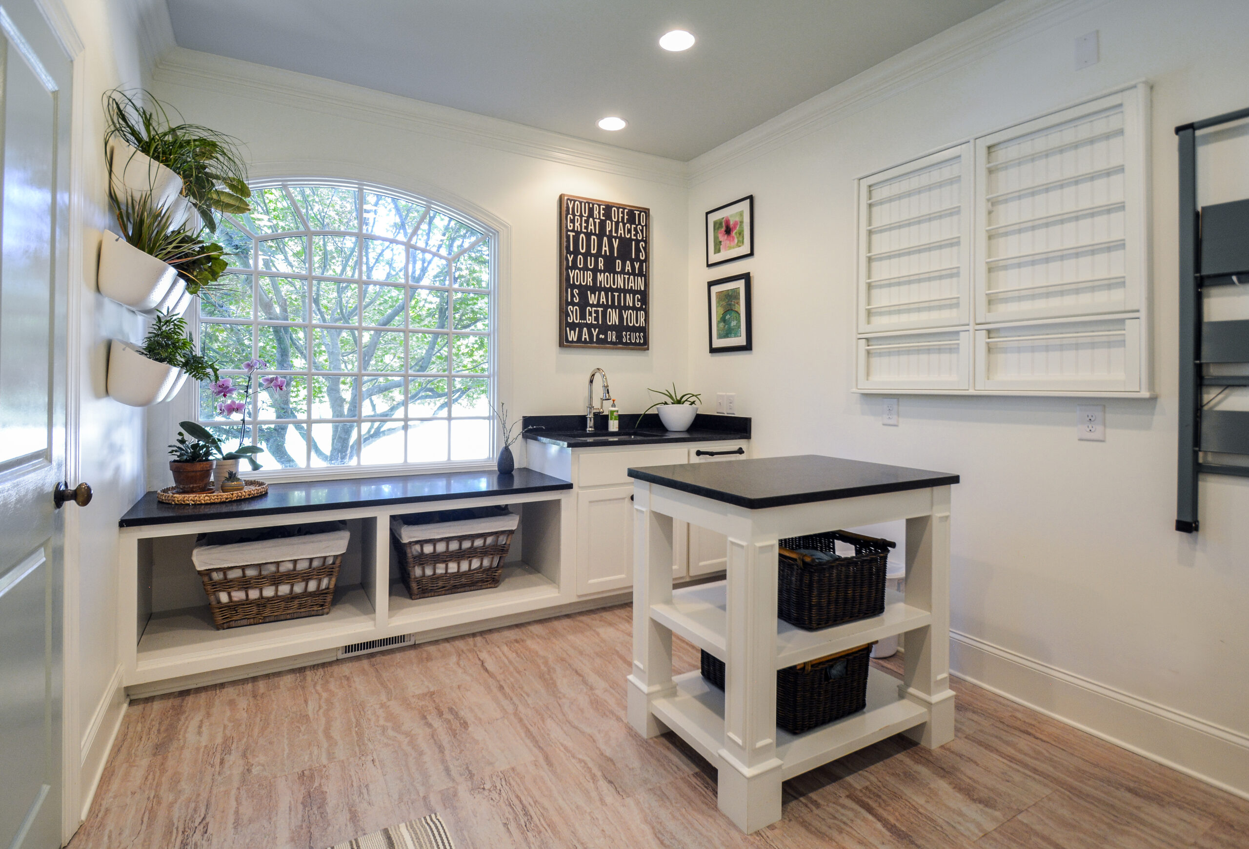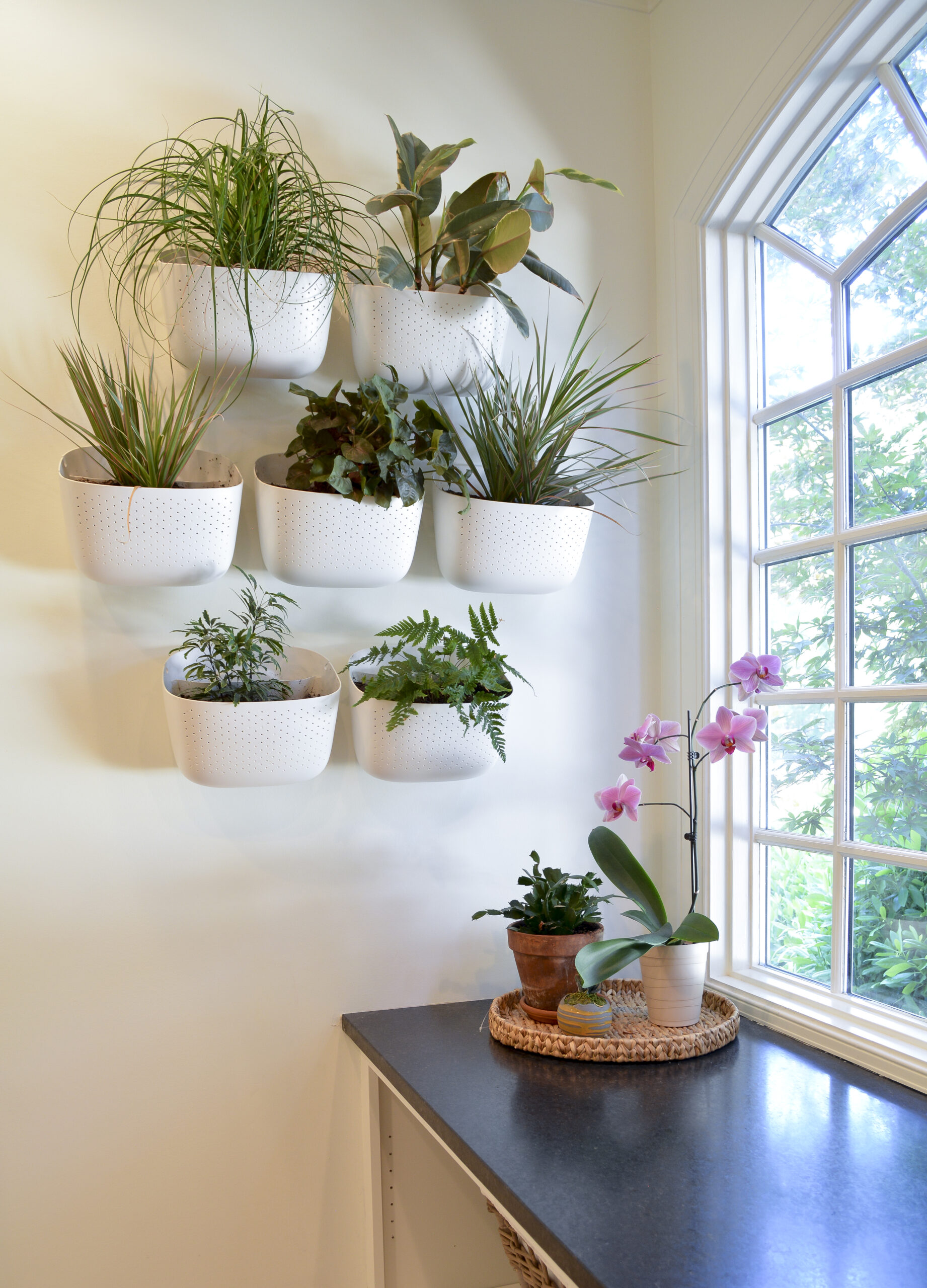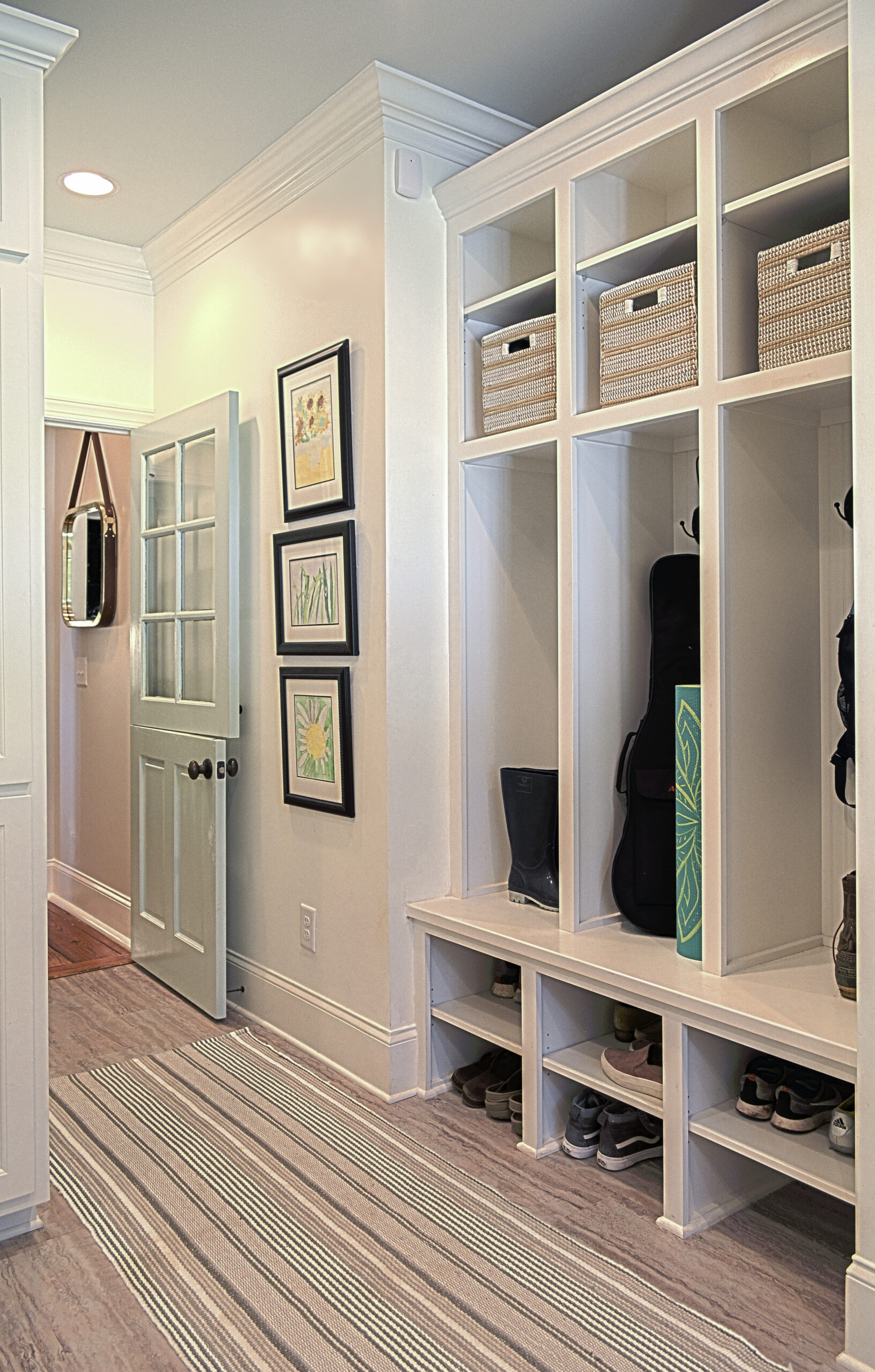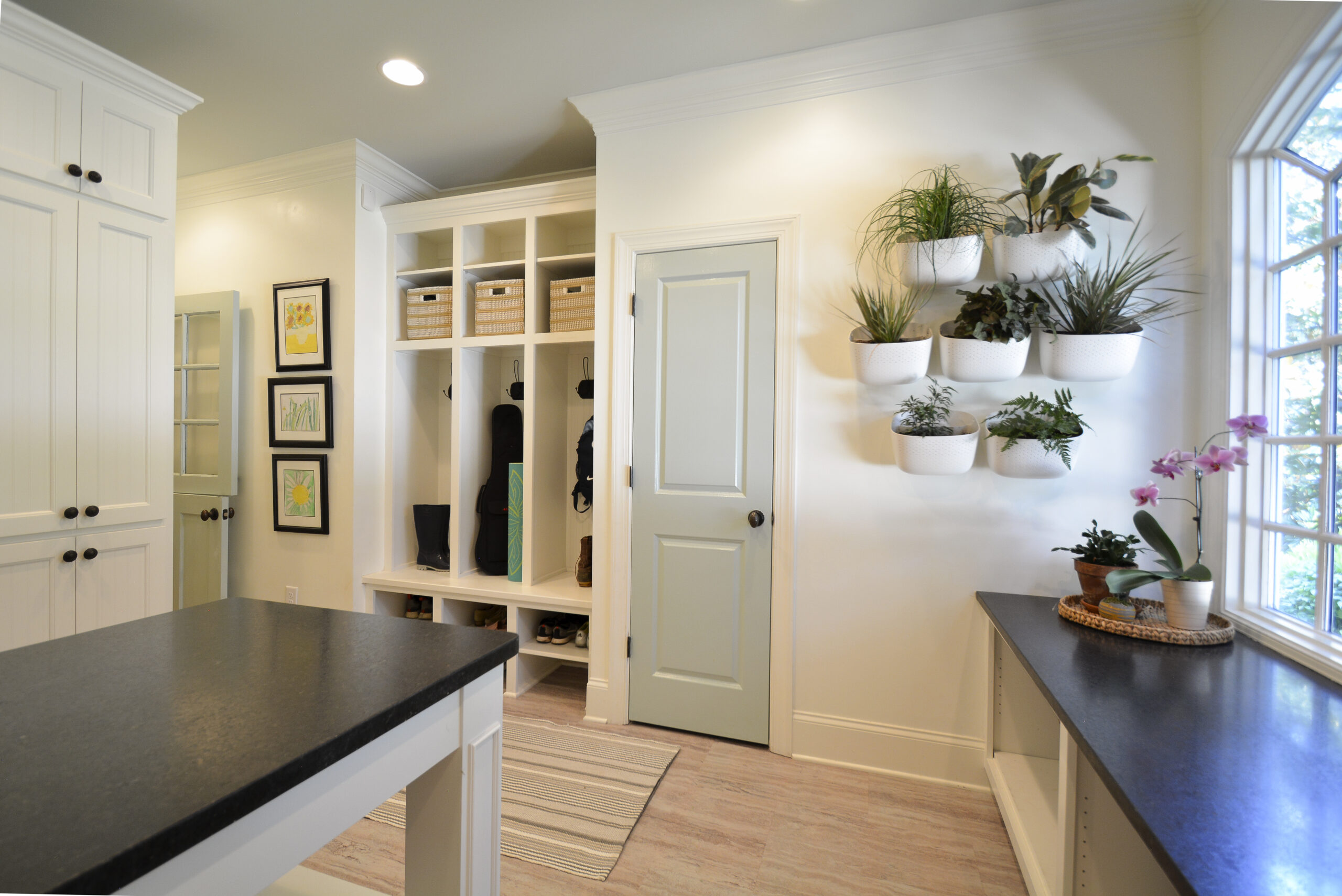 The large picture window that once sat above a garden tub provides a wash of sunlight for the new living wall feature. Folding surfaces, shelving for laundry baskets, tilt-out drying racks, and built-ins for jackets, bookbags, shoes, and sporting equipment check off the final items from a Wishlist that is now a reality.
