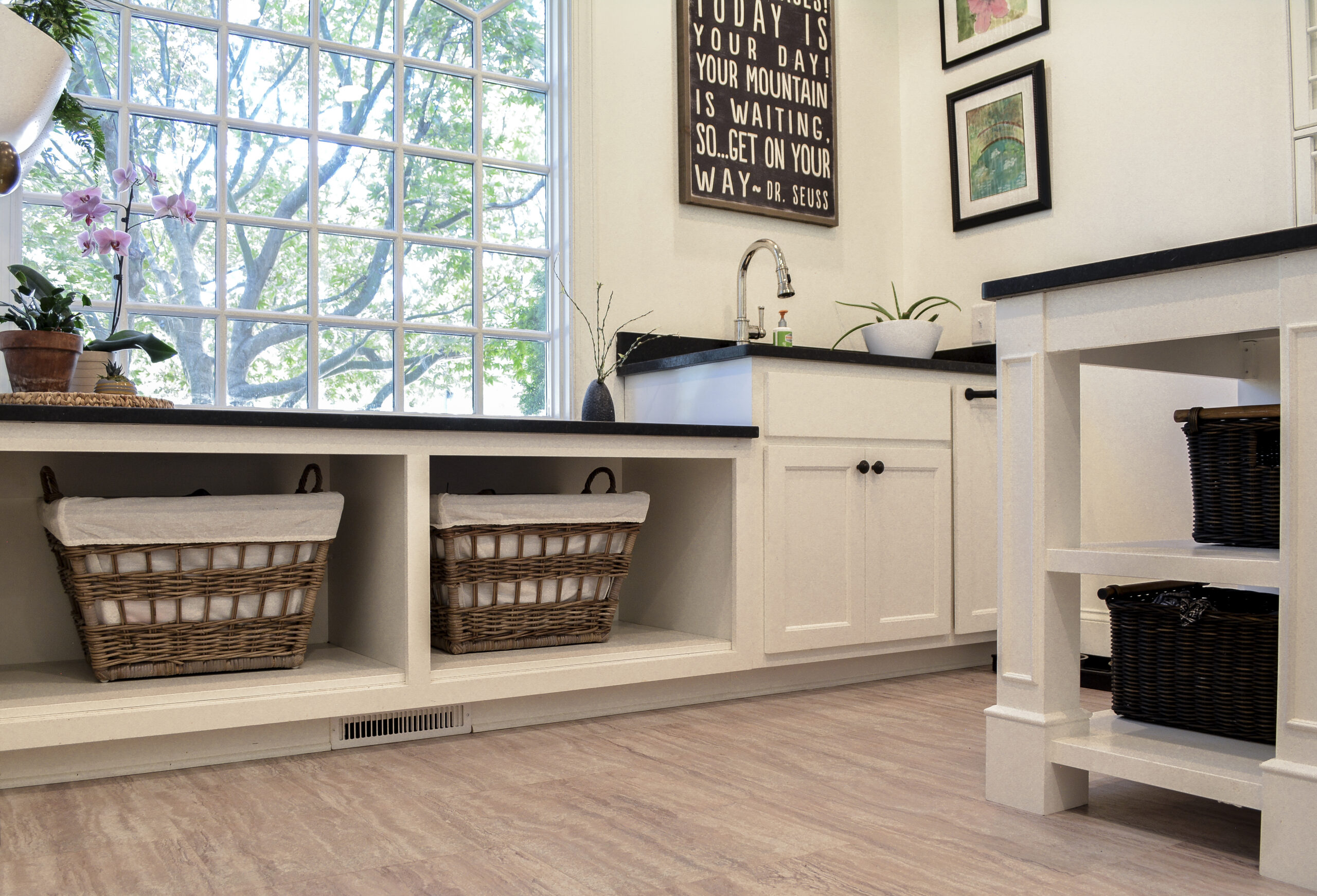 The new family room was designed to give just the right amount of extra space to the existing kitchen, dramatically improving its flow and function without requiring a full remodel. The new laundry room feels at home in the space formerly used as the primary bathroom.