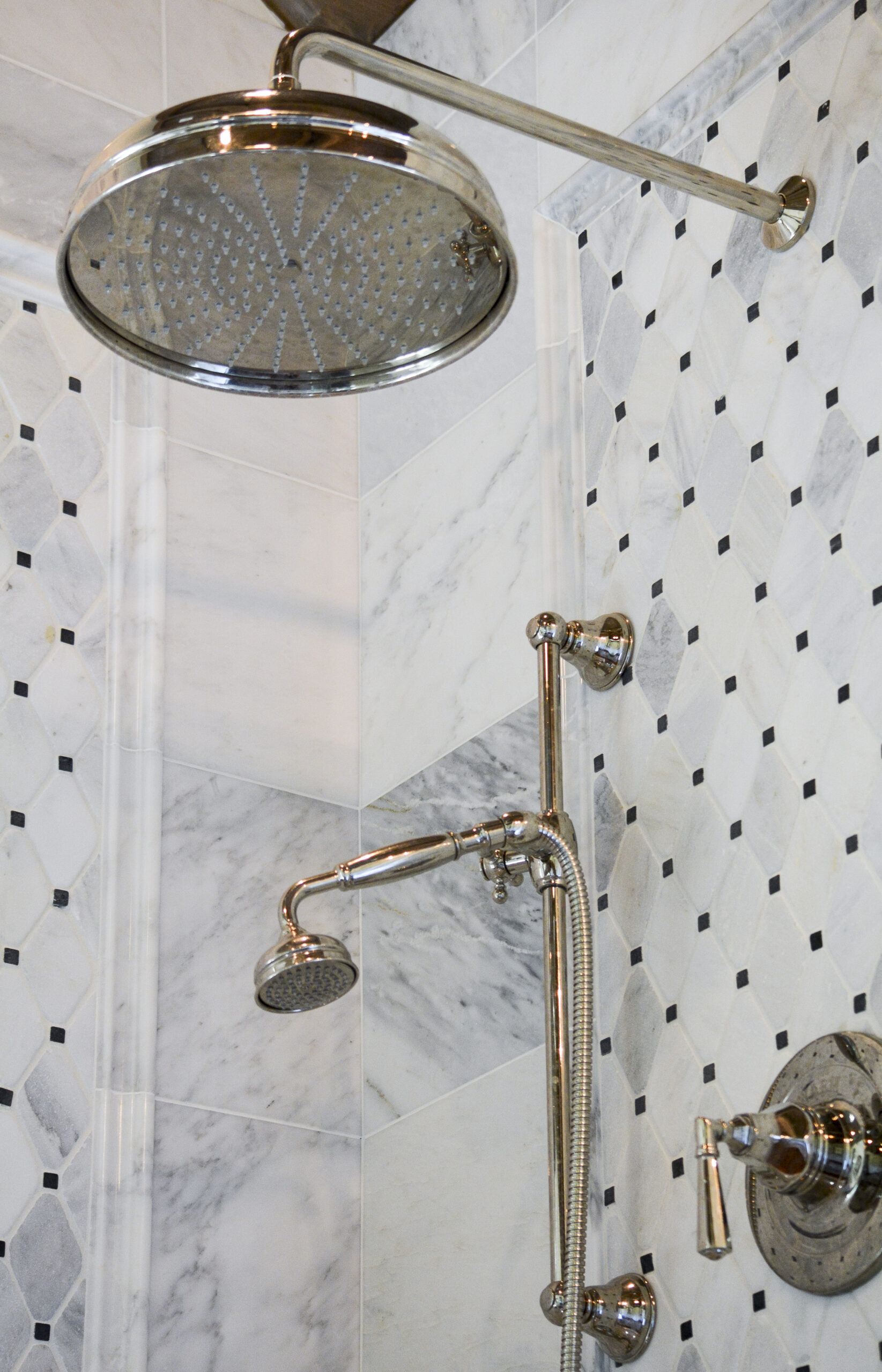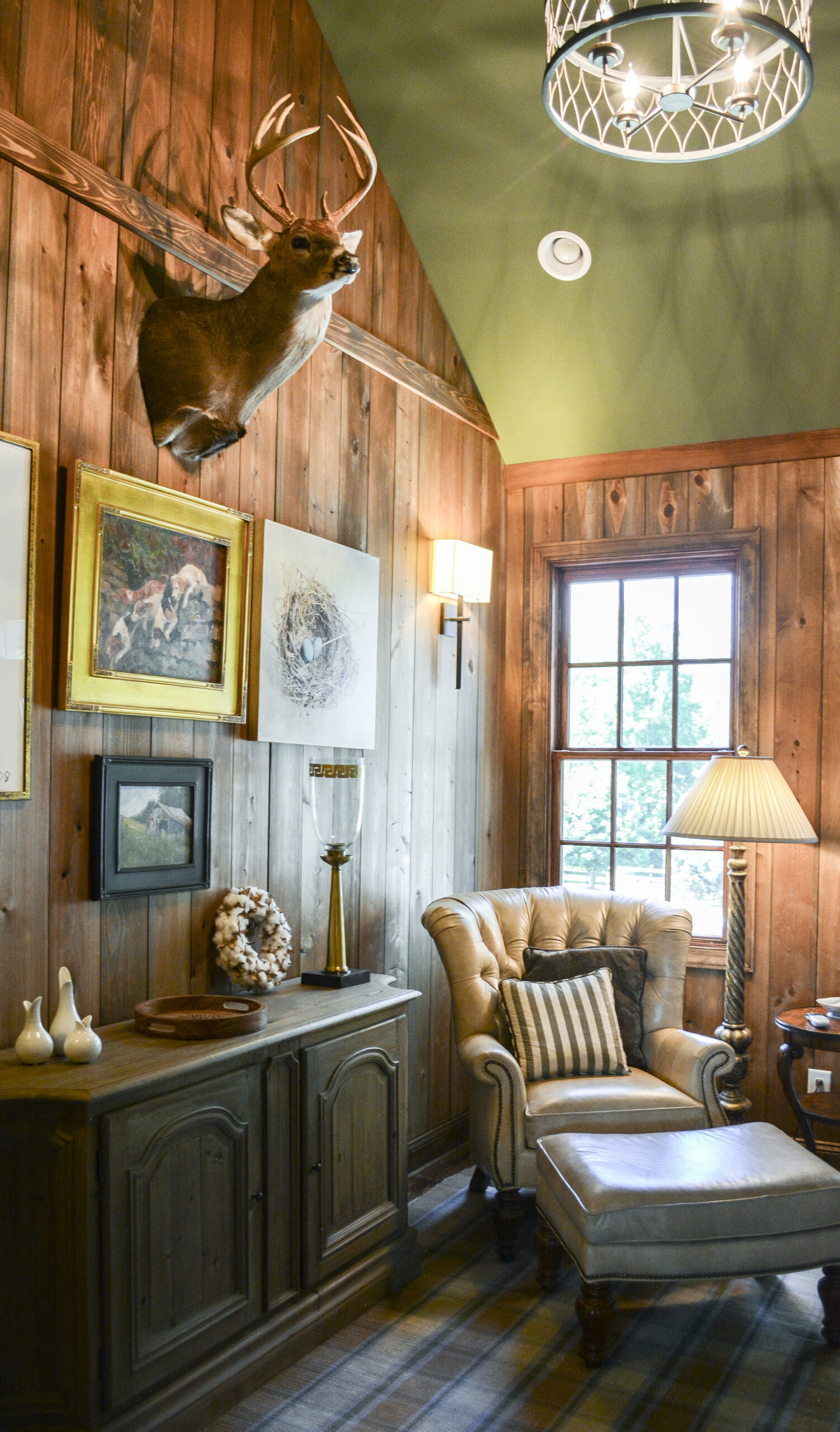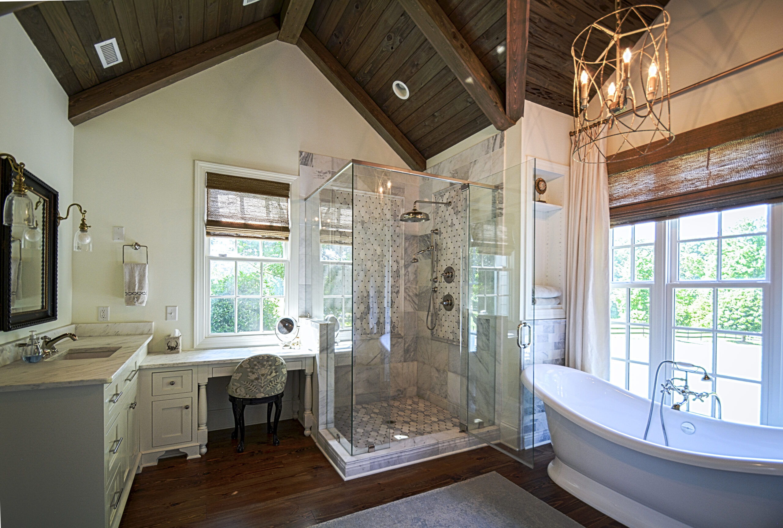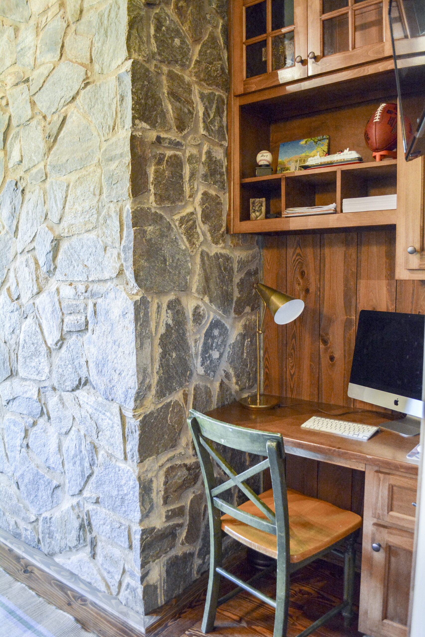 A custom tile shower with full glass surround, separate vanities, seated make-up station, and private water closet complete the bathroom, adding the style, drama, and additional space desired by the owners. A private study with direct access to the new bathroom completes the addition and creates a lodge-like lounge accentuated by a soaring stone fireplace.