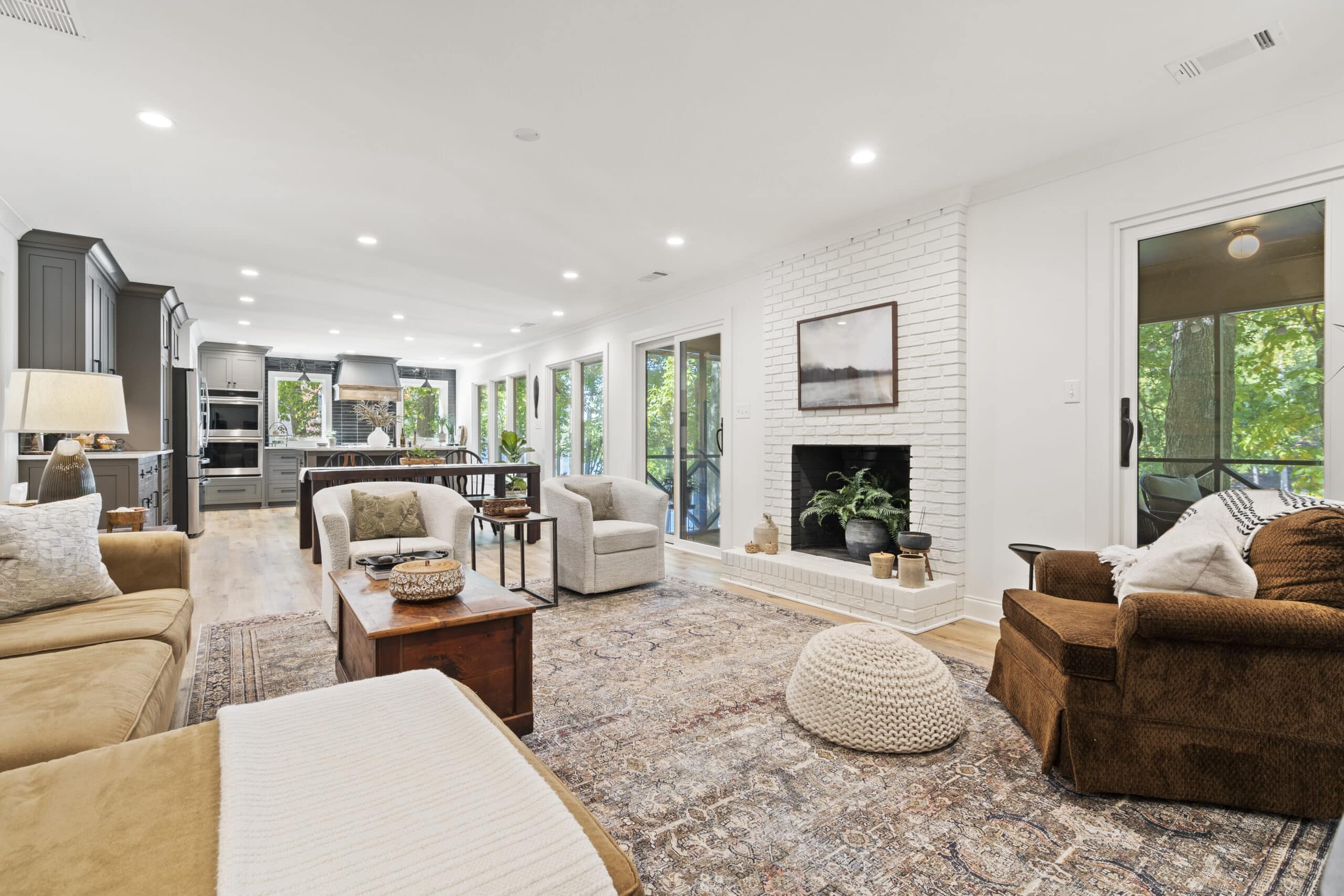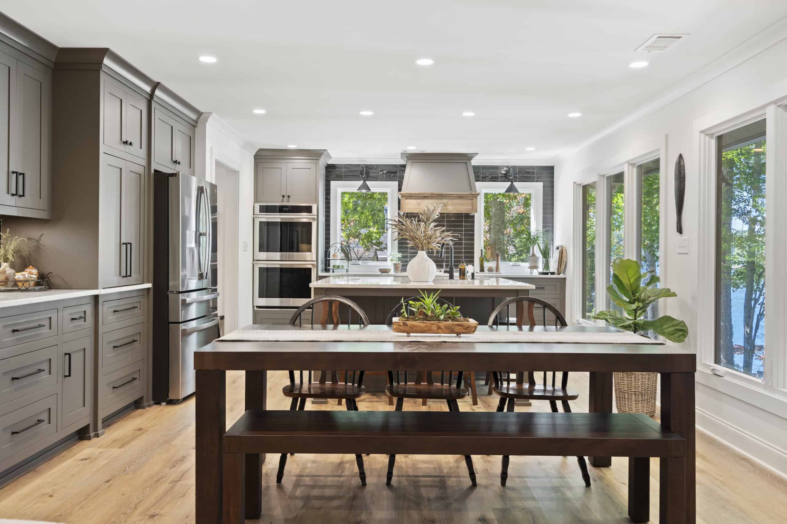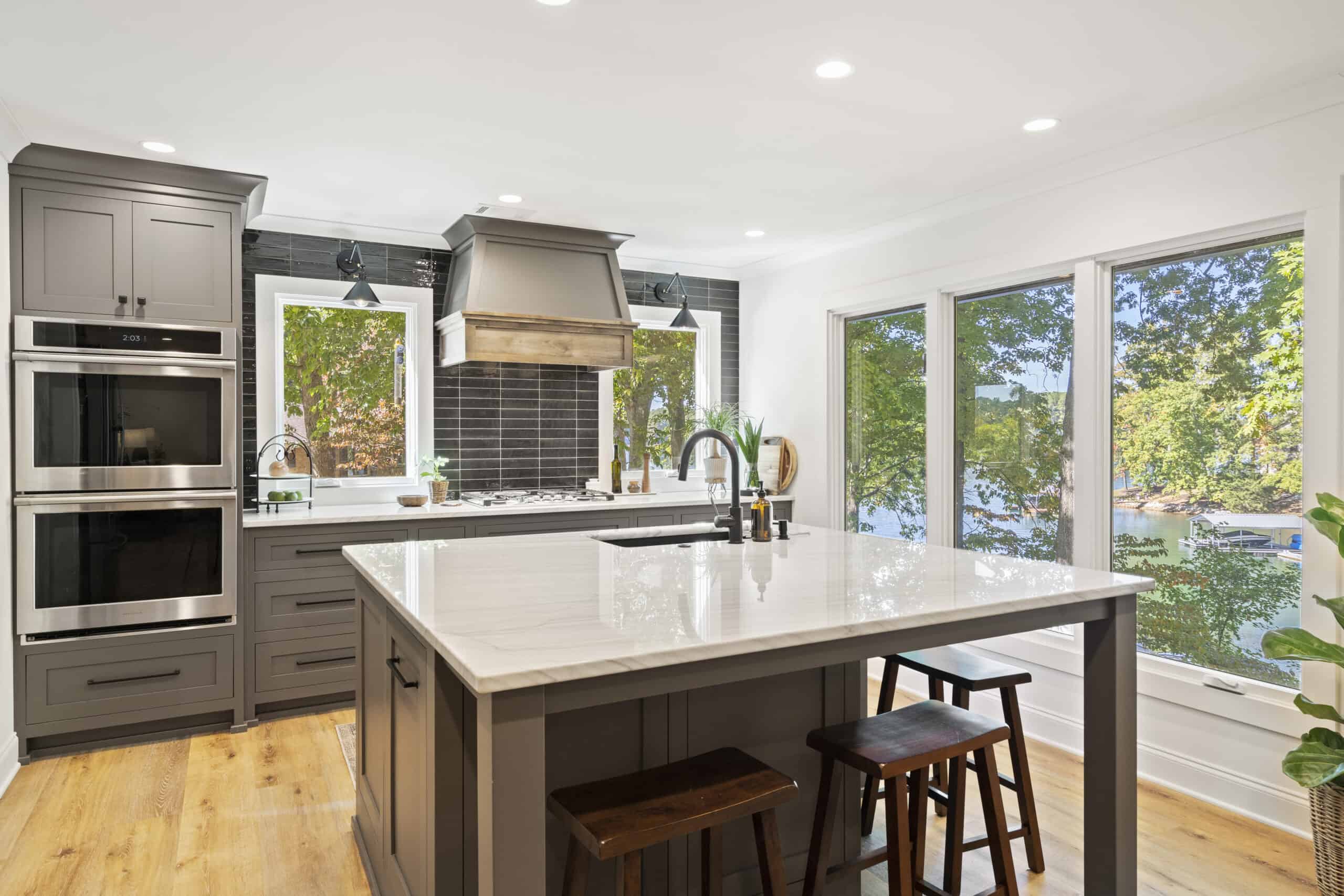 The main-level kitchen required a complete rework. The existing space awkwardly overlooked the front yard and was separated from the living spaces. It was too small, too cramped, and quite unattractive. I moved the location of the kitchen to align it with the living and dining space, creating a large open-concept plan with expansive views to Lake Hartwell.