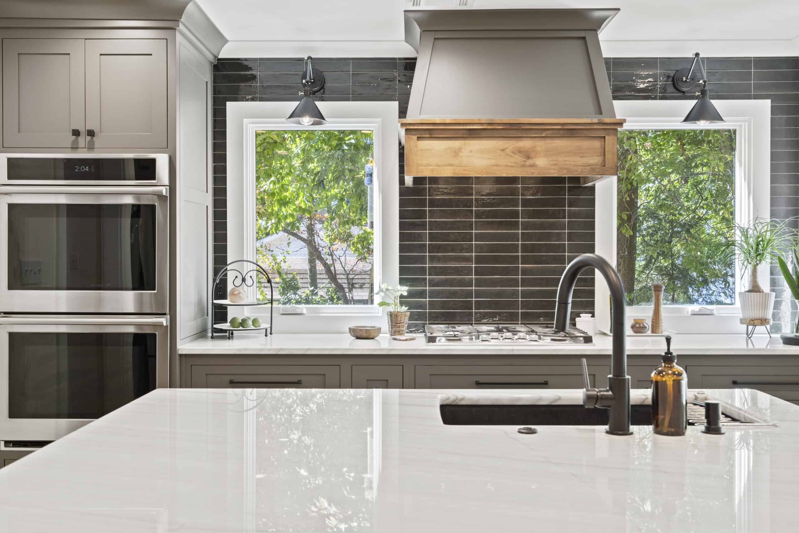 The kitchen is L-shaped with the cooktop centered on the exterior wall beyond a central island. I added symmetrical windows to either side of the cooktop and hood to give balance to the primary view of the space. Double wall ovens provide plenty of baking space for large gatherings and offer easy-to-reach, ergonomically friendly access to the oven cavity.