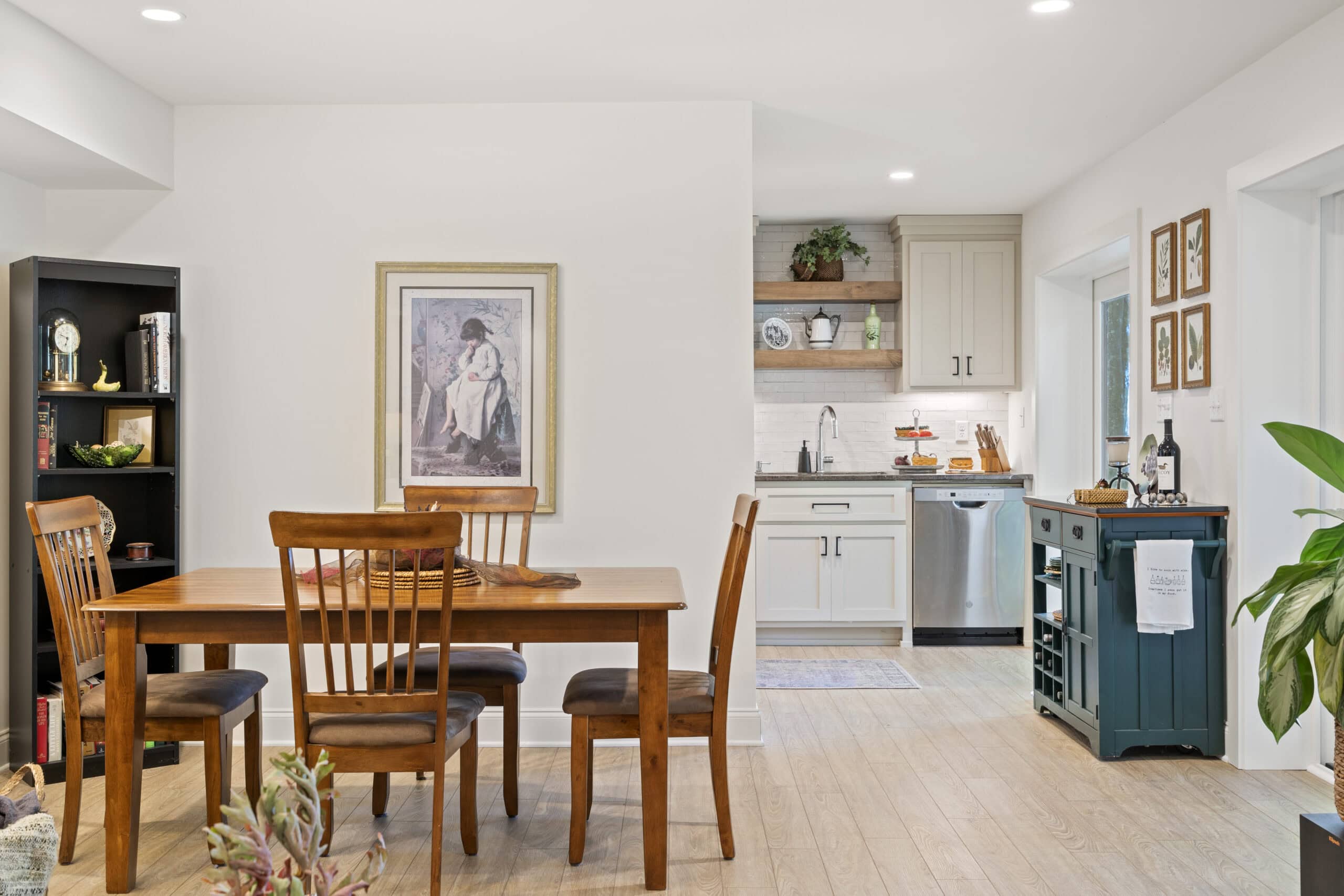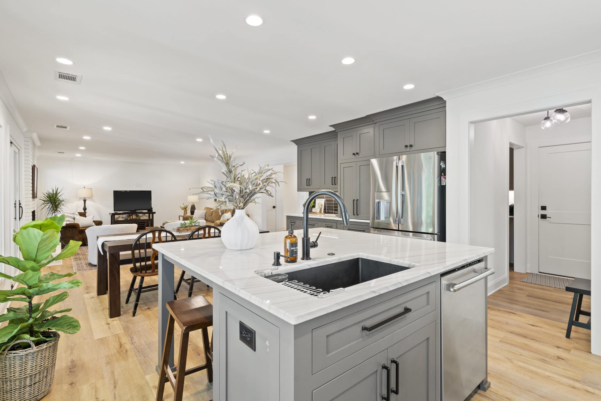 The island aligns with the casual dining table and is centered about the cooktop and hood beyond. The sink and dishwasher are located in the island along with a waste-bin pull-out, under-counter storage, and seating for two.