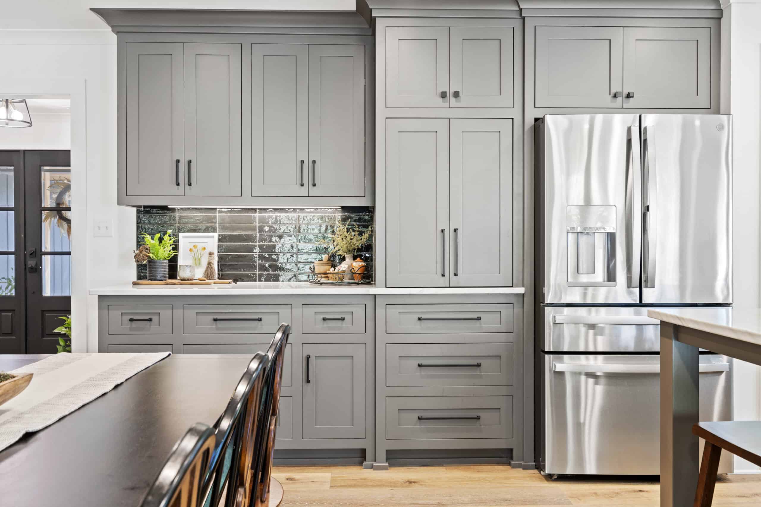 The side wall houses the counter-depth stainless-steel refrigerator with a hidden coffee station discreetly placed behind hinged cabinet doors that open and pocket into the cabinet sides. Additional cabinet and counter space along this wall allow for flexible use and additional prep space.