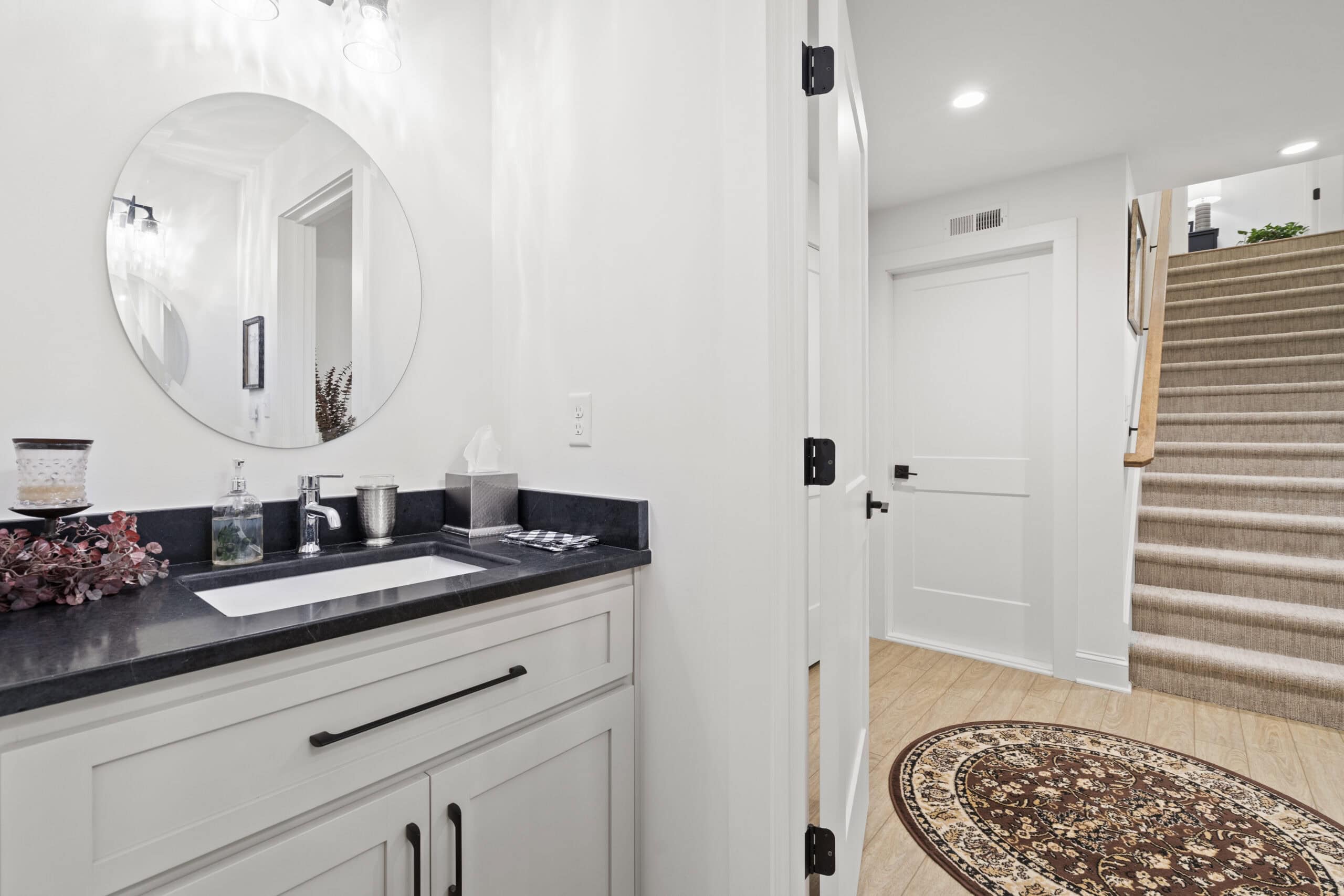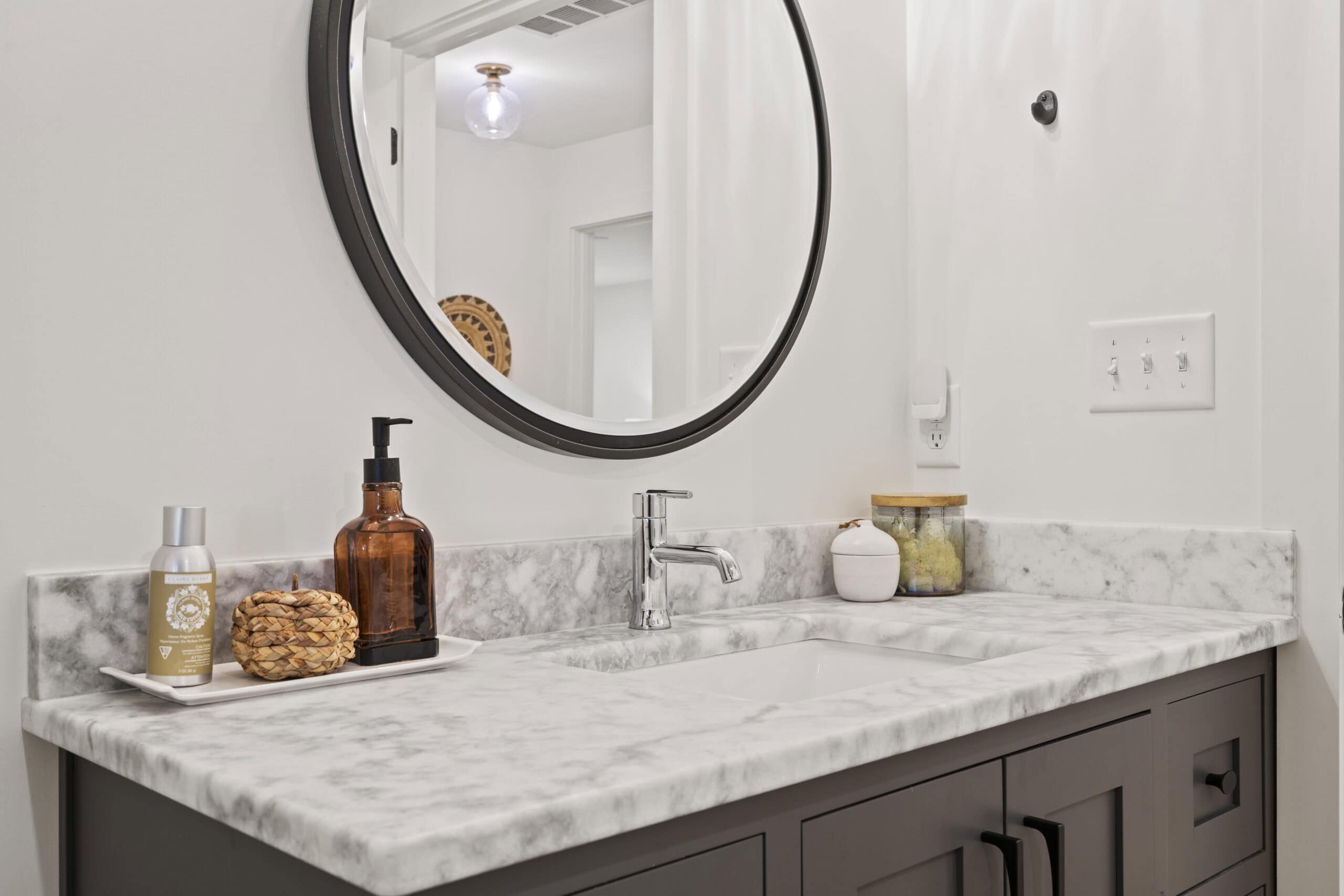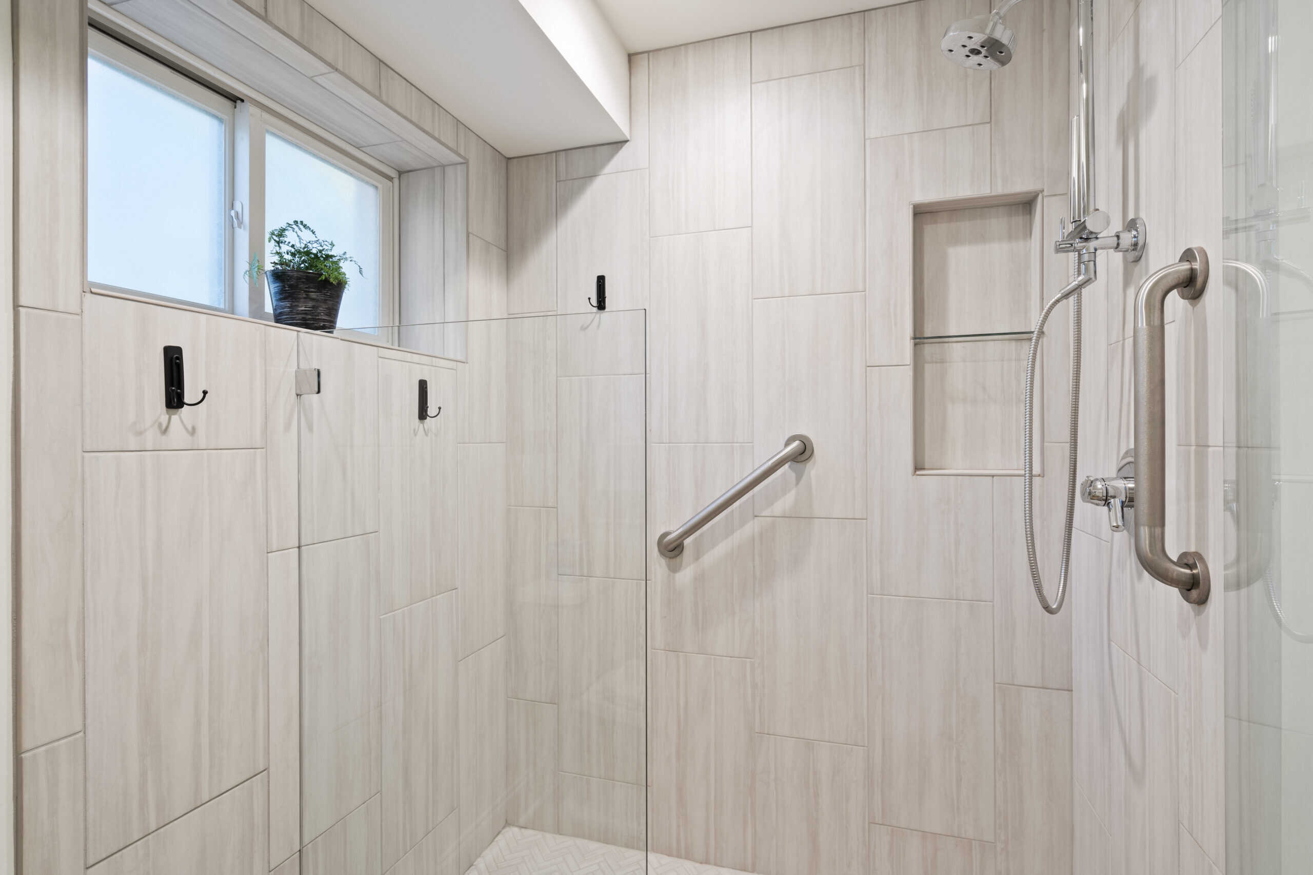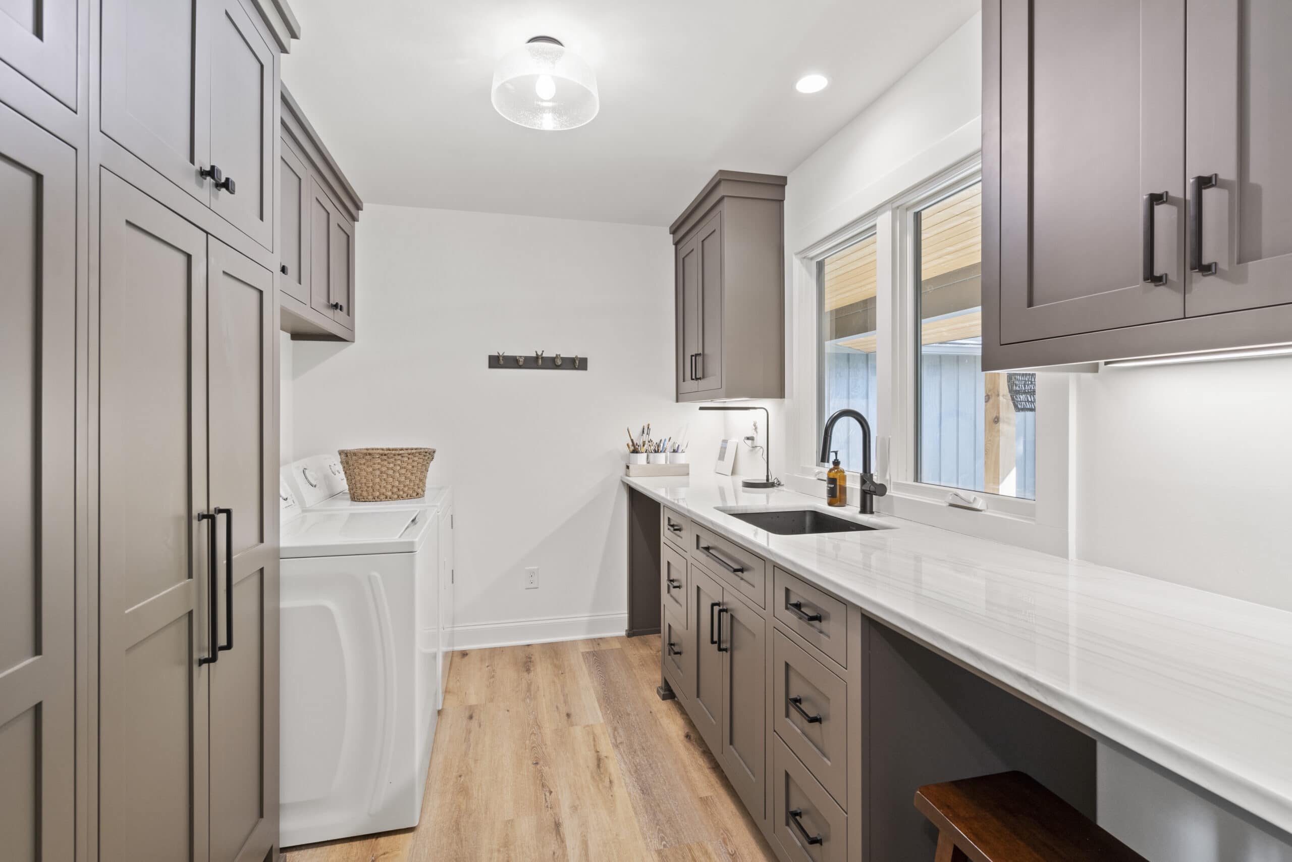A large new laundry room was added to the space where the kitchen had once lived and a pantry closet was created adjacent to the new kitchen. Views to the lake were maximized and earthy warm gray tones were used on the cabinets and tilework. White quartz tops with fluid veining provide the perfect contrast to the darker tone grays and coordinate perfectly with the lighter gray island.