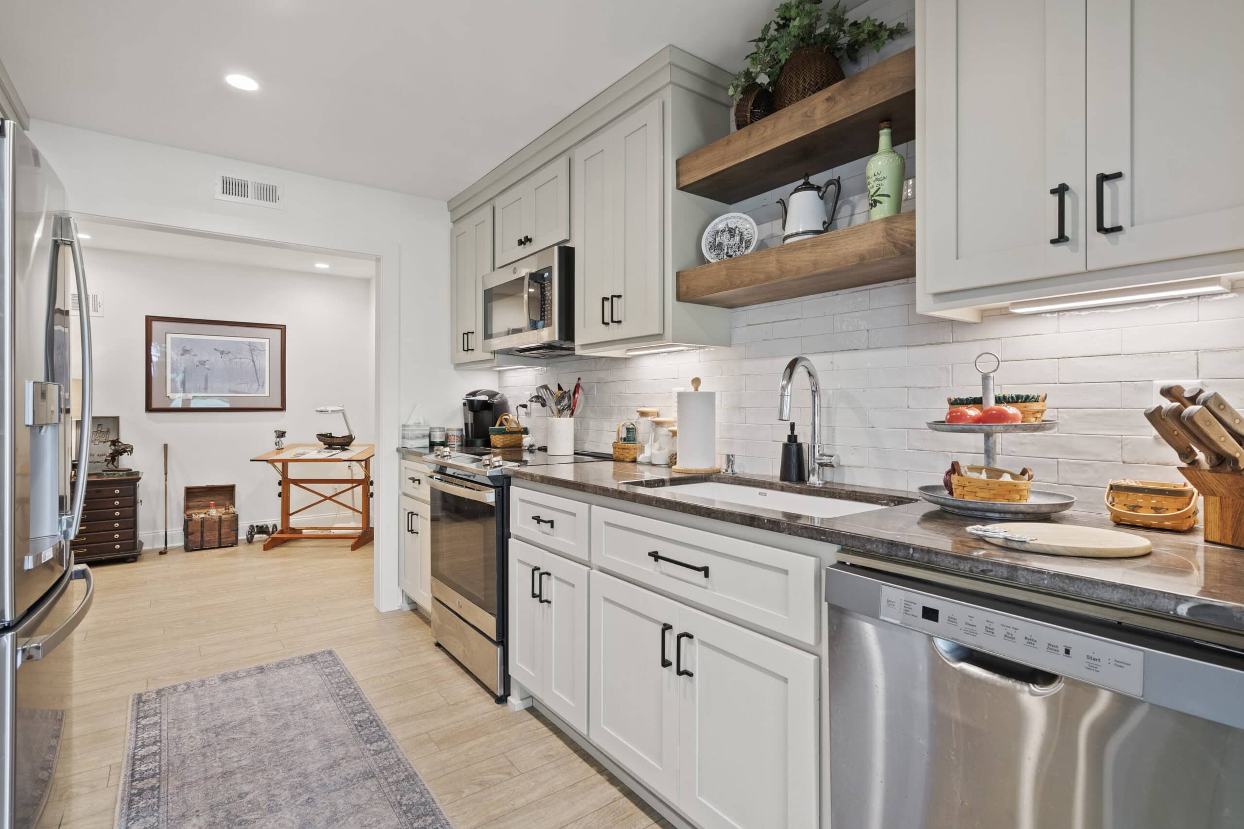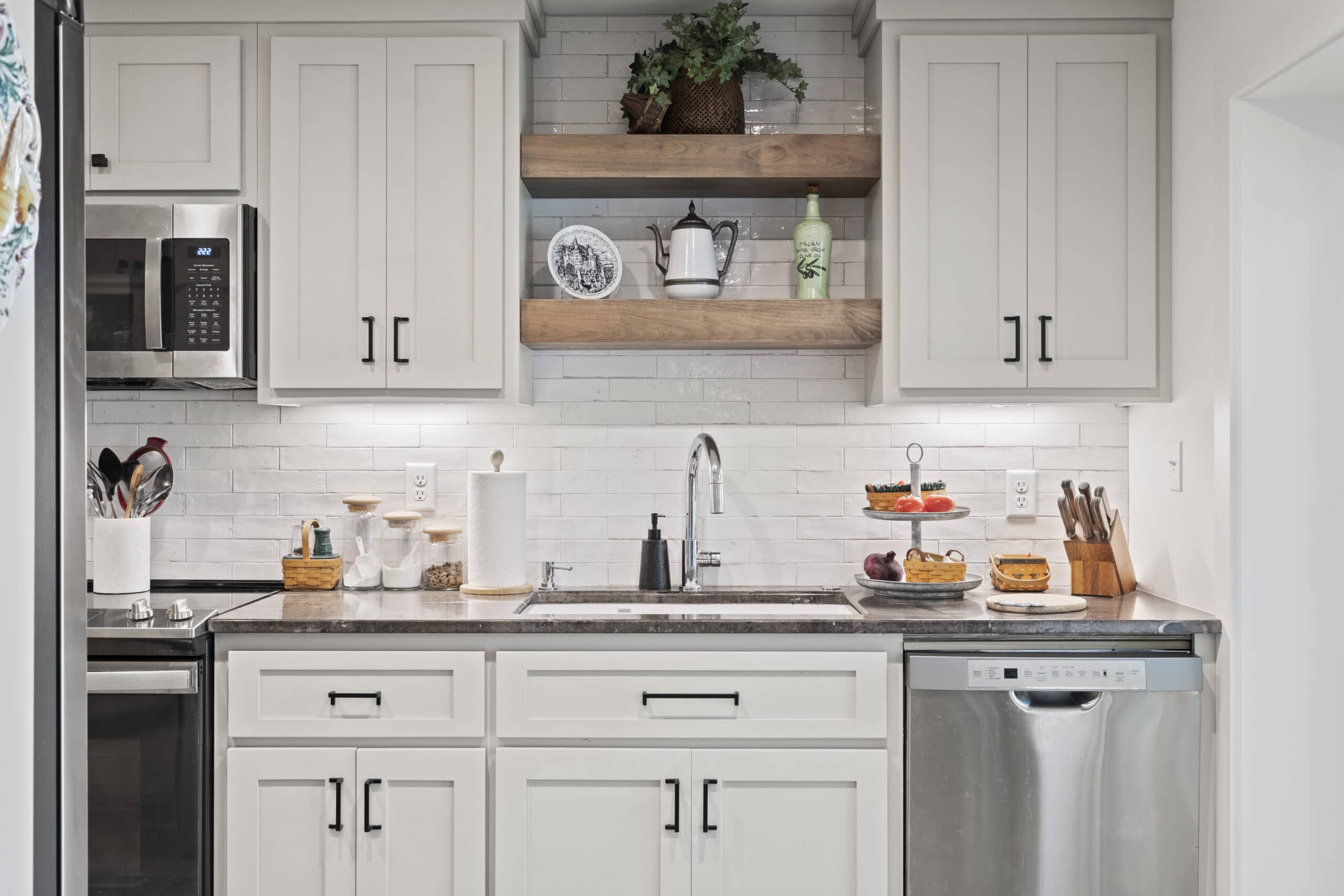 Warm white cabinets topped with deep gray-and-white-veined quartz and glossy white elongated brick-like subway tiles accented with deep oak floating shelves make the modest kitchen feel inviting and welcoming. Storage and surfaces have been carefully planned to provide the most function possible.