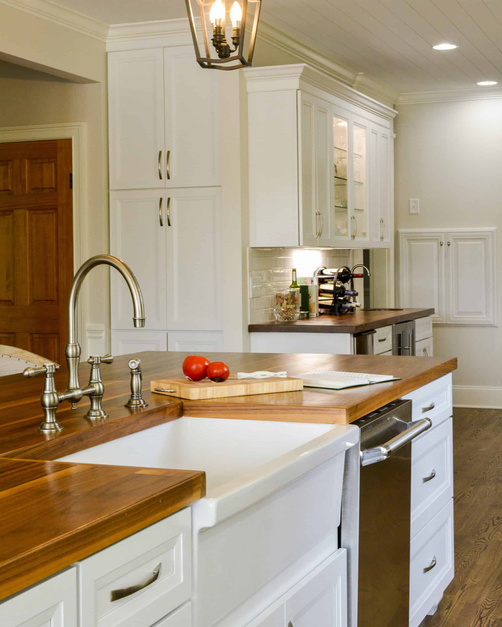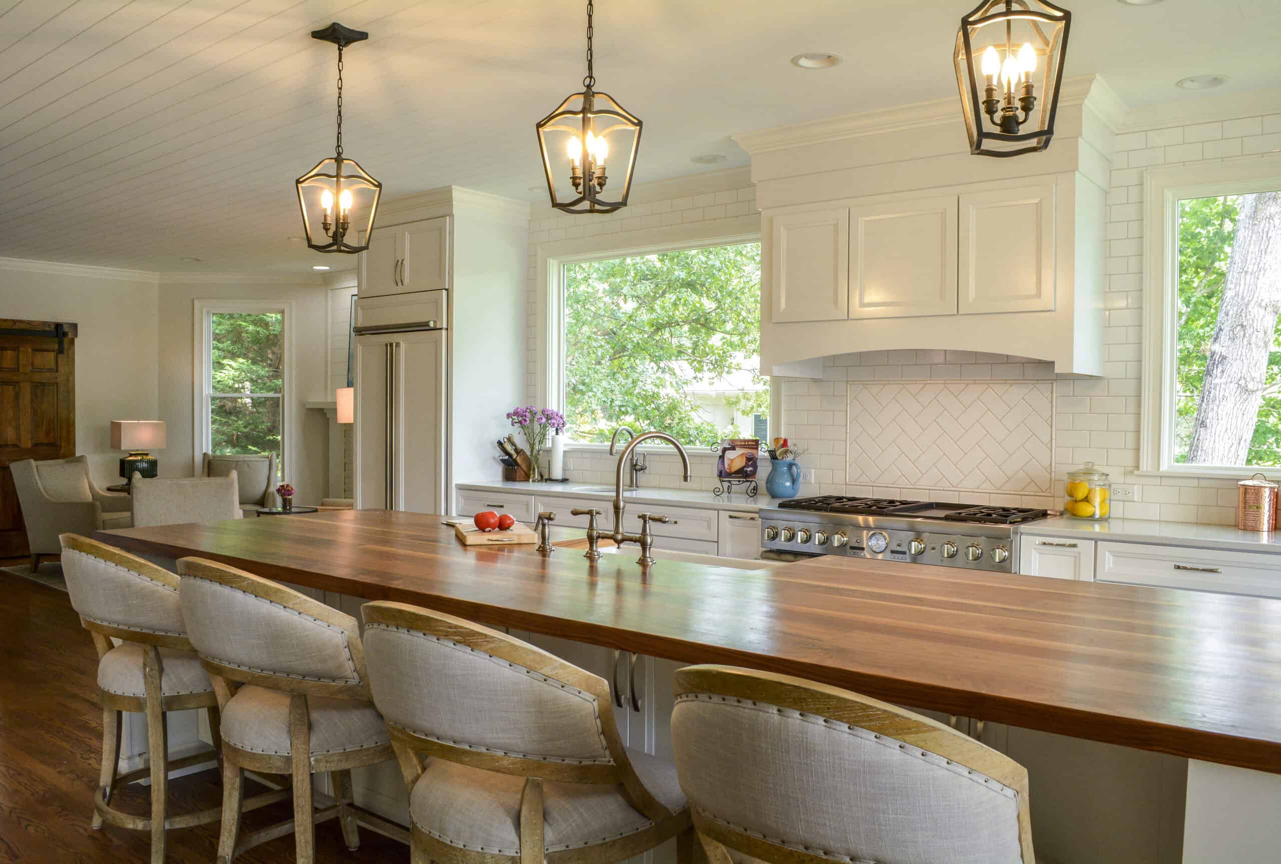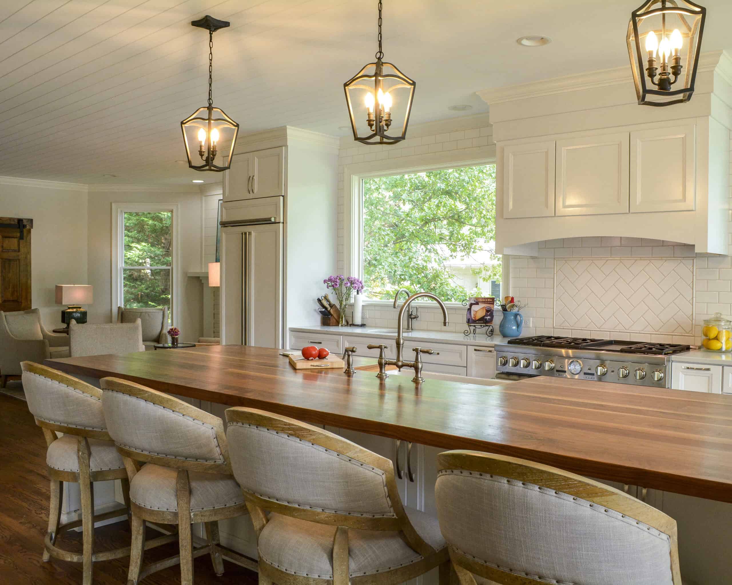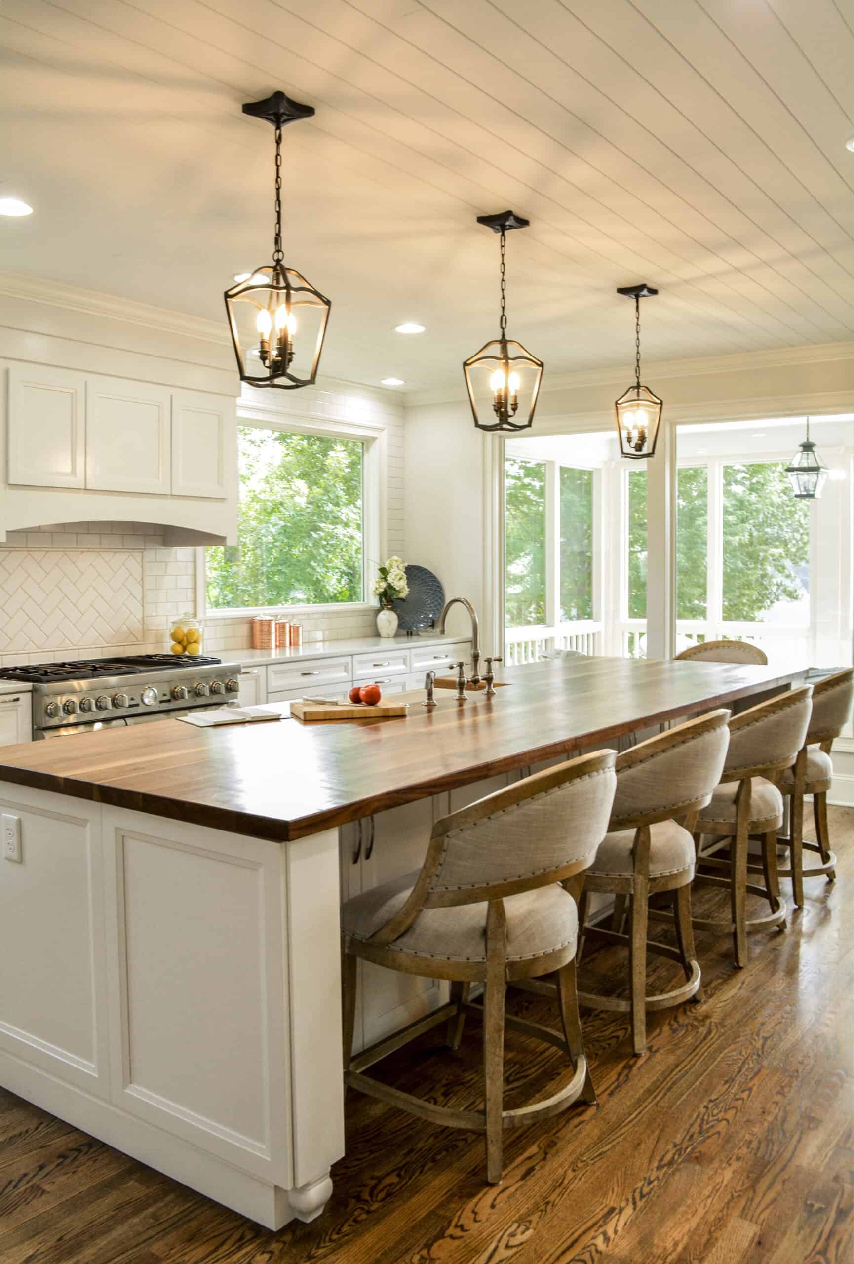 The oversized island repeats the classic paneling and is topped with a warm, inviting wide plank butcherblock countertop. The wood top works perfectly for the nearly 12-foot-long island, which would require a seam if it had a stone countertop. Large, comfortable counter-height bar stools with upholstered seats and backs provide ample space to cozy up to this island for a meal or an intimate conversation.