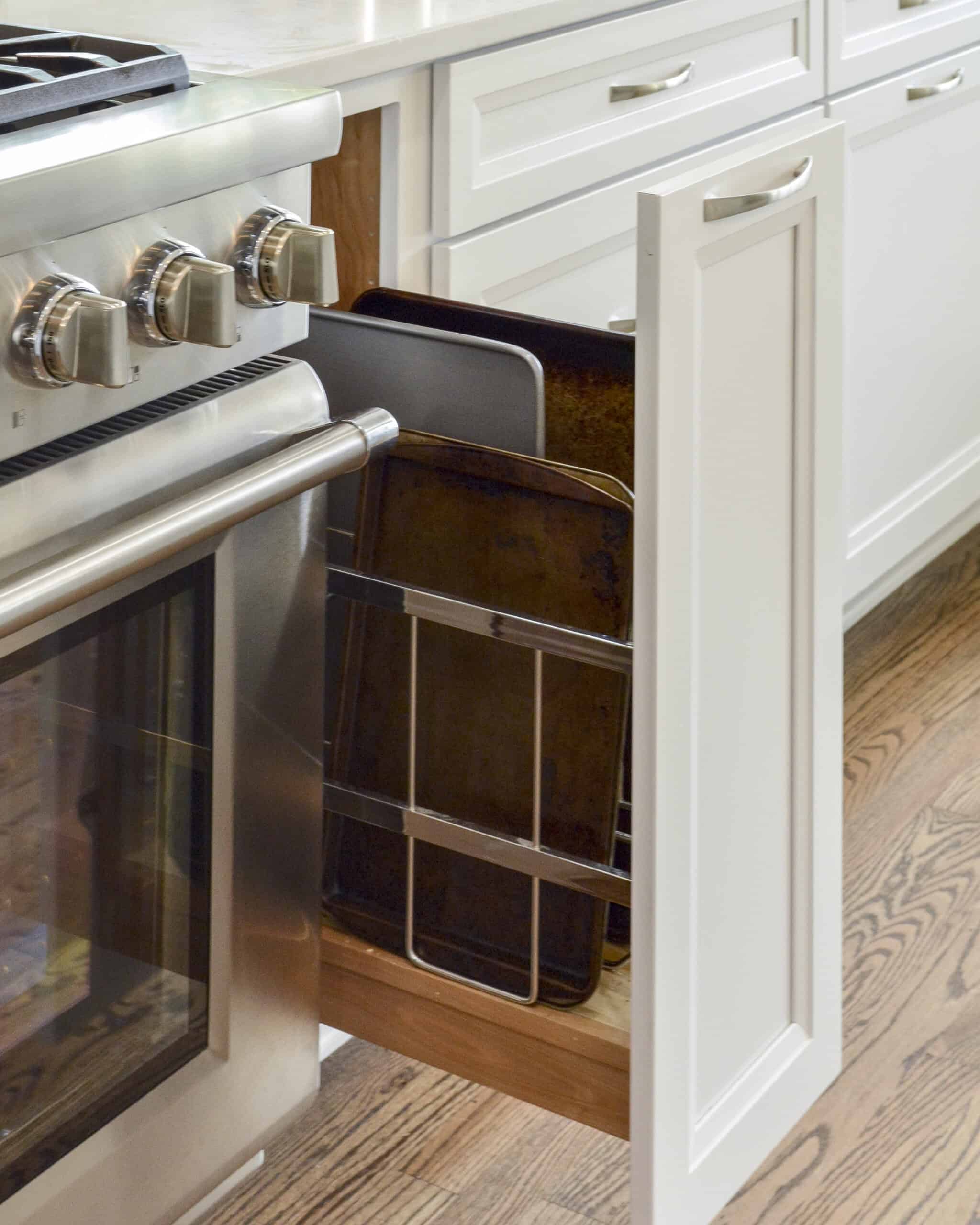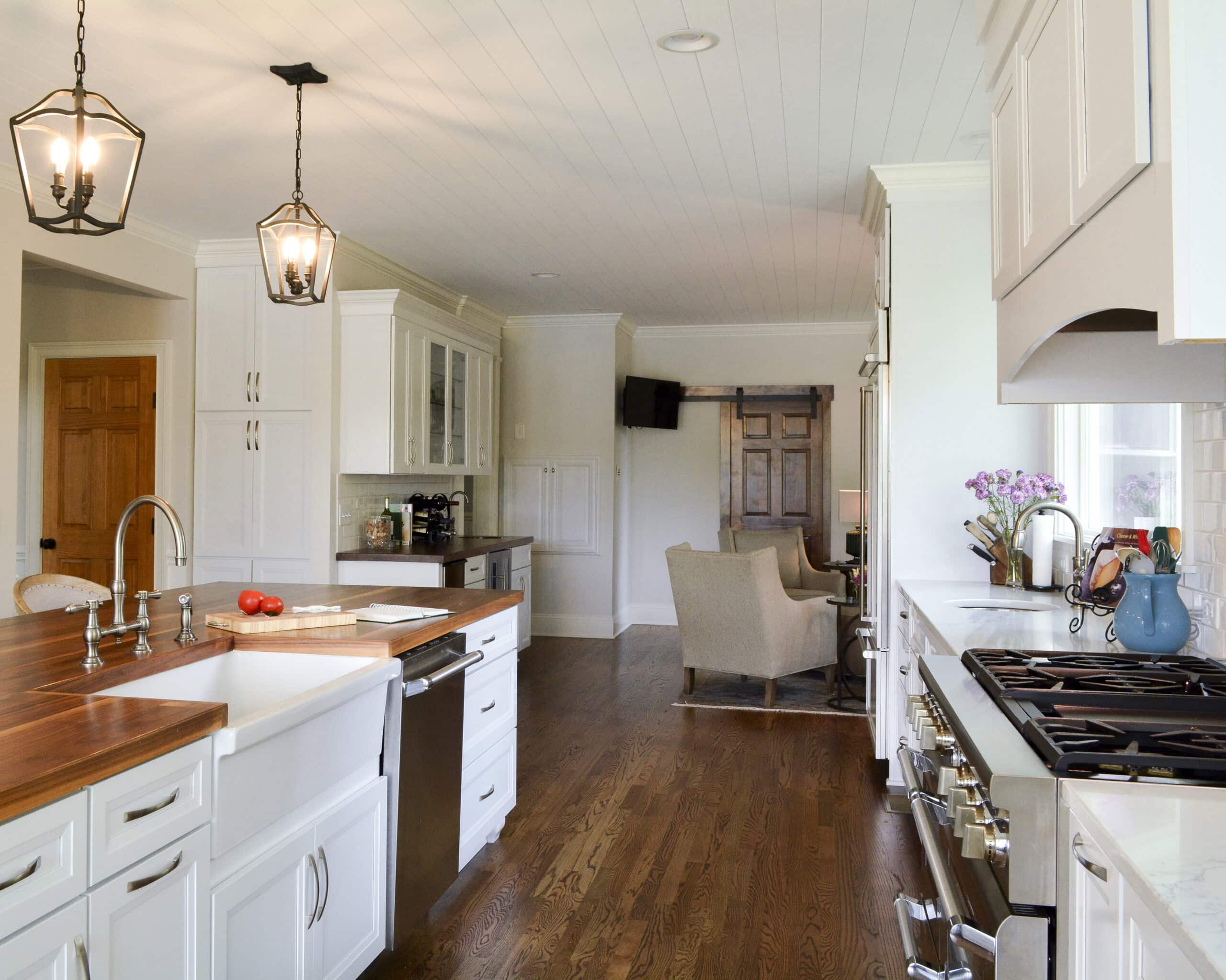 Quartz countertops with delicate gray veining top the base cabinets filled with creative storage solutions including a deep pull-out for cooking sheets and trays, deep drawers for pots and pans, spice pull-outs, and utensil drawers. Double waste bins are conveniently located in tall pull-outs near the white porcelain farm sink. Lantern pendants cast soft glows of light upon the smooth, matte waxed wood counters.