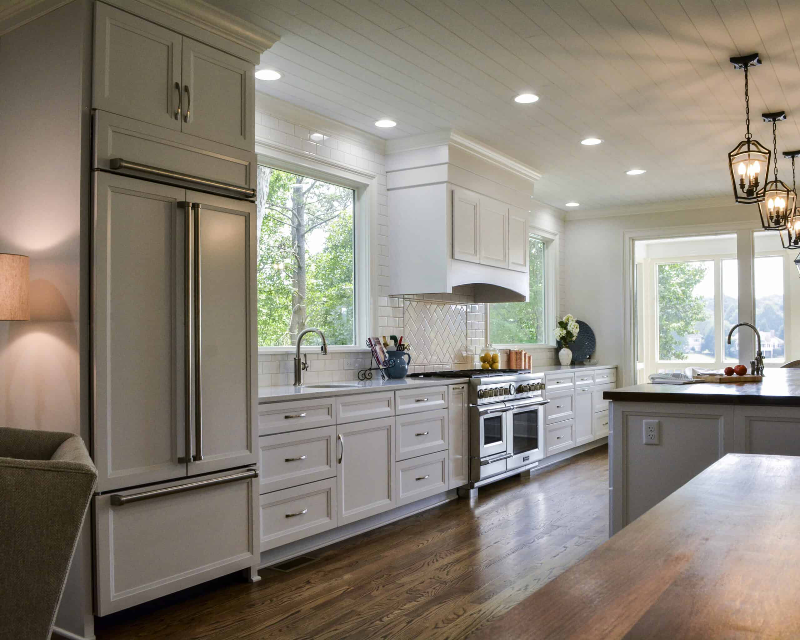 This Lake Keowee kitchen renovation involved enlarging the existing kitchen and relocating it to take full advantage of the scenic lake views. We transformed an existing screen porch into interior square footage and added a new screen porch. This expanded footprint allowed me to move the kitchen to the rear of the house where it would overlook the majestic lake views below and create a better connection between the living room and kitchen.