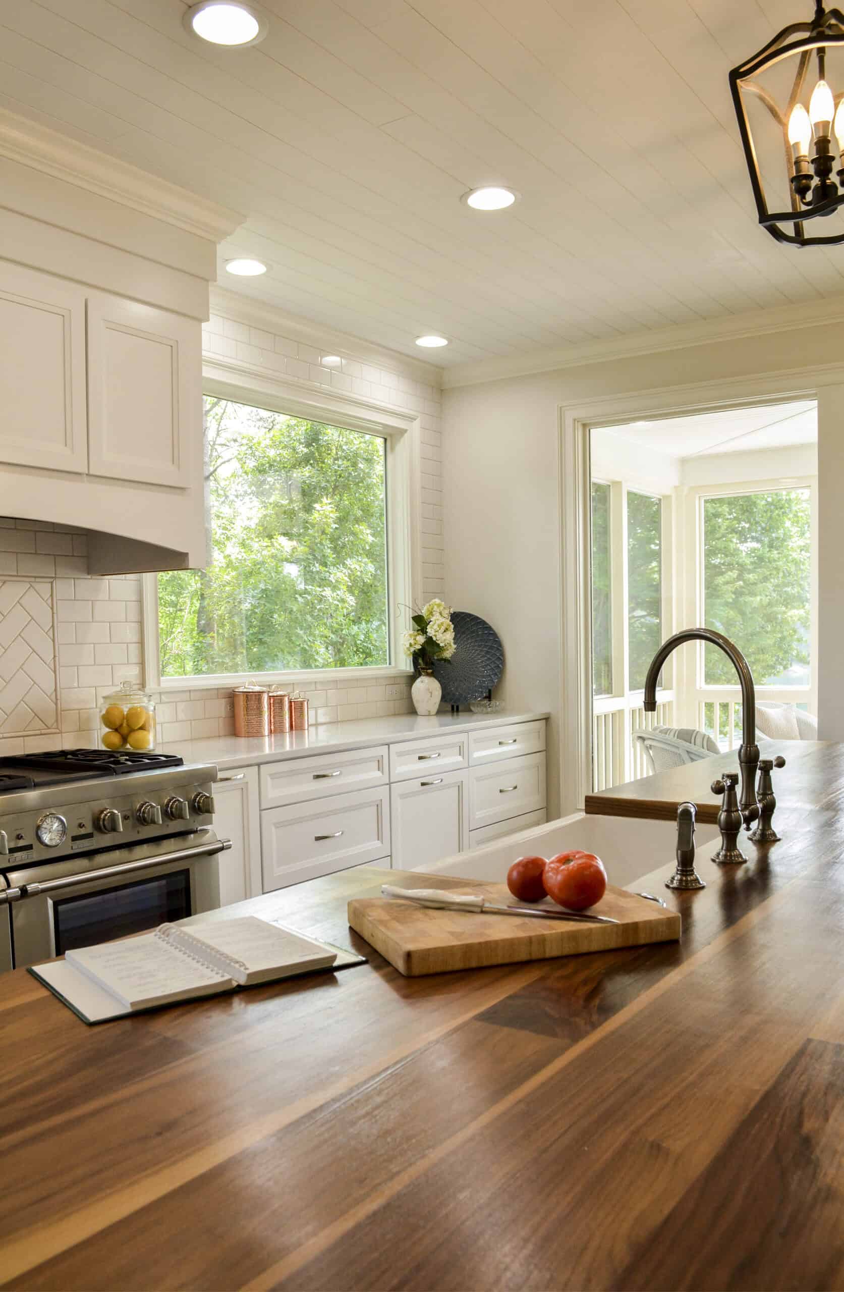 The kitchen is washed in daylight from the expansive glass windows and doors that frame the beautiful views beyond. Spring, summer, and fall often bring with them open doors and refreshing breezes that fill the kitchen with fresh air.