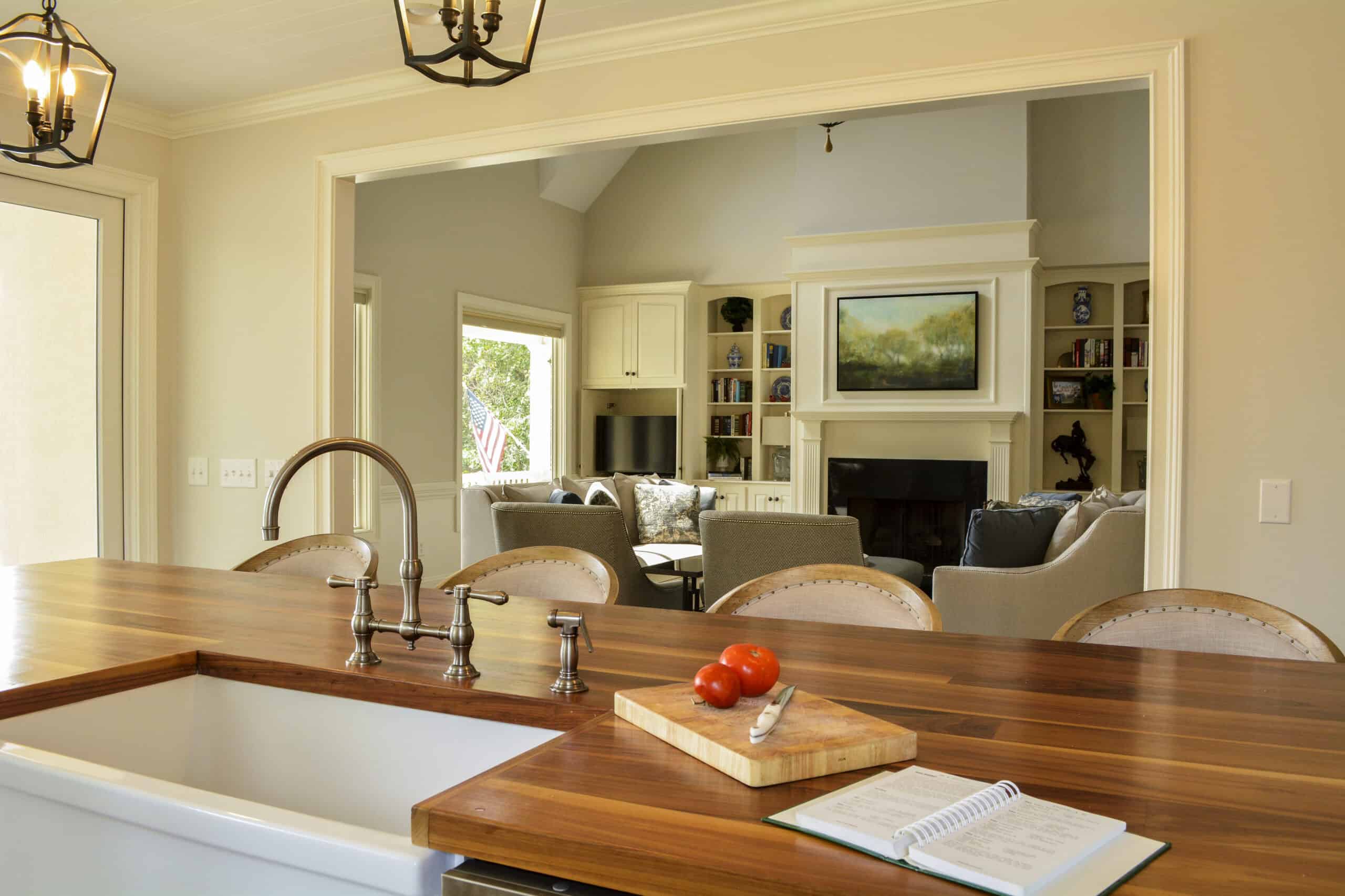 The new design allows the client to entertain more easily, cook and prep without interruption, and enjoy views of the lake from all points within the redesigned room. Pulling the kitchen out of an interior location and opening it up to the living room makes all the spaces feel larger and more connected. Improved function combined with classic colors, finishes, and details common to the existing home leave no hints that the kitchen is new and has not been a part of the home from the beginning.