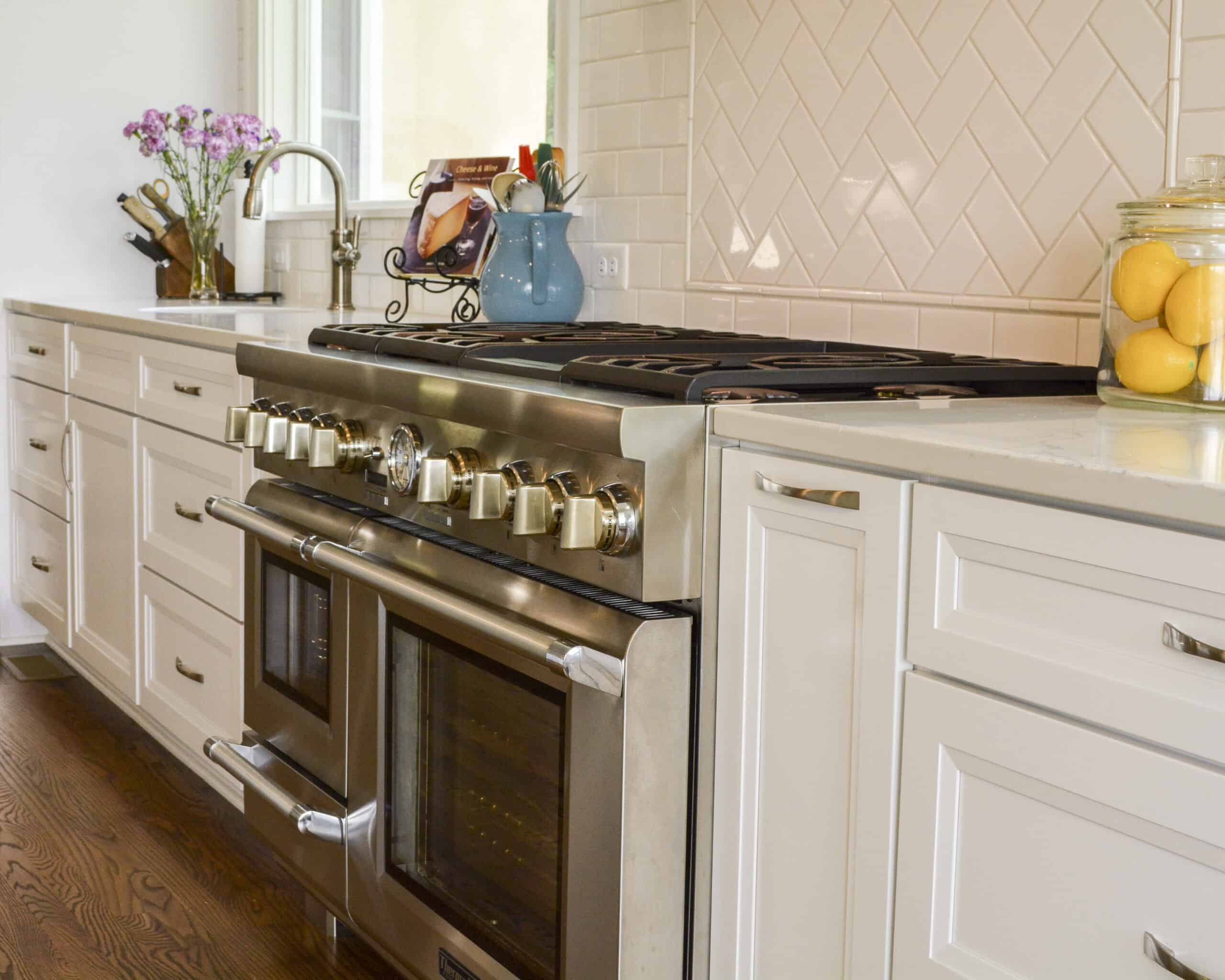 The kitchen was expanded with a long wall for the paneled built-in refrigerator and 48” professional range expertly centered between two large new picture windows. A custom hood with classic panel details makes the kitchen feel native to the home and balanced with an impressive central focal point.