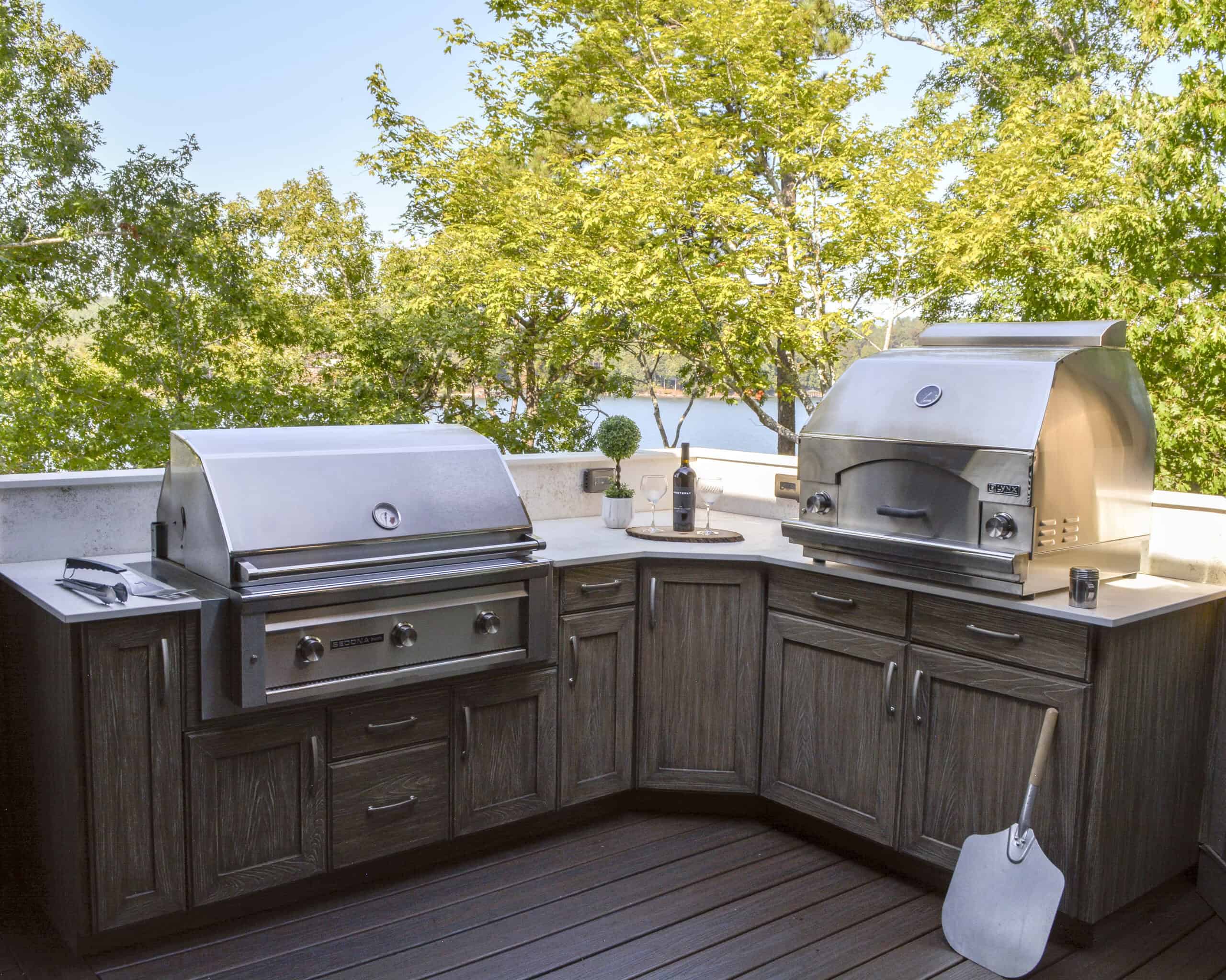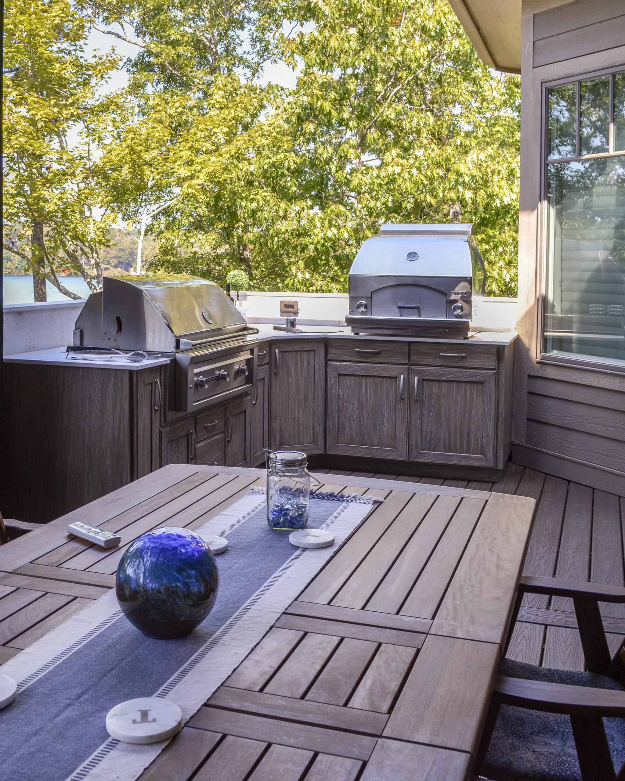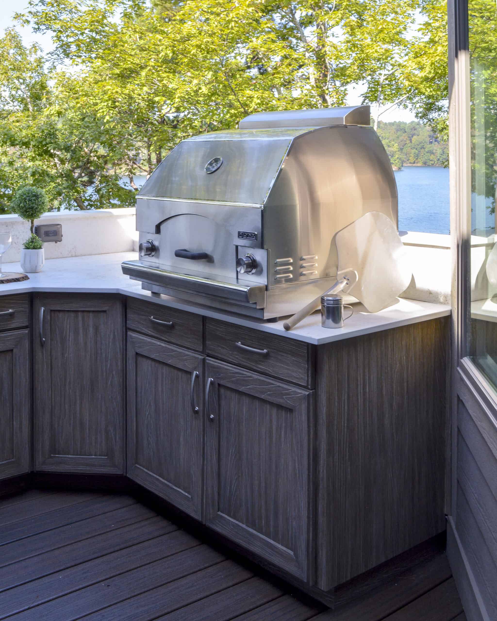 Perched high above the waters of Lake Keowee, this intimate cooking corner completes a serene outdoor living area. Designed by Kerl Design, this compact outdoor kitchen showcases the craftsmanship and thoughtful detailing that define luxury outdoor living design in South Carolina. Naturekast PVC cabinetry mimics natural wood while resisting rot, moisture, and weather for enduring beauty.