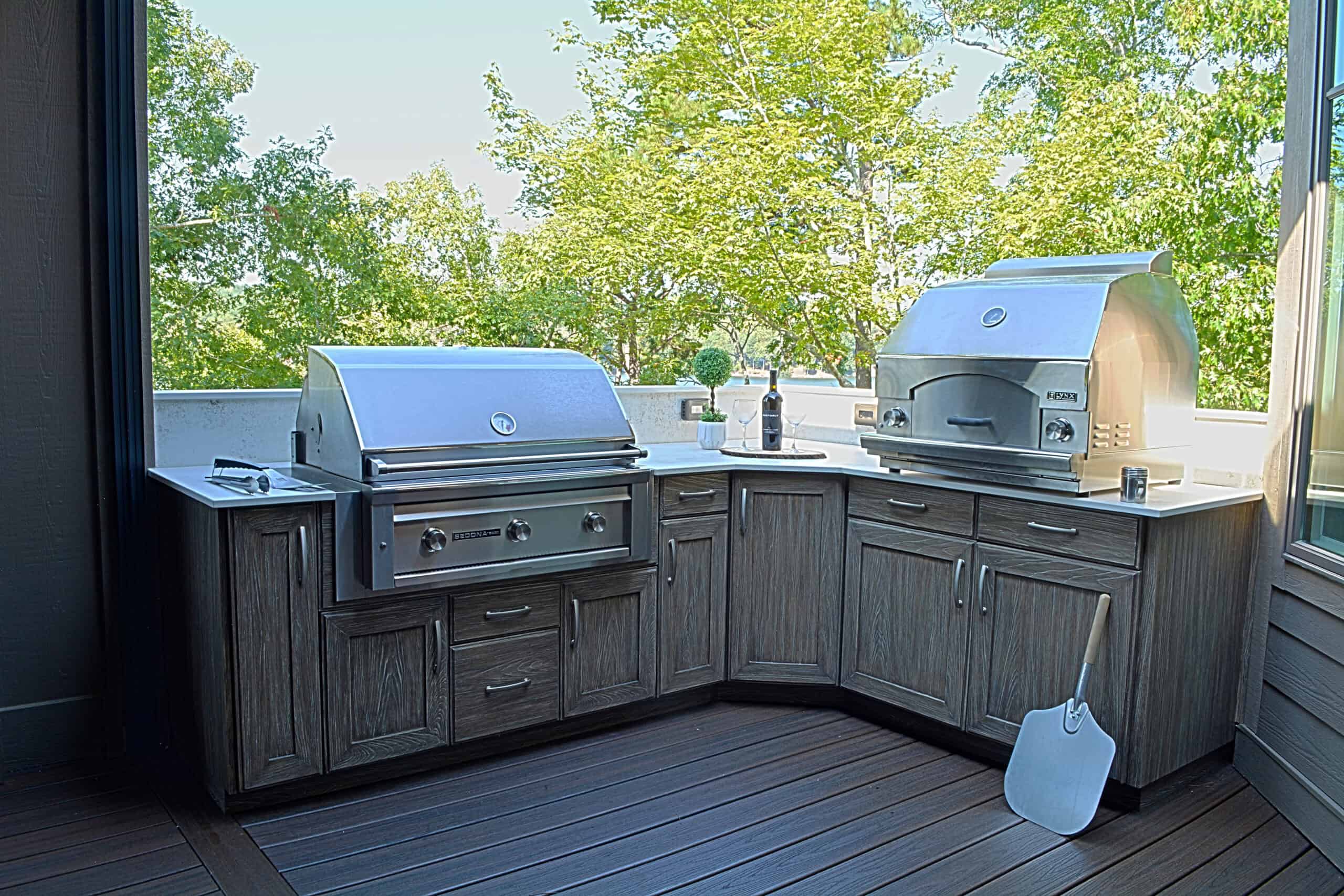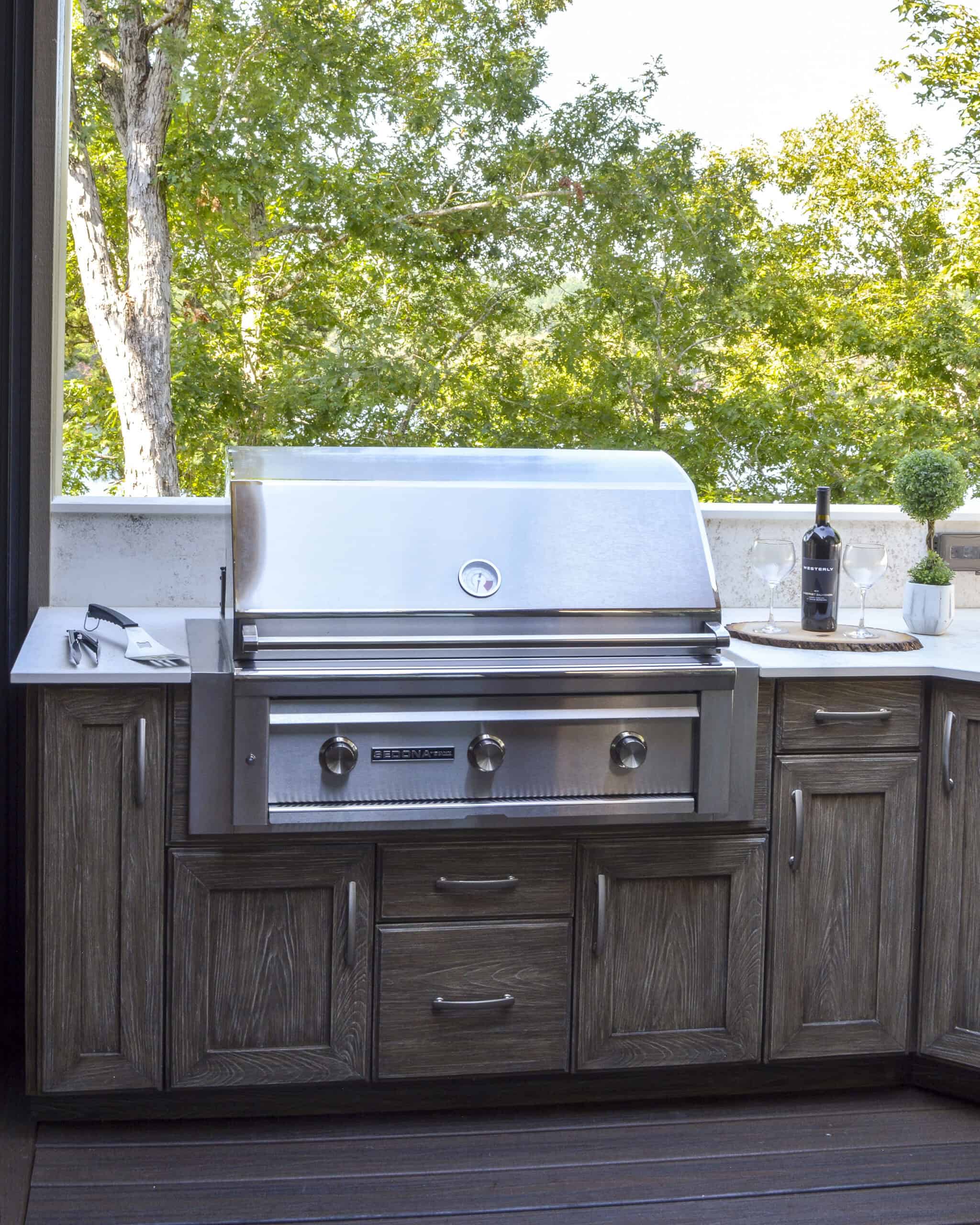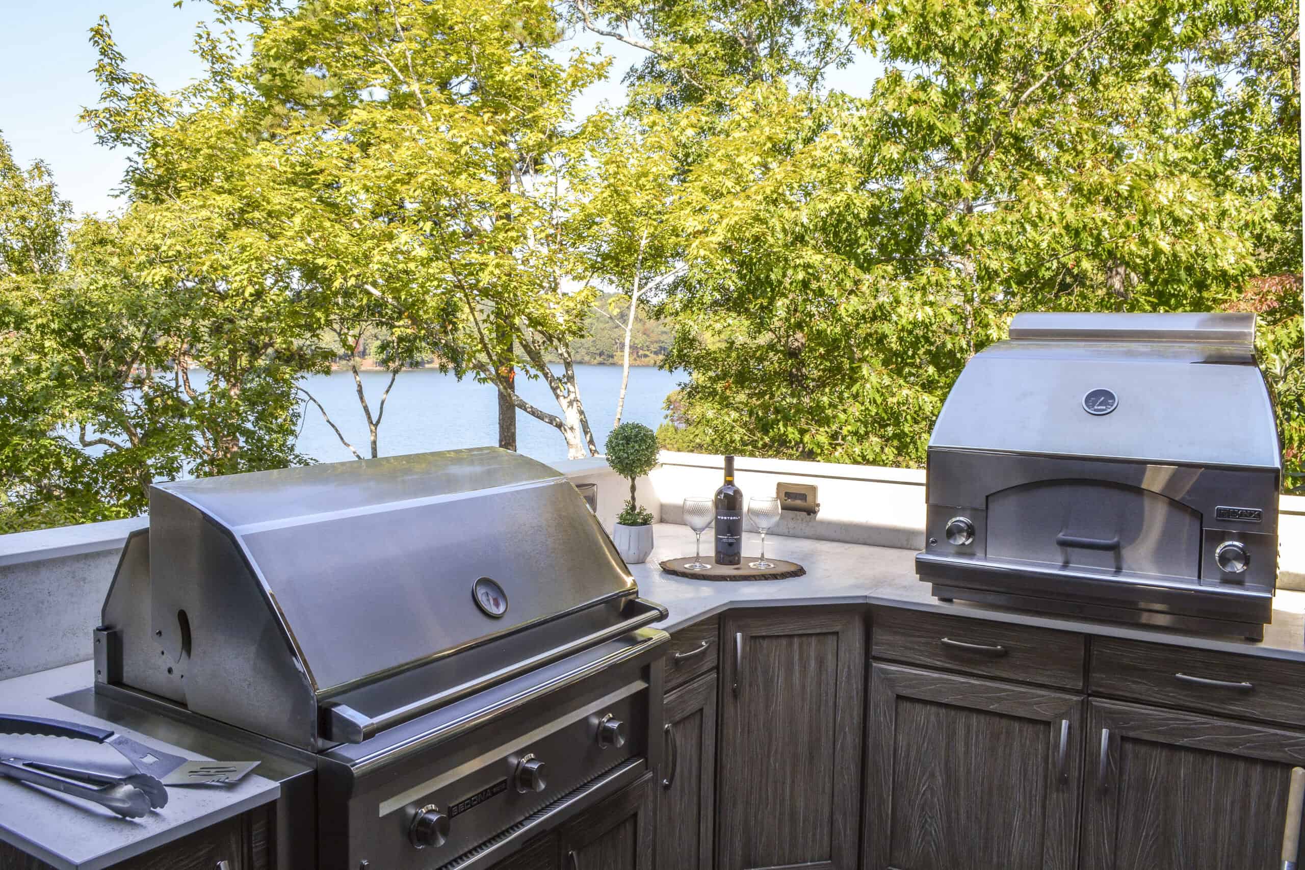 Perched high above the waters of Lake Keowee, this intimate cooking corner completes a serene outdoor living area. Designed by Kerl Design, this compact outdoor kitchen showcases the craftsmanship and thoughtful detailing that define luxury outdoor living design in South Carolina. Naturekast PVC cabinetry mimics natural wood while resisting rot, moisture, and weather for enduring beauty.