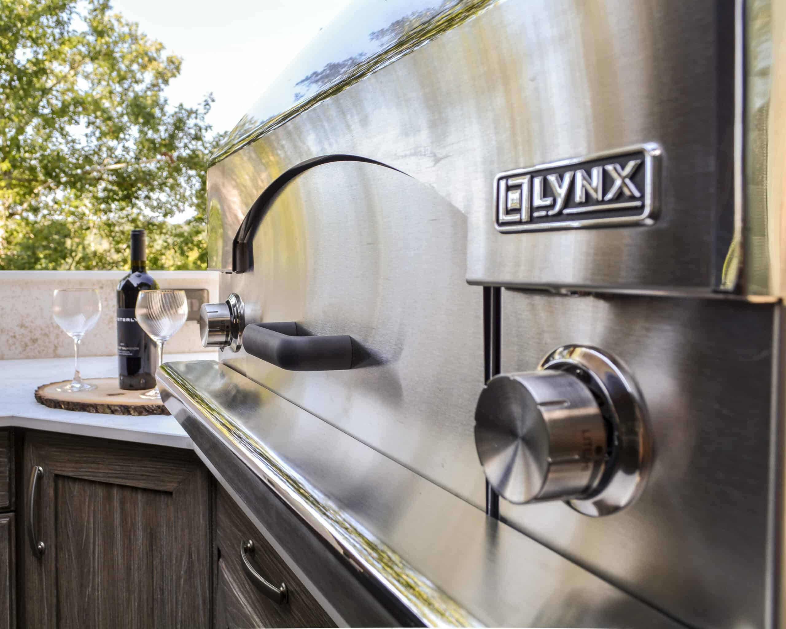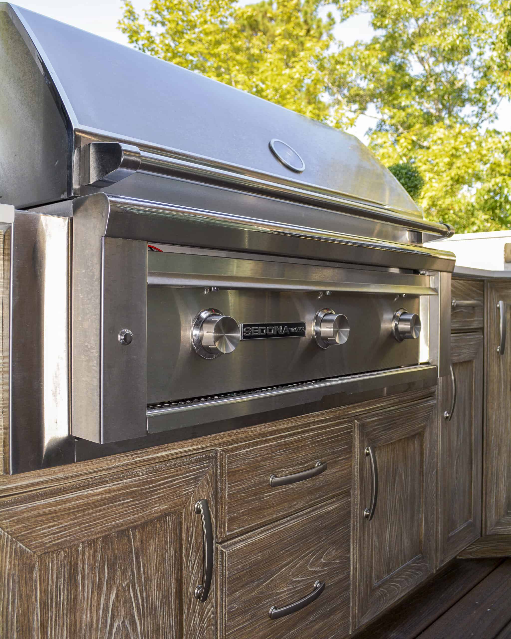A Sedona gas grill with the proper liner ensures safety and performance within the cabinetry, while a Lynx pizza oven expands the options for casual alfresco dining. It’s a corner no cook would mind being sent to—proof that exceptional outdoor kitchen design thrives even in modest footprints.