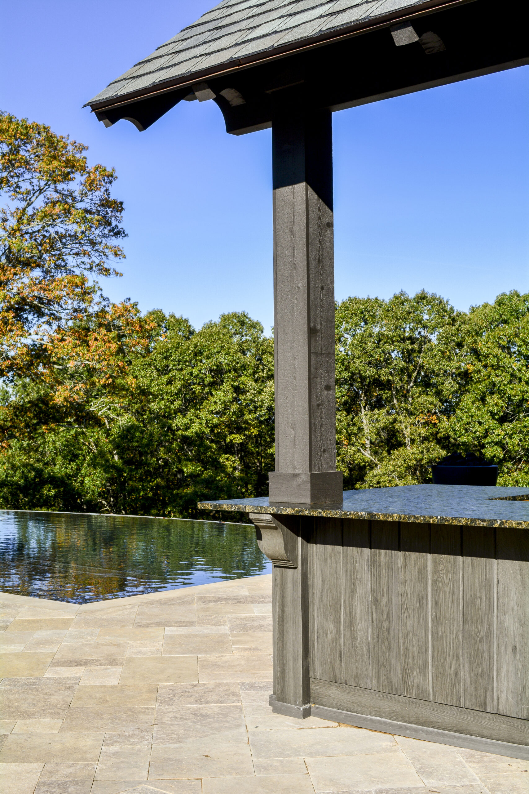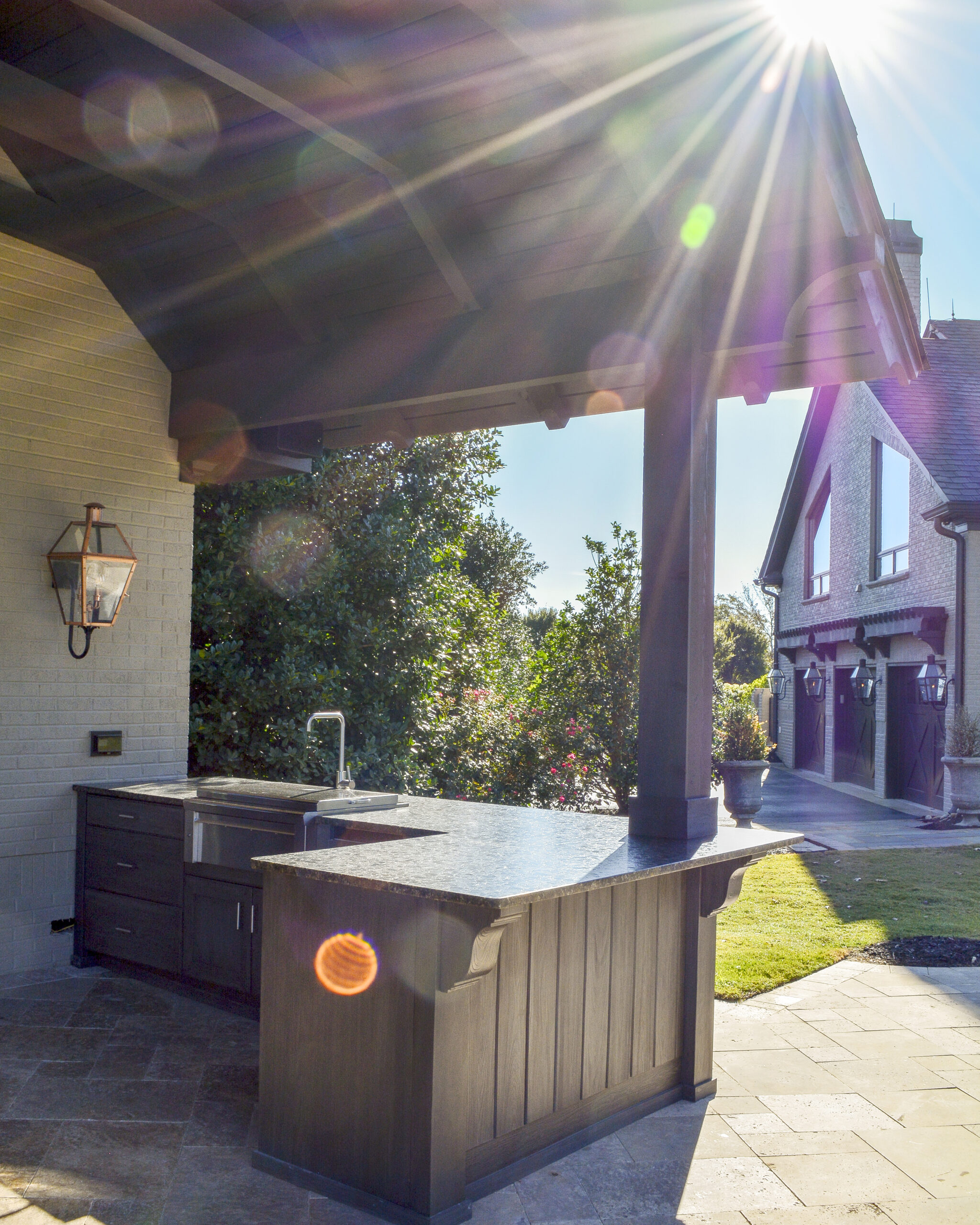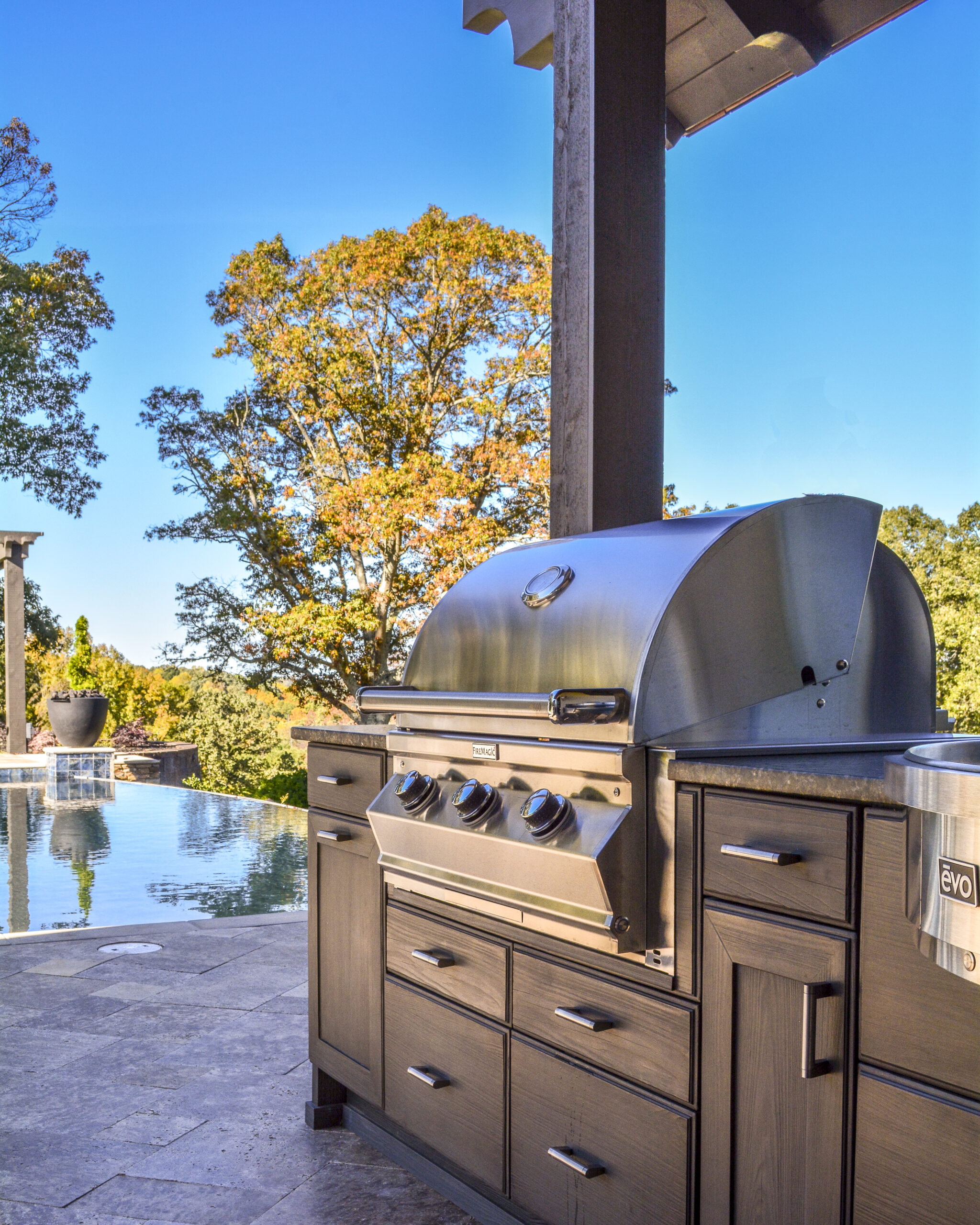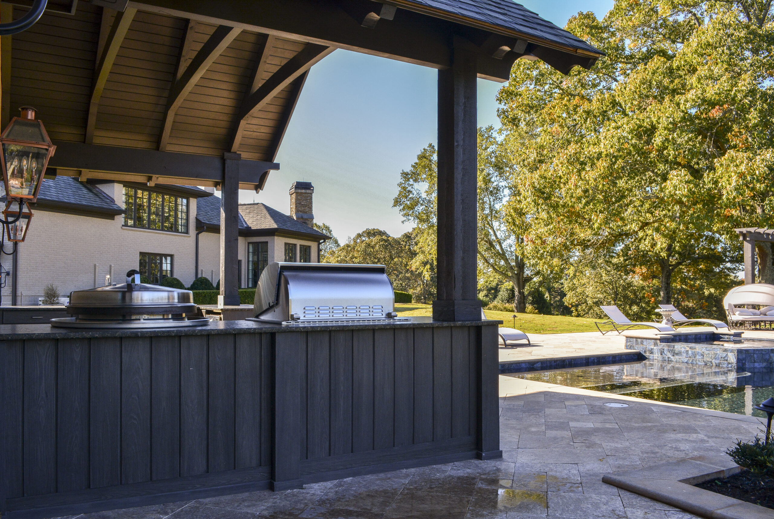 Naturekast cabinetry delivers the warmth of wood with outdoor-rated durability. Leathered granite countertops extend to a raised bar supported by decorative brackets, completing this custom pool house addition that balances rustic architecture and modern performance. Kerl Design transforms backyard living into a private resort experience through functional luxury and enduring craftsmanship.