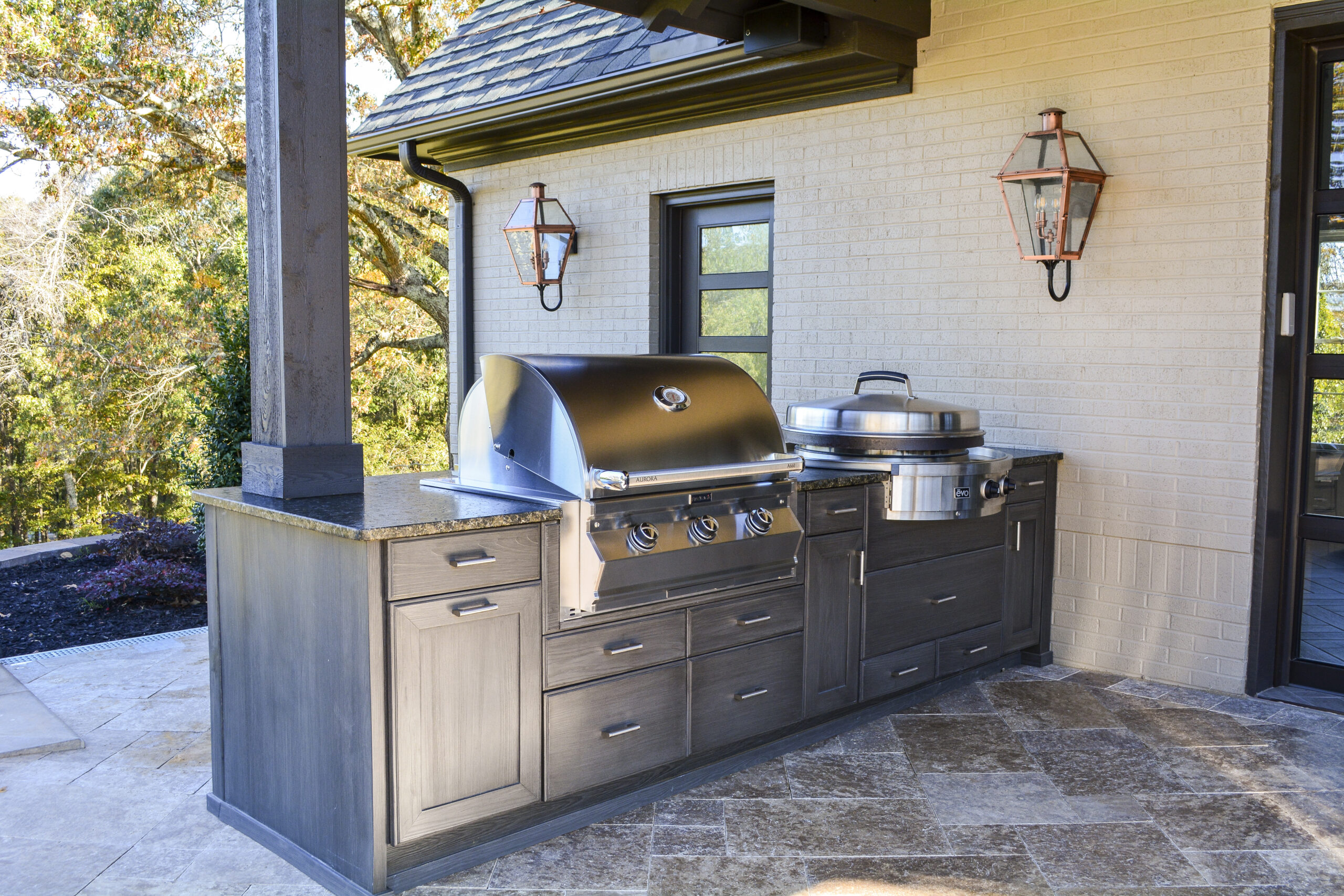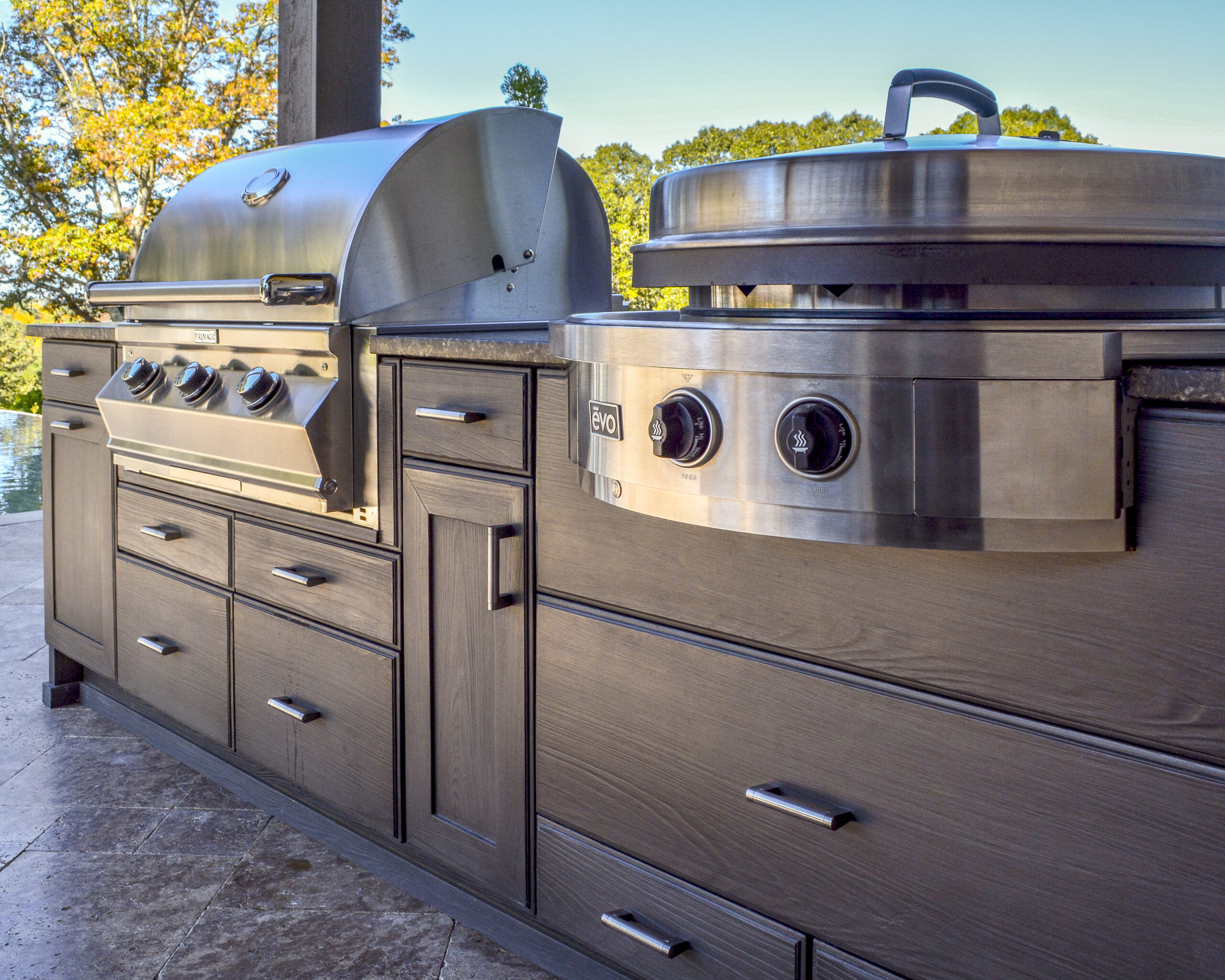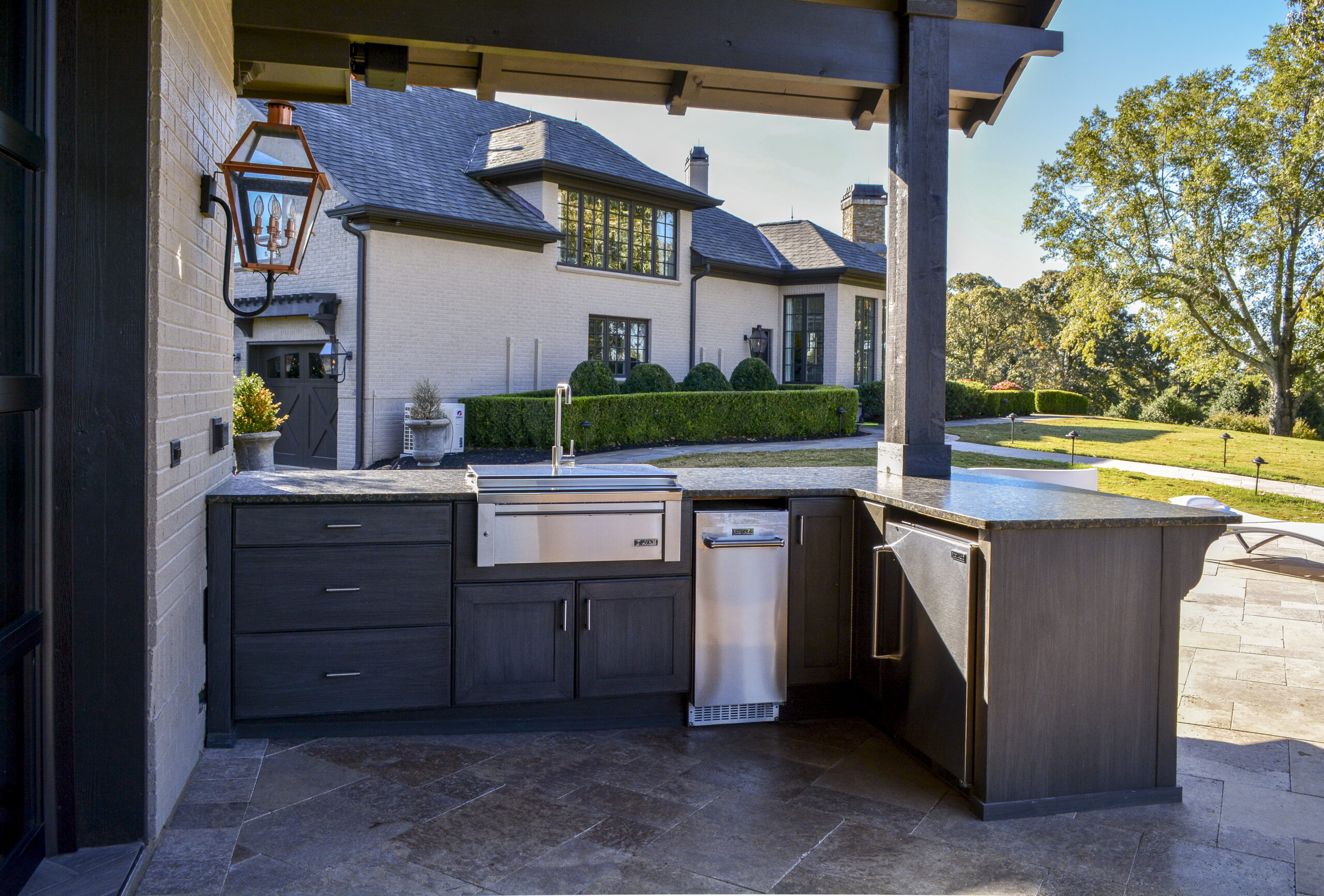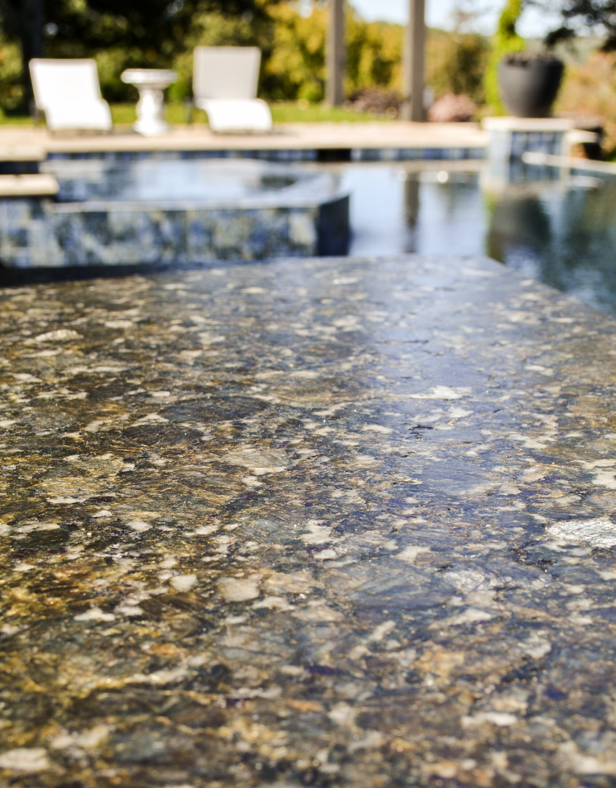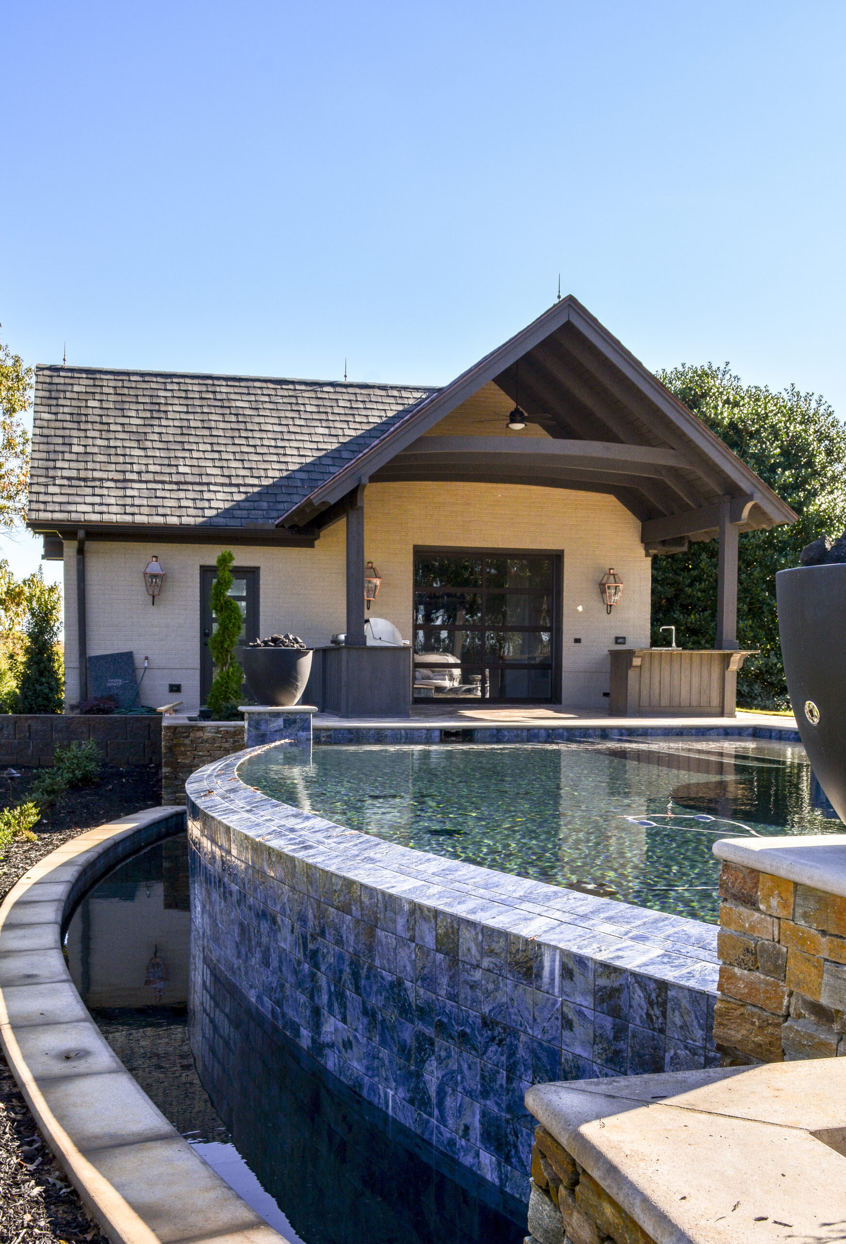 Naturekast cabinetry delivers the warmth of wood with outdoor-rated durability. Leathered granite countertops extend to a raised bar supported by decorative brackets, completing this custom pool house addition that balances rustic architecture and modern performance. Kerl Design transforms backyard living into a private resort experience through functional luxury and enduring craftsmanship.