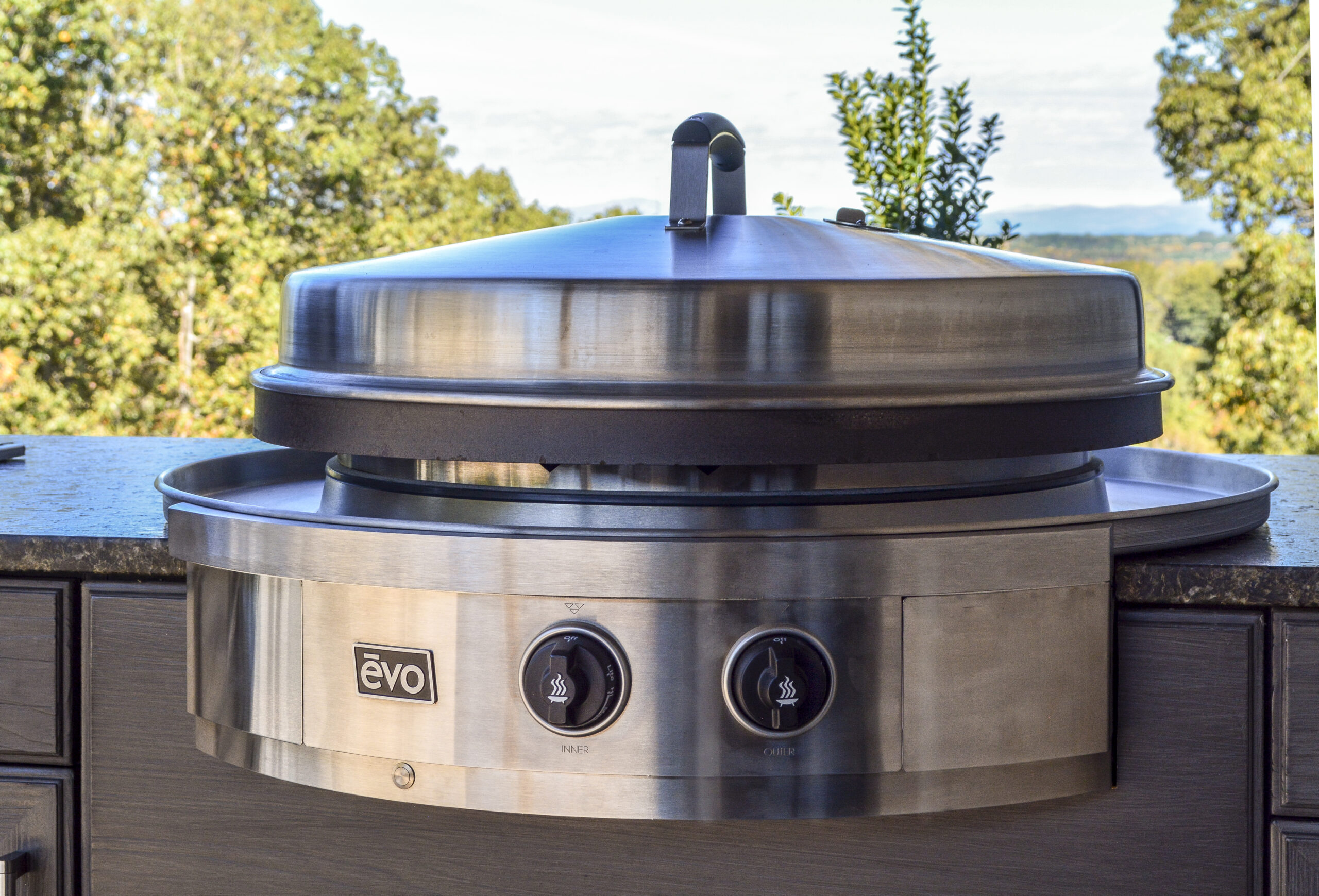 Anchoring the structure is a vaulted gable patio with exposed timber framing. The dual-station outdoor kitchen features a Firemagic grill, Evo griddle, undercounter refrigerator, and stainless sink—all essential elements for the serious grill enthusiast seeking luxury outdoor entertaining spaces in South Carolina and beyond.