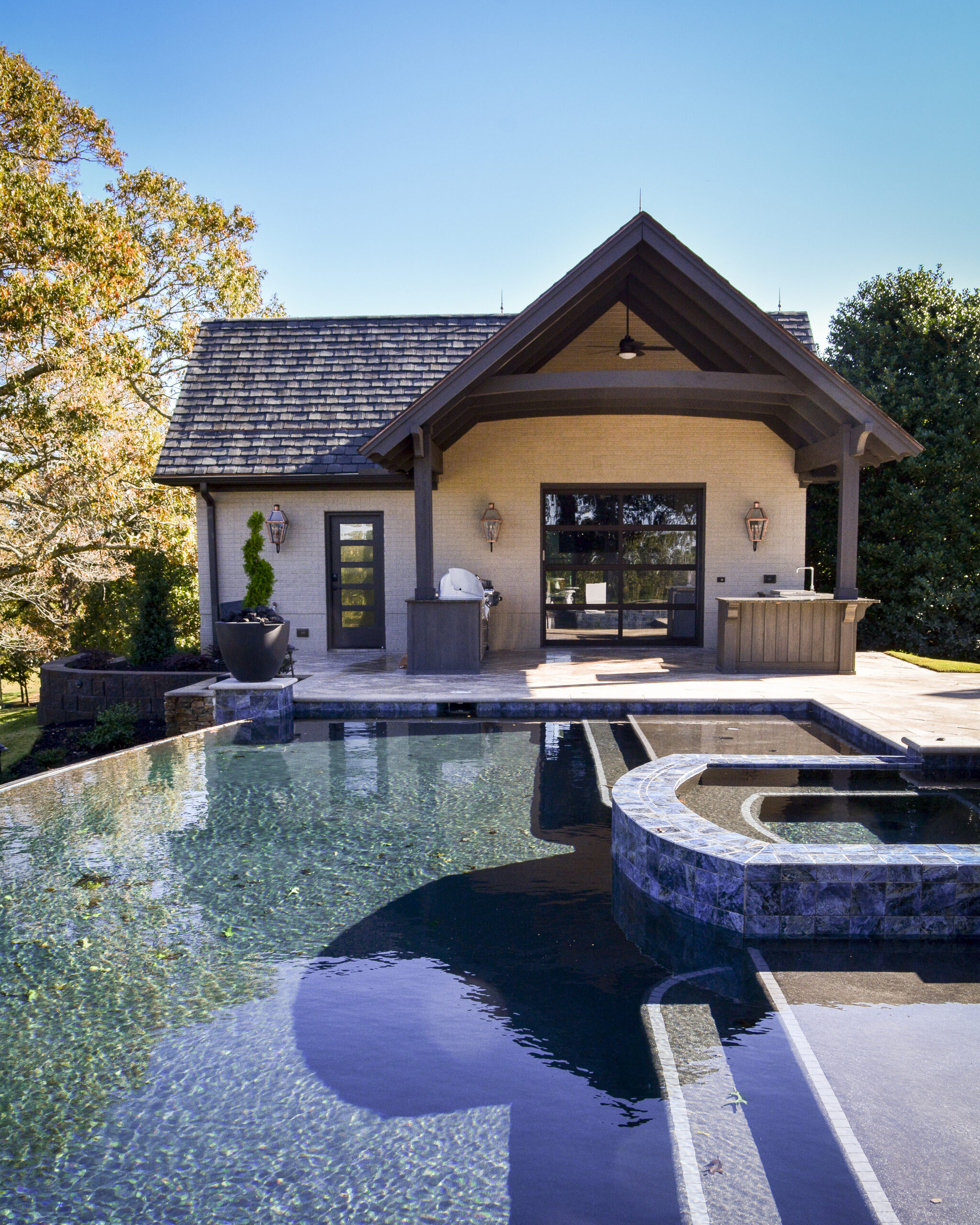 This award-worthy pool house design showcases Kerl Design’s expertise in residential architecture and outdoor living design. The indoor lounge connects directly to the stone pool deck through a glass garage-style door, creating seamless transitions between indoors and out. A full bath accessible from both the pool and lounge adds convenience, while pumps and storage are neatly concealed from view.