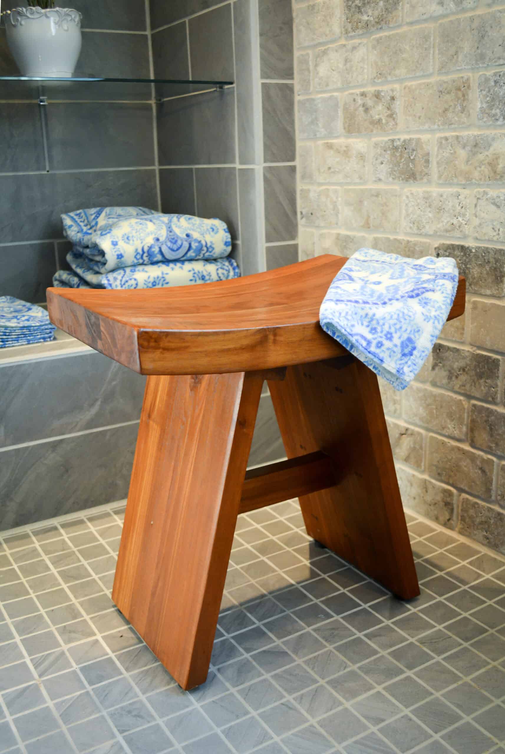 A partial wall with center pillar conceals plumbing while containing spray. Wall-mounted body jets, a ceiling rain head, and an additional showerhead offer multiple experiences. With a zero-entry threshold and removable teak bench, this accessible bathroom design accommodates all ages and abilities.