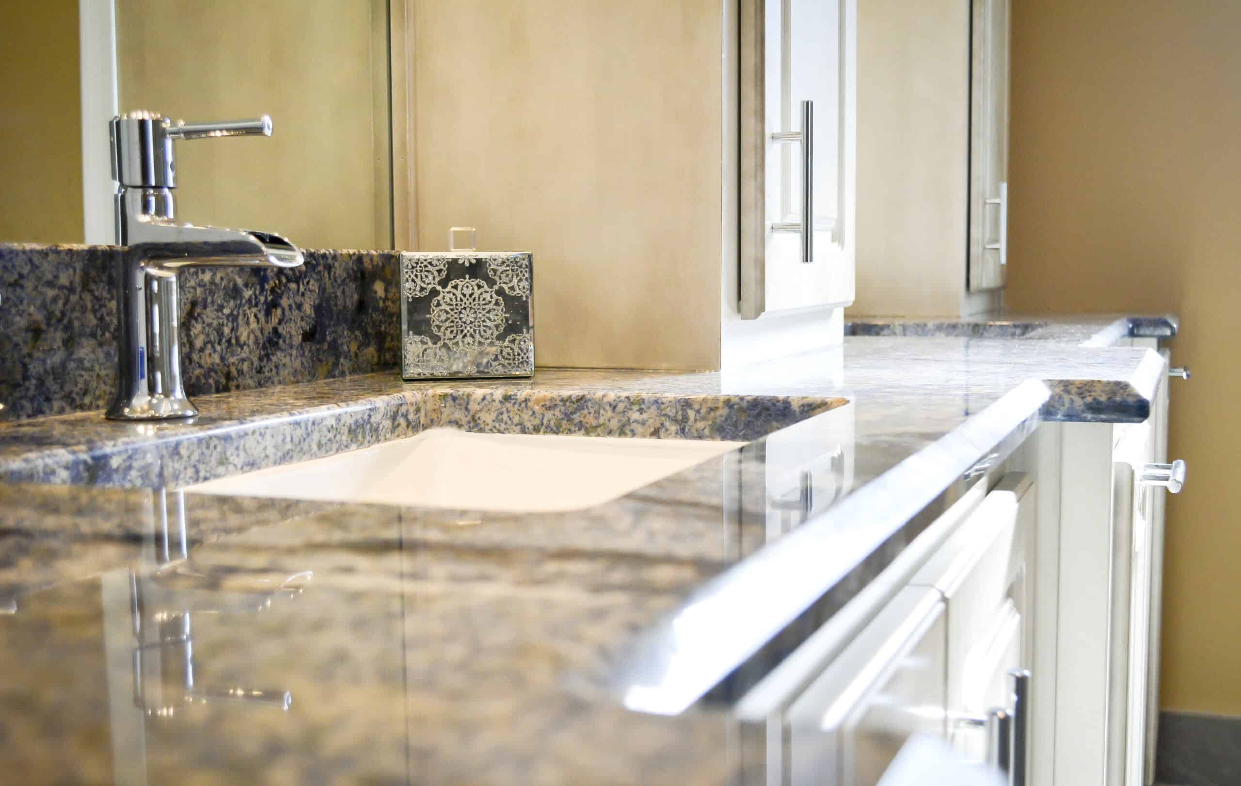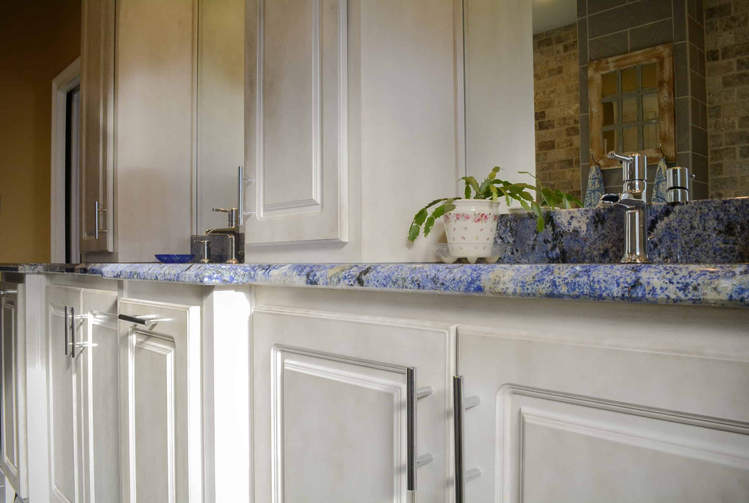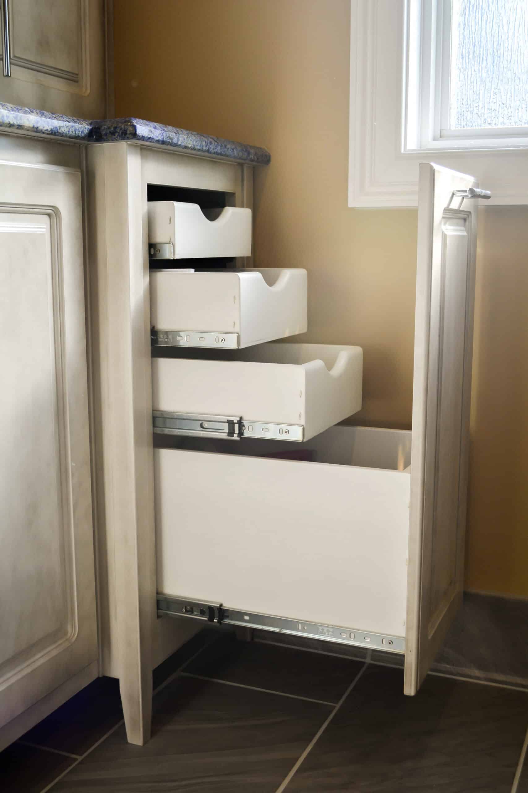 Nested drawers maintain the vanity’s streamlined look while maximizing storage. Tower cabinets add vertical interest and convenience. Contrasting tiles introduce texture and depth, ensuring the space remains fresh and functional—a hallmark of Kerl Design’s luxury bathroom remodeling expertise.