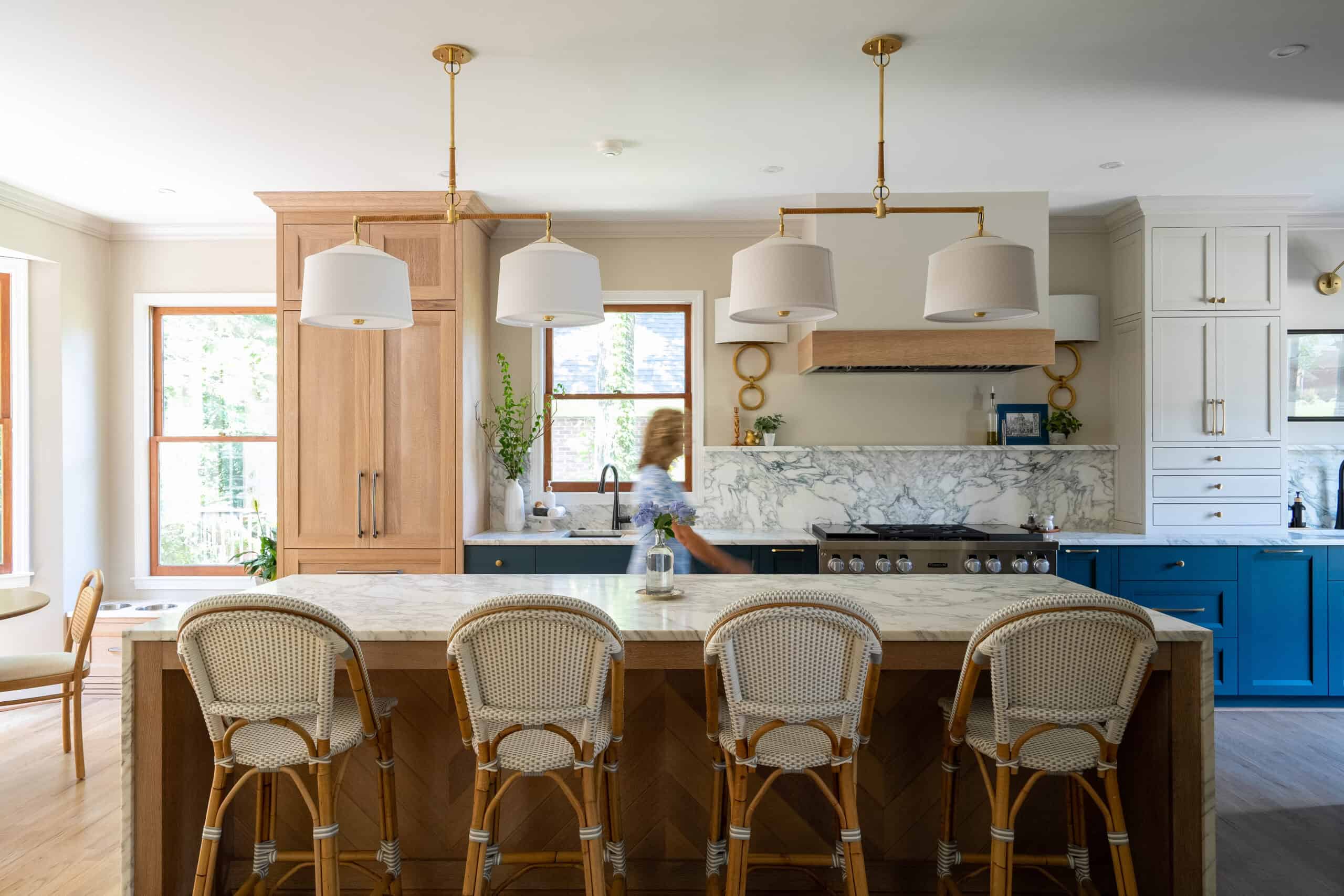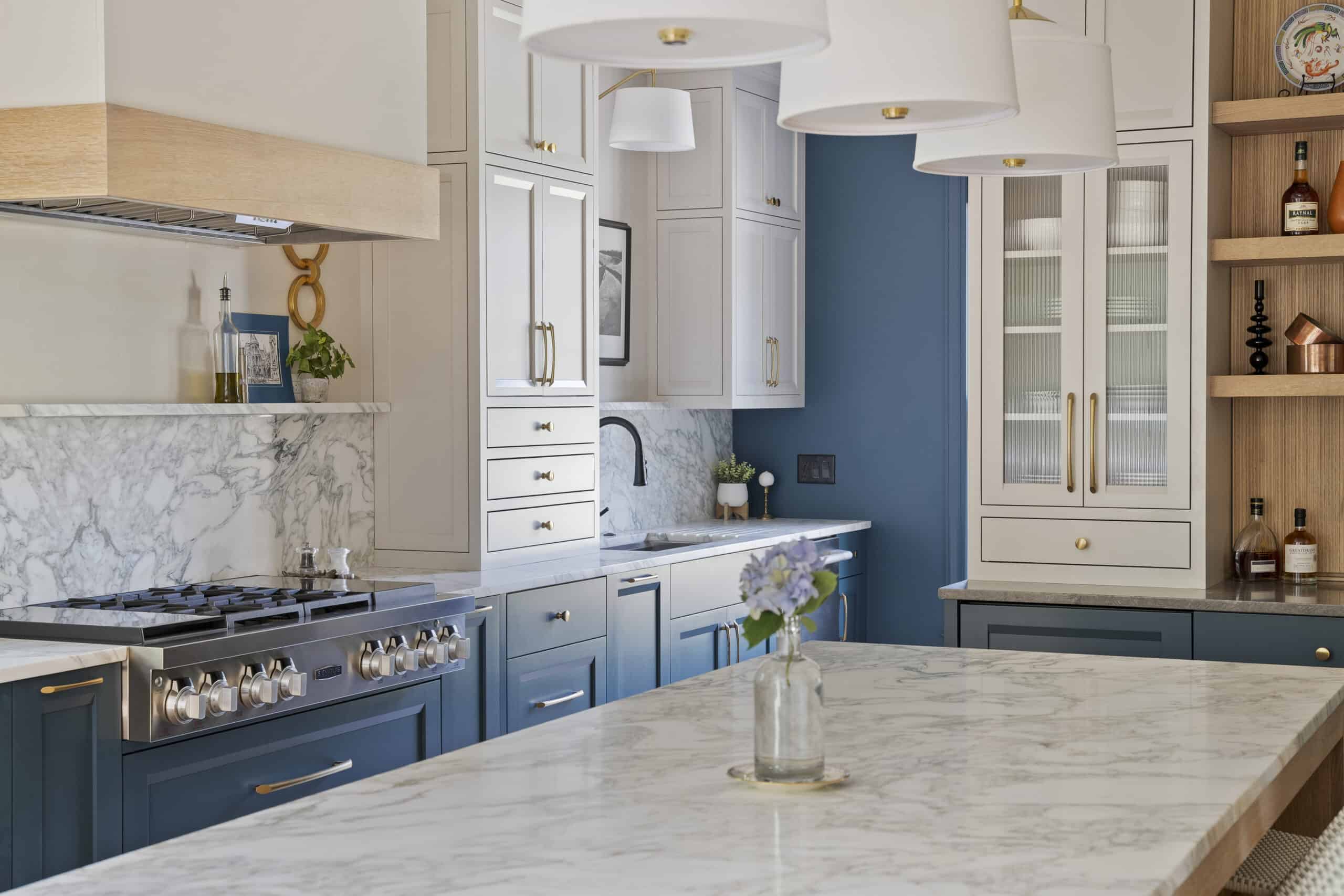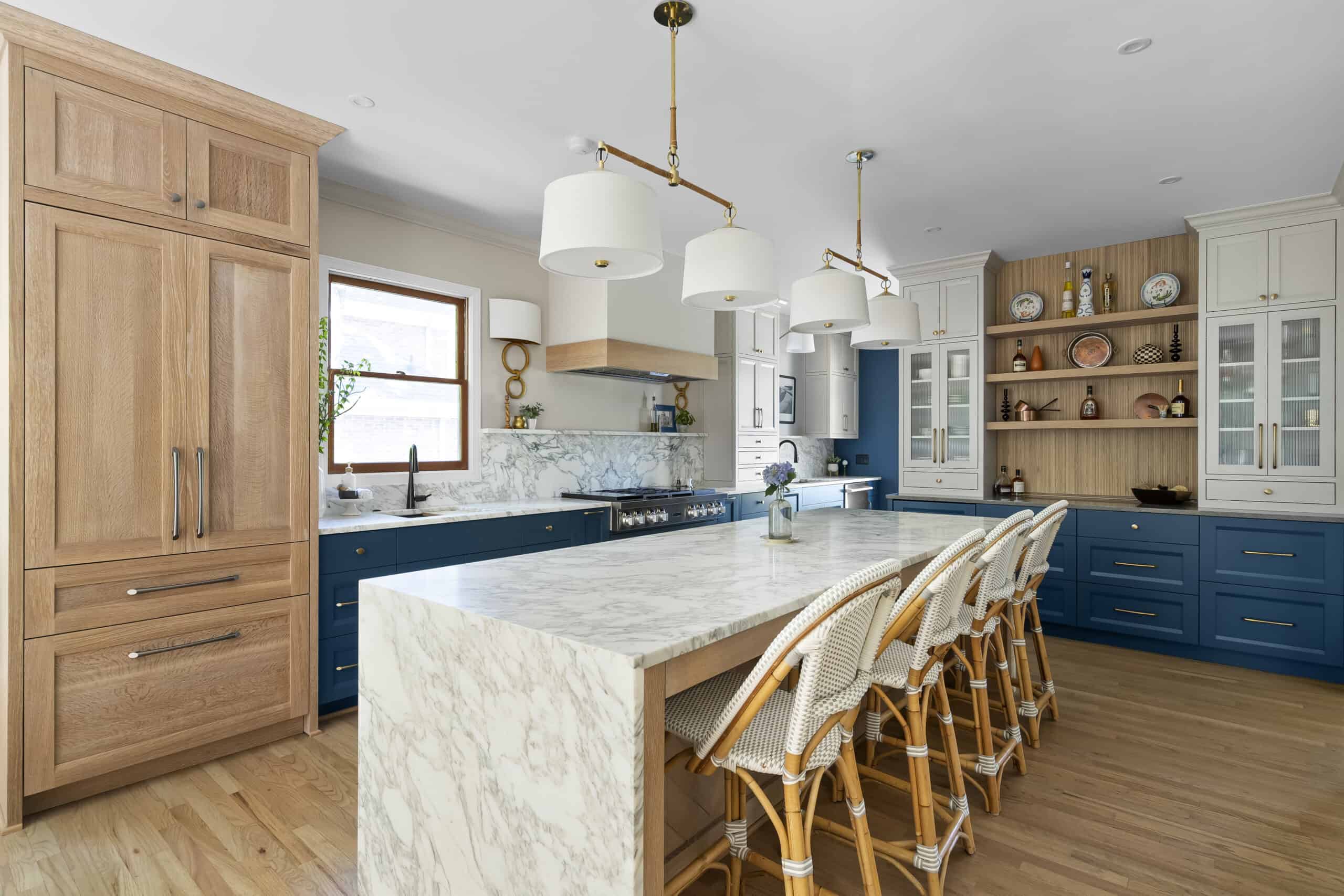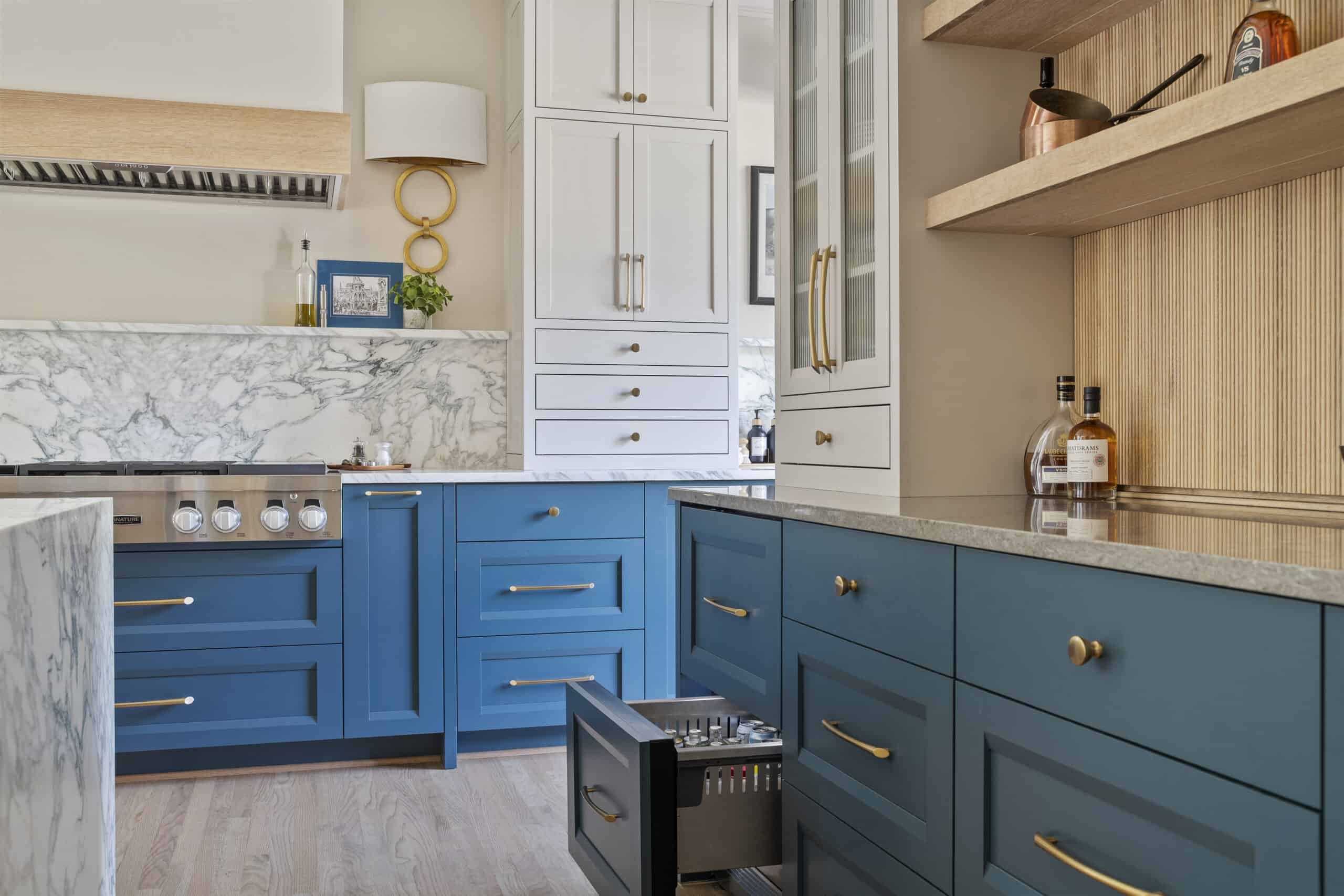 Intentional combinations of stain and paint, inset and overlay, mixed metals, marble, and quartz work in unison to create a harmonious blend of finishes and fixtures. Bold color blended with warm wood and soft whites makes for an energetic yet peaceful space.