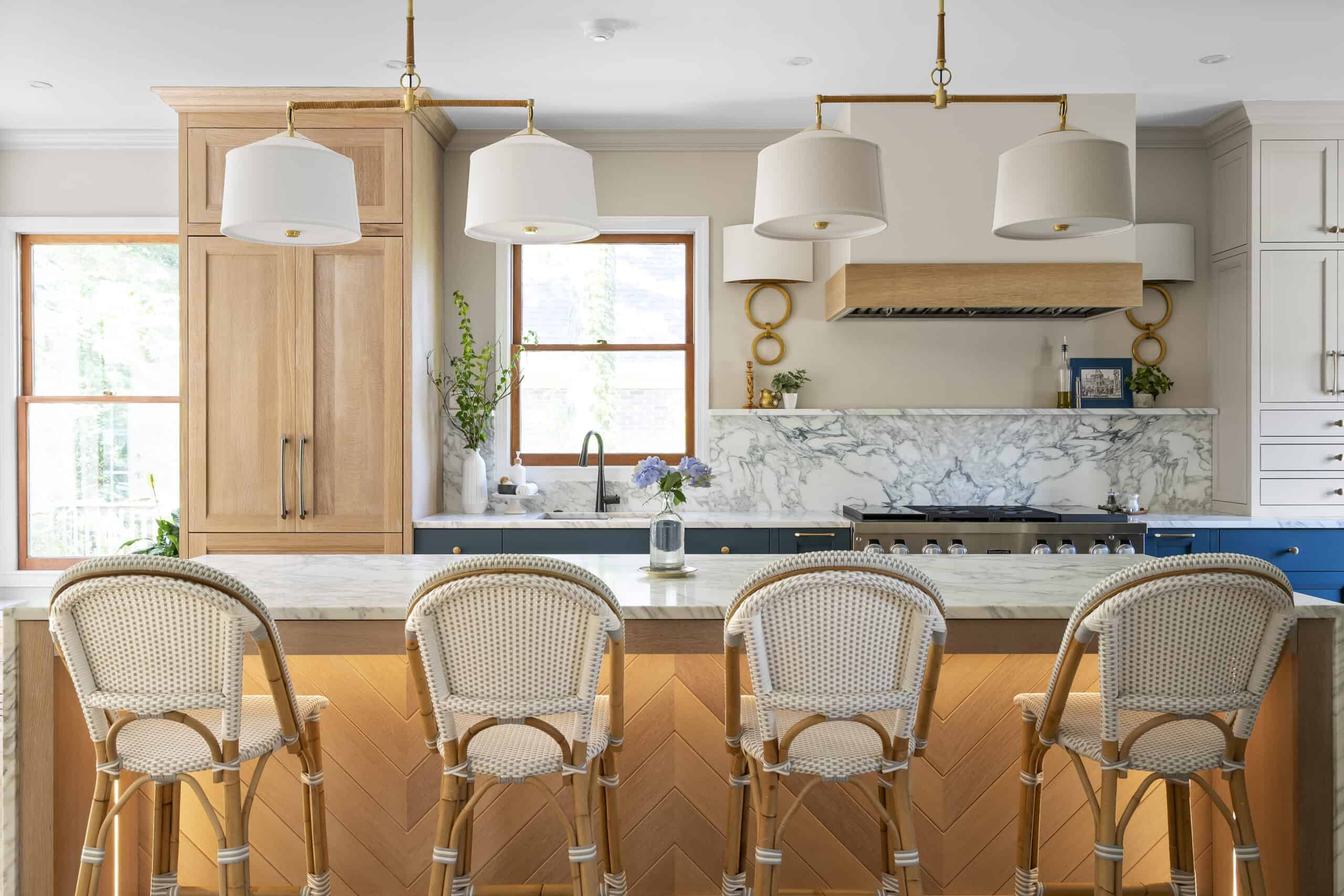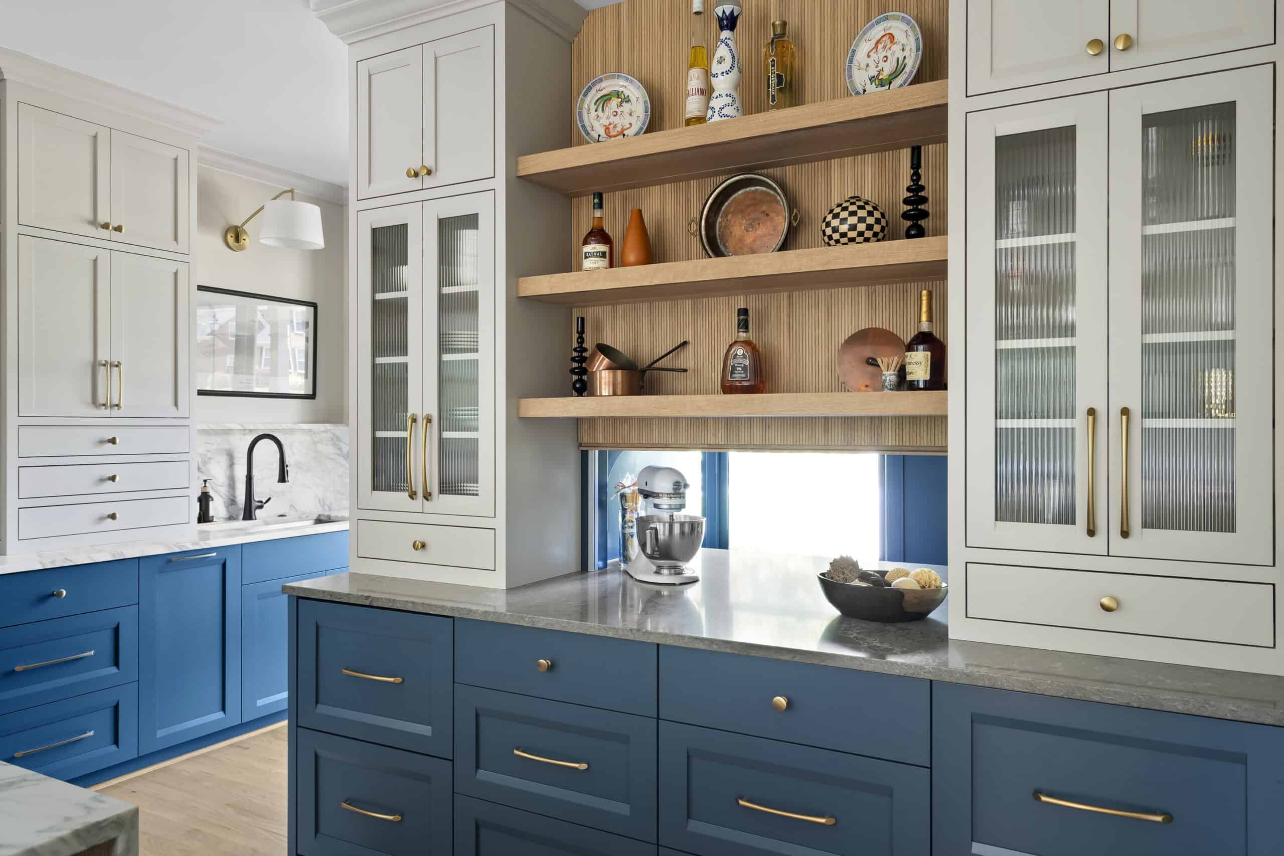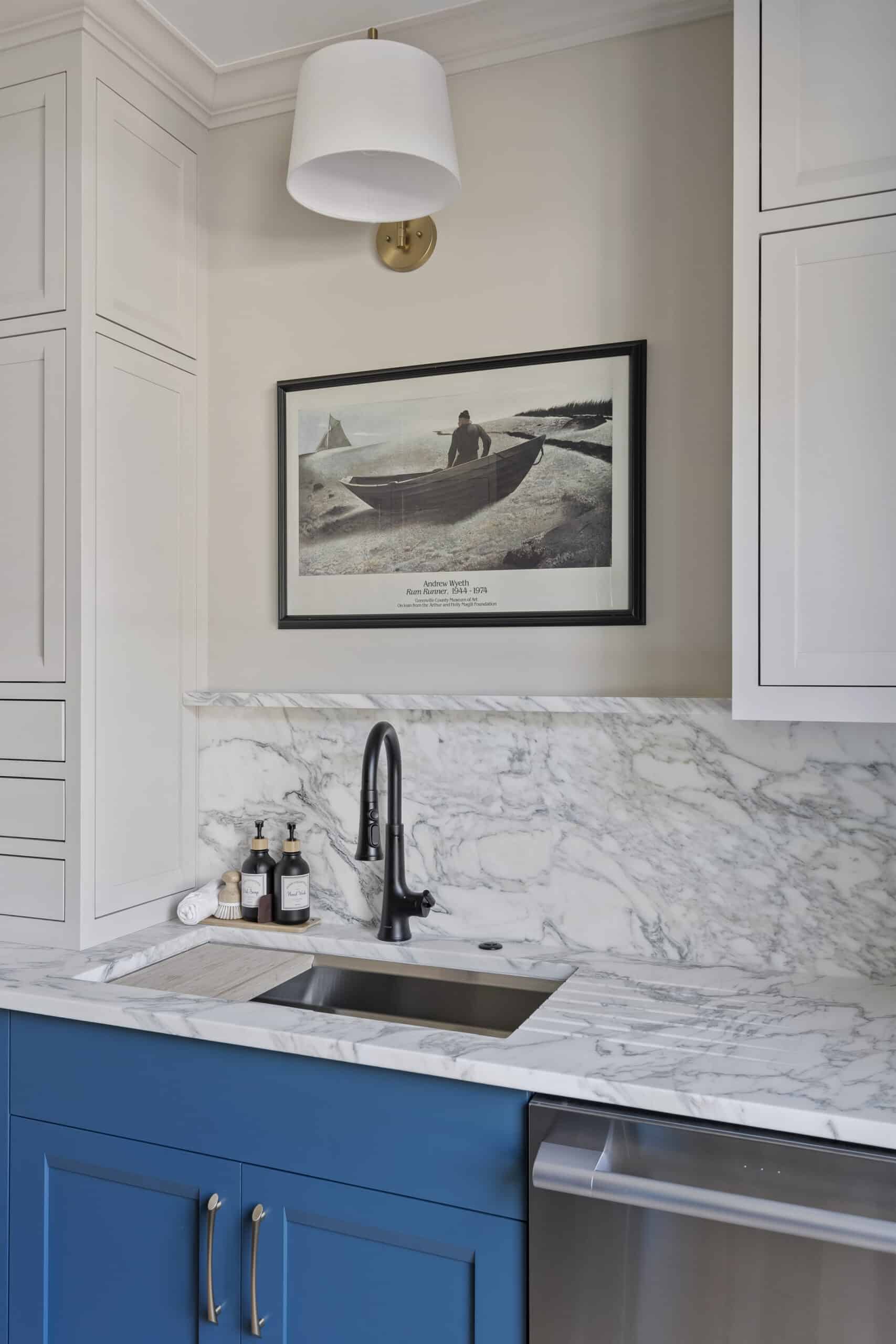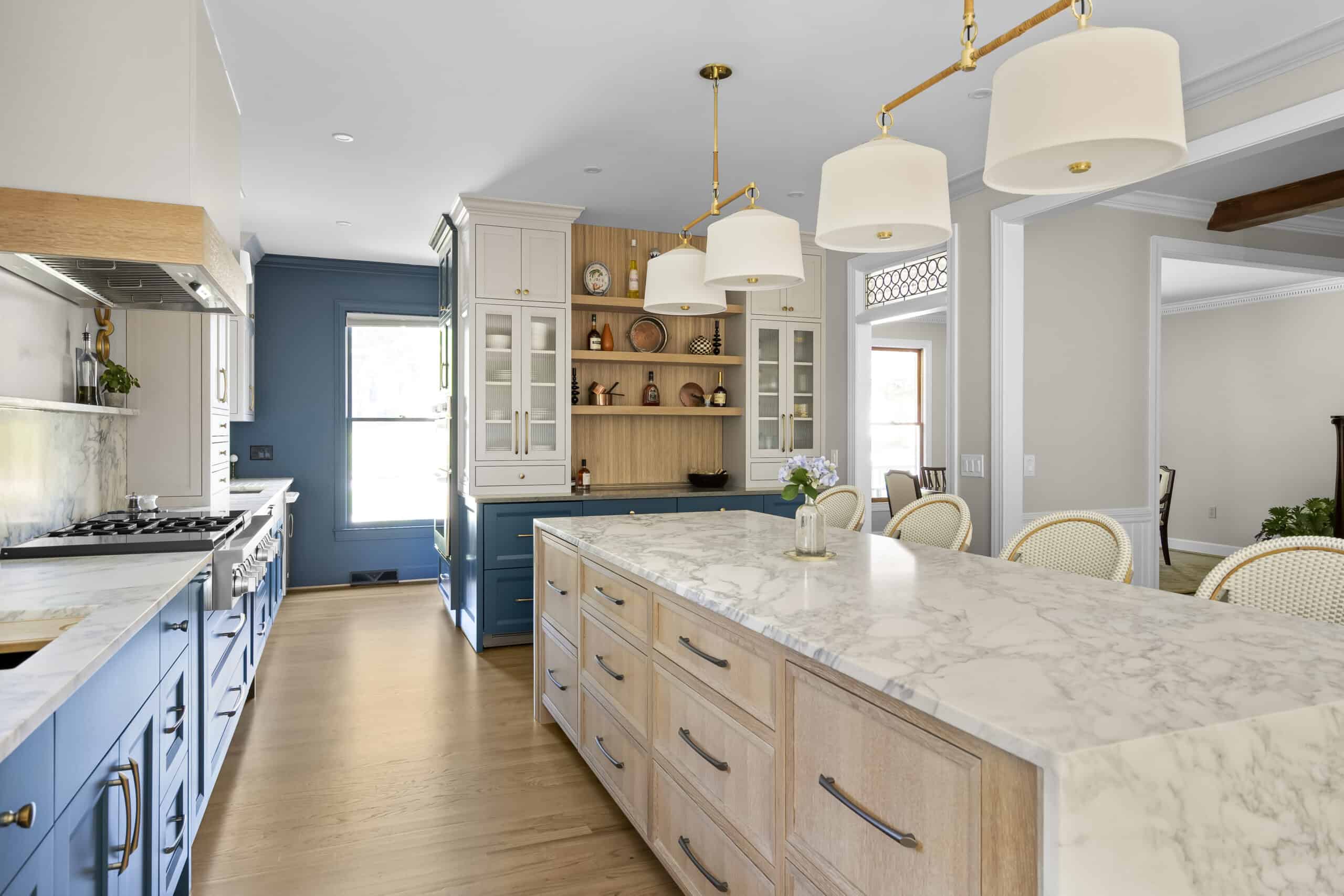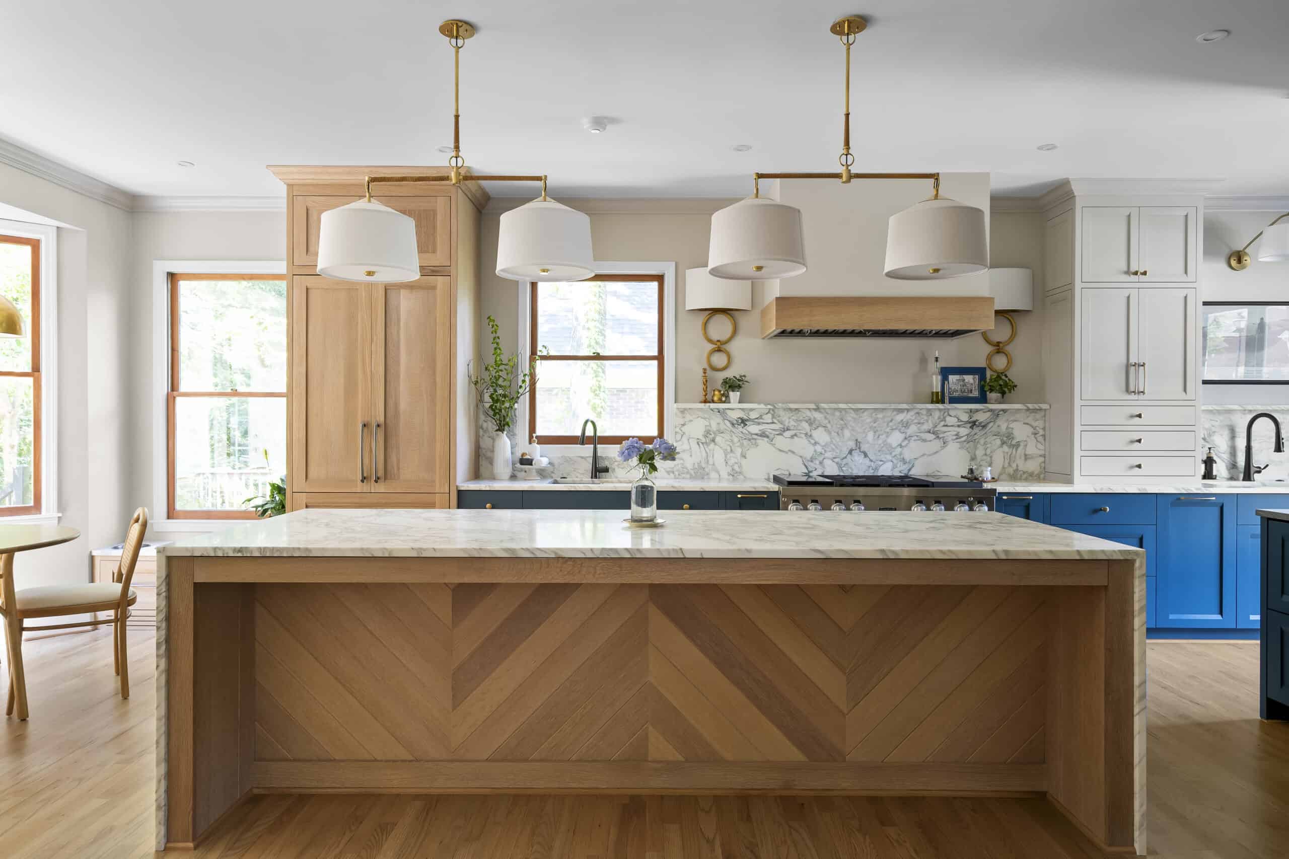 Intentional combinations of stain and paint, inset and overlay, mixed metals, marble, and quartz work in unison to create a harmonious blend of finishes and fixtures. Bold color blended with warm wood and soft whites makes for an energetic yet peaceful space.