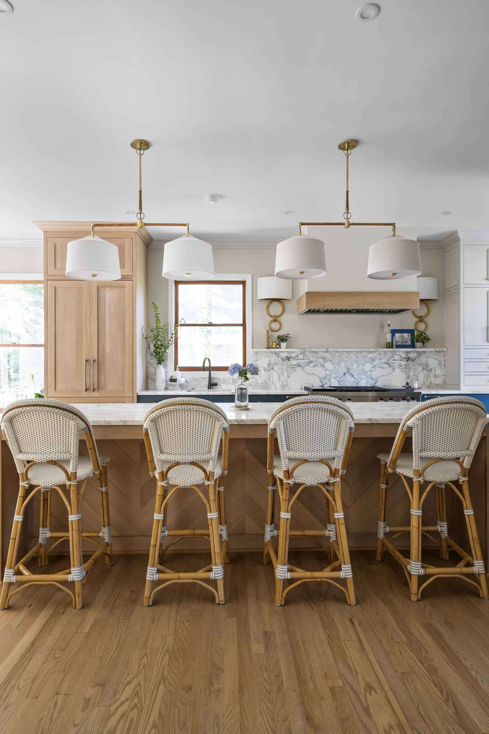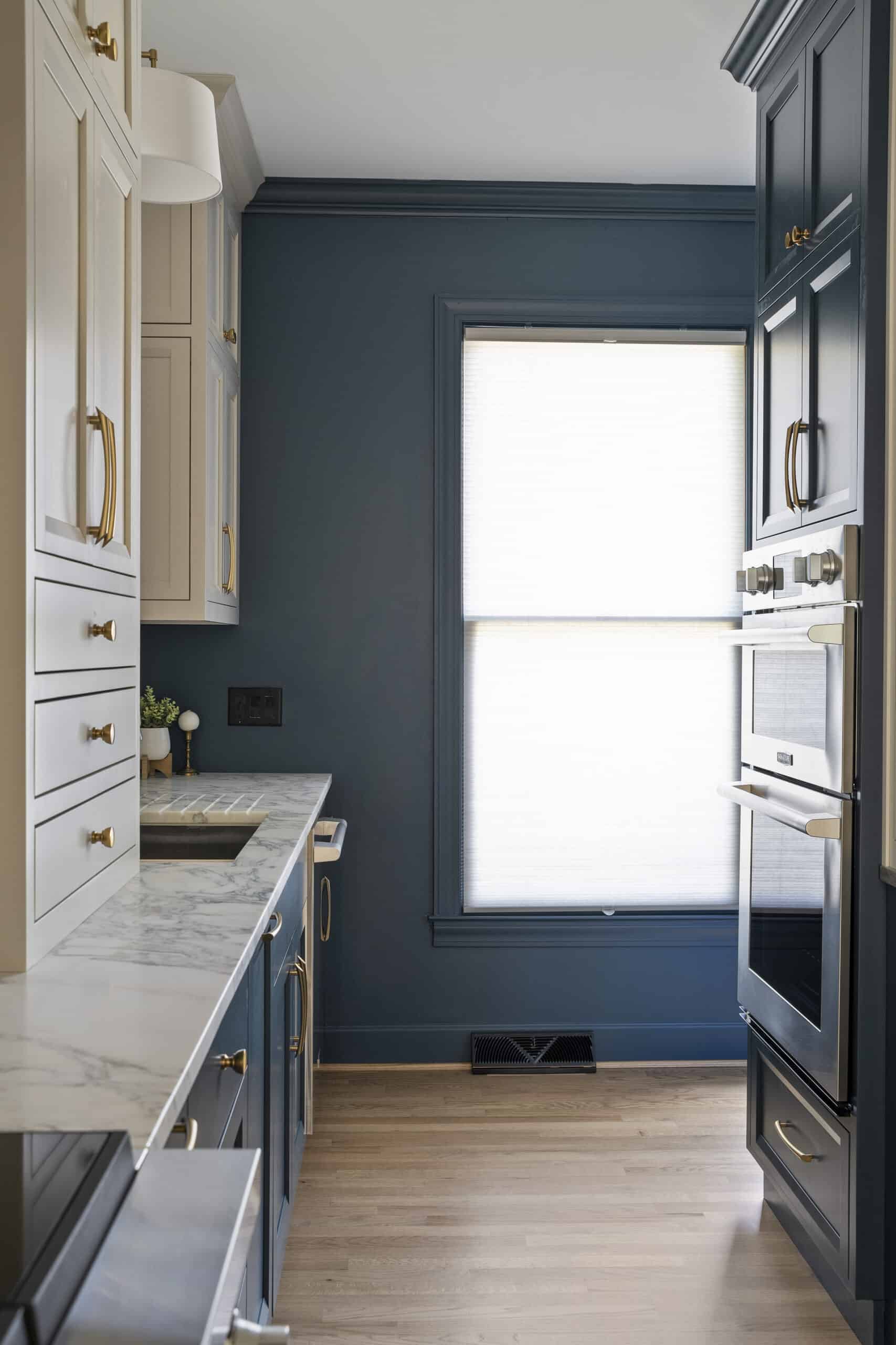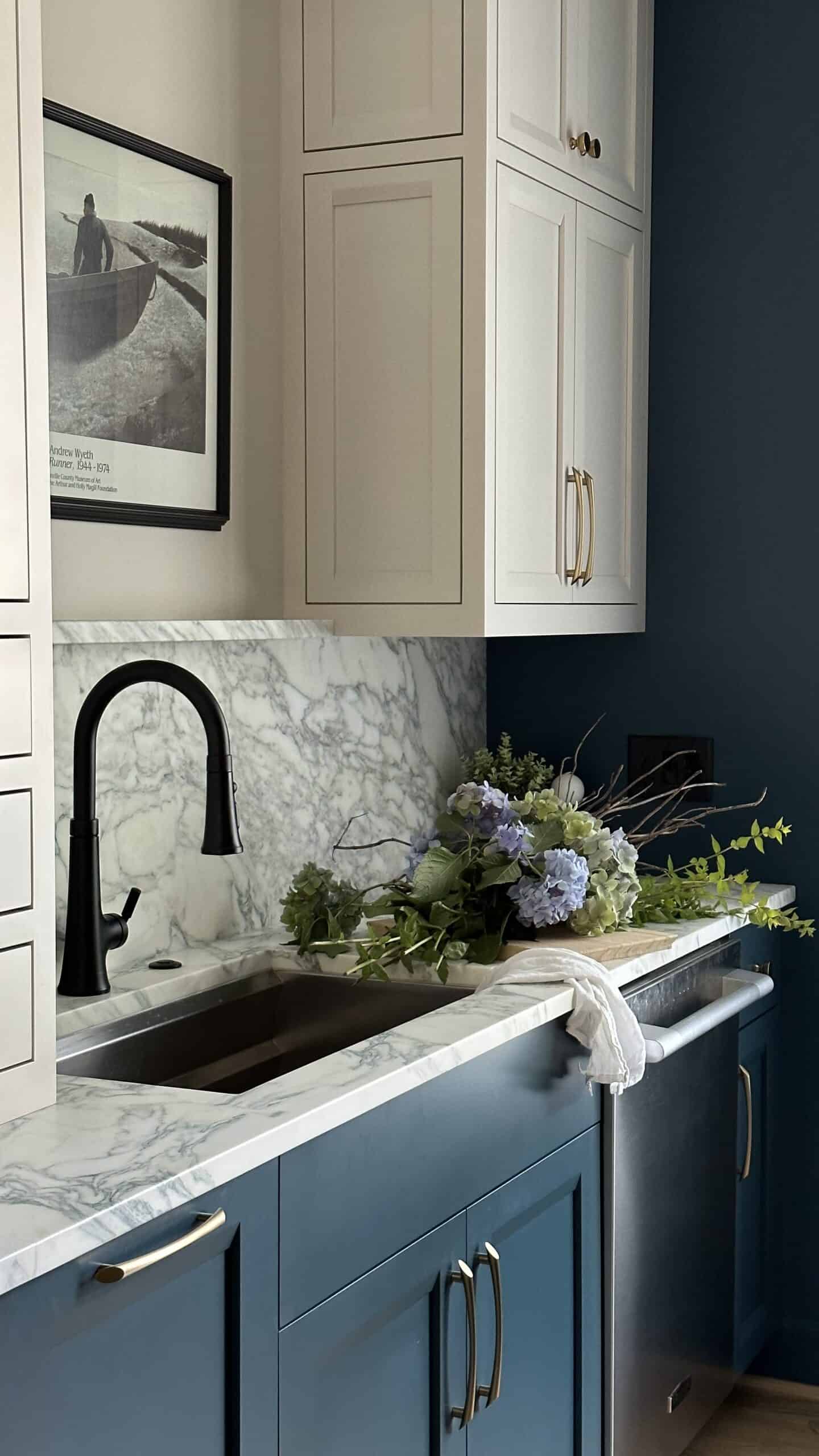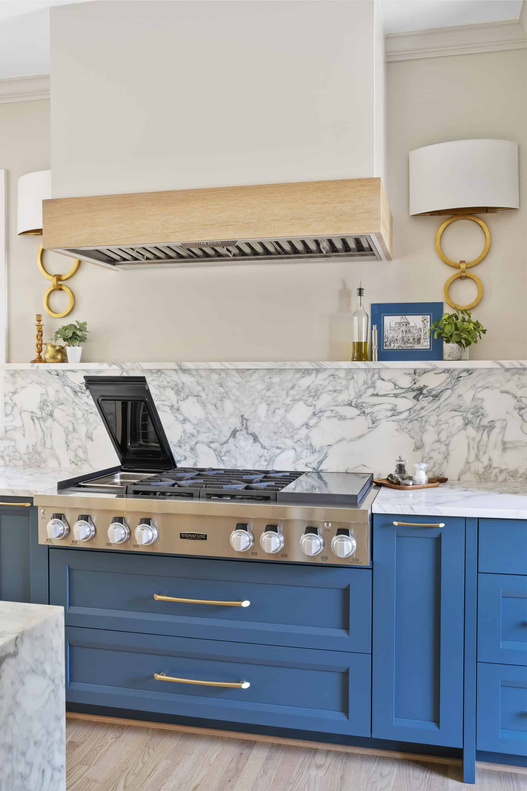 Intentional combinations of stain and paint, inset and overlay, mixed metals, marble, and quartz work in unison to create a harmonious blend of finishes and fixtures. Bold color blended with warm wood and soft whites makes for an energetic yet peaceful space.