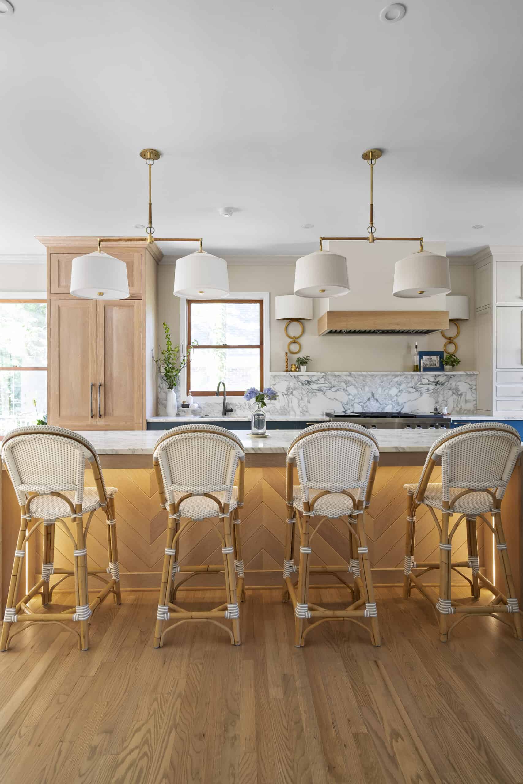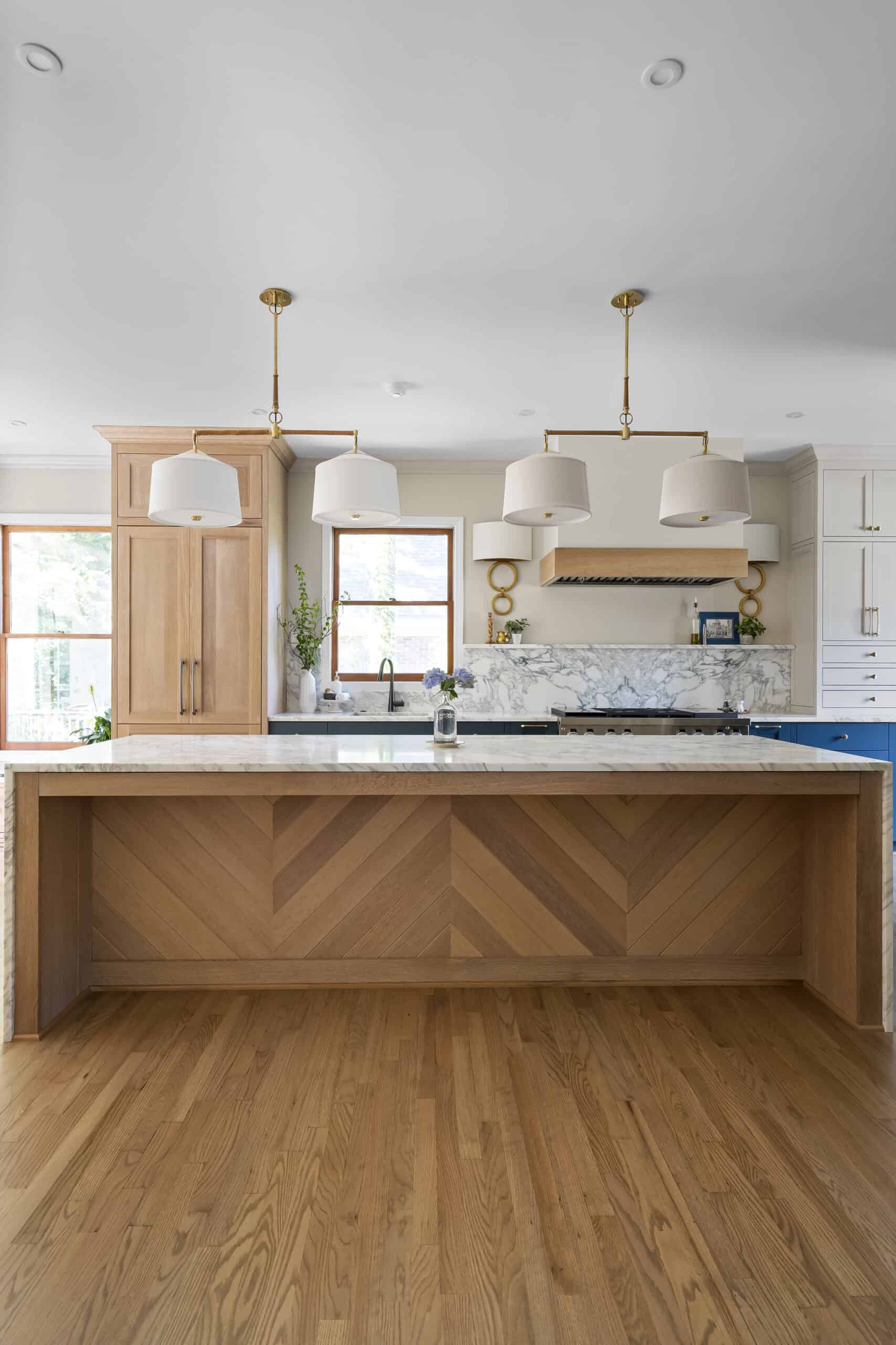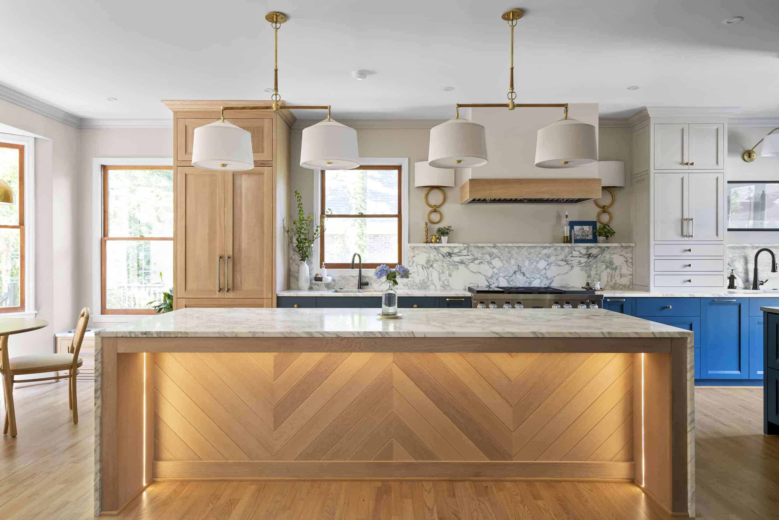 Front and center, an oversized kitchen island with natural white oak veneer, unexpected chevron detailing, integrated LED lighting, and an authentic Carrara marble counter with dramatic waterfall ends sets the stage for inviting and memorable gatherings and celebrations. The expansive 9½-foot island is uninterrupted by a sink or other obstruction, making it versatile and exceptionally functional — a defining feature in award-winning kitchen design.