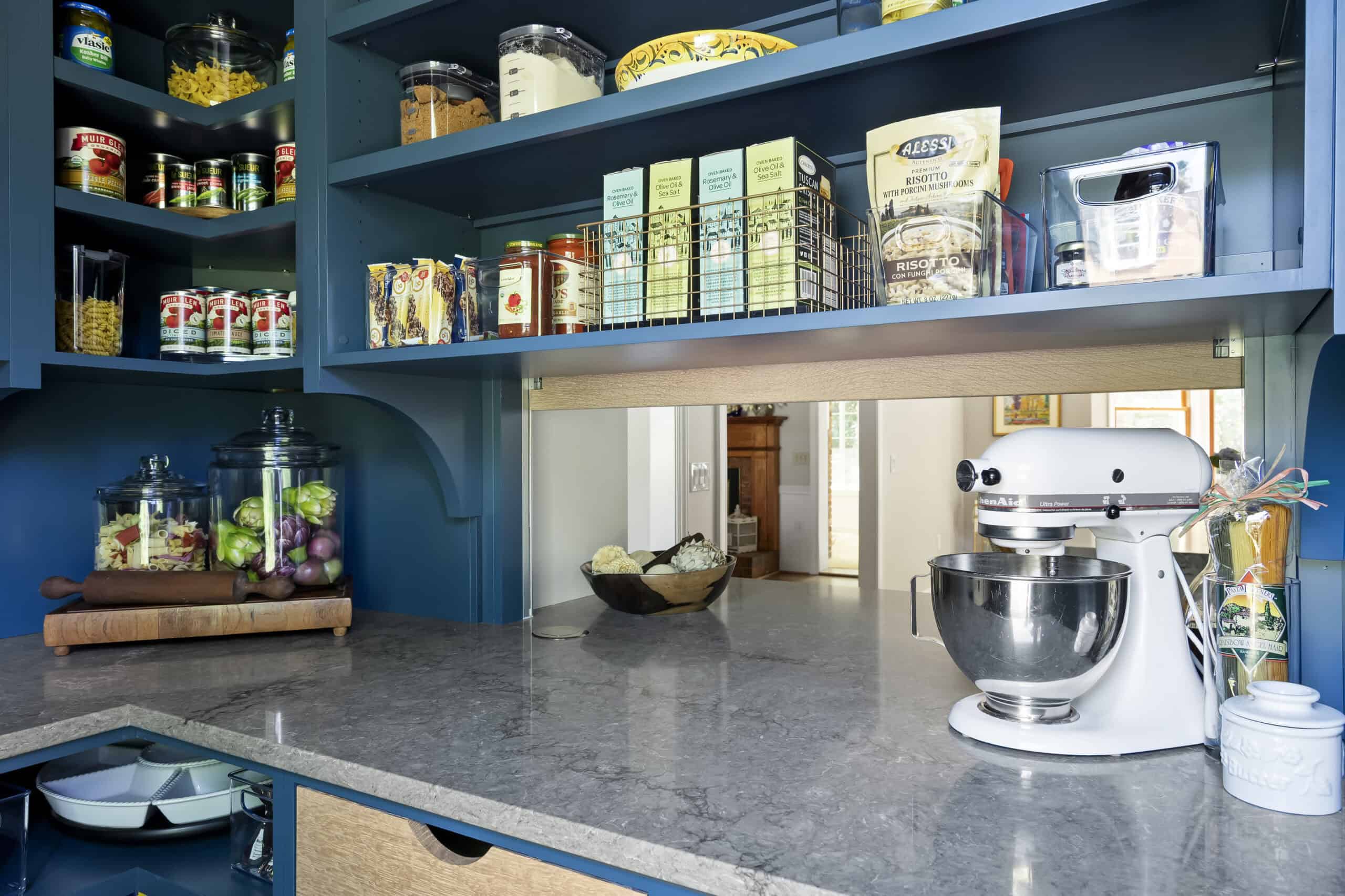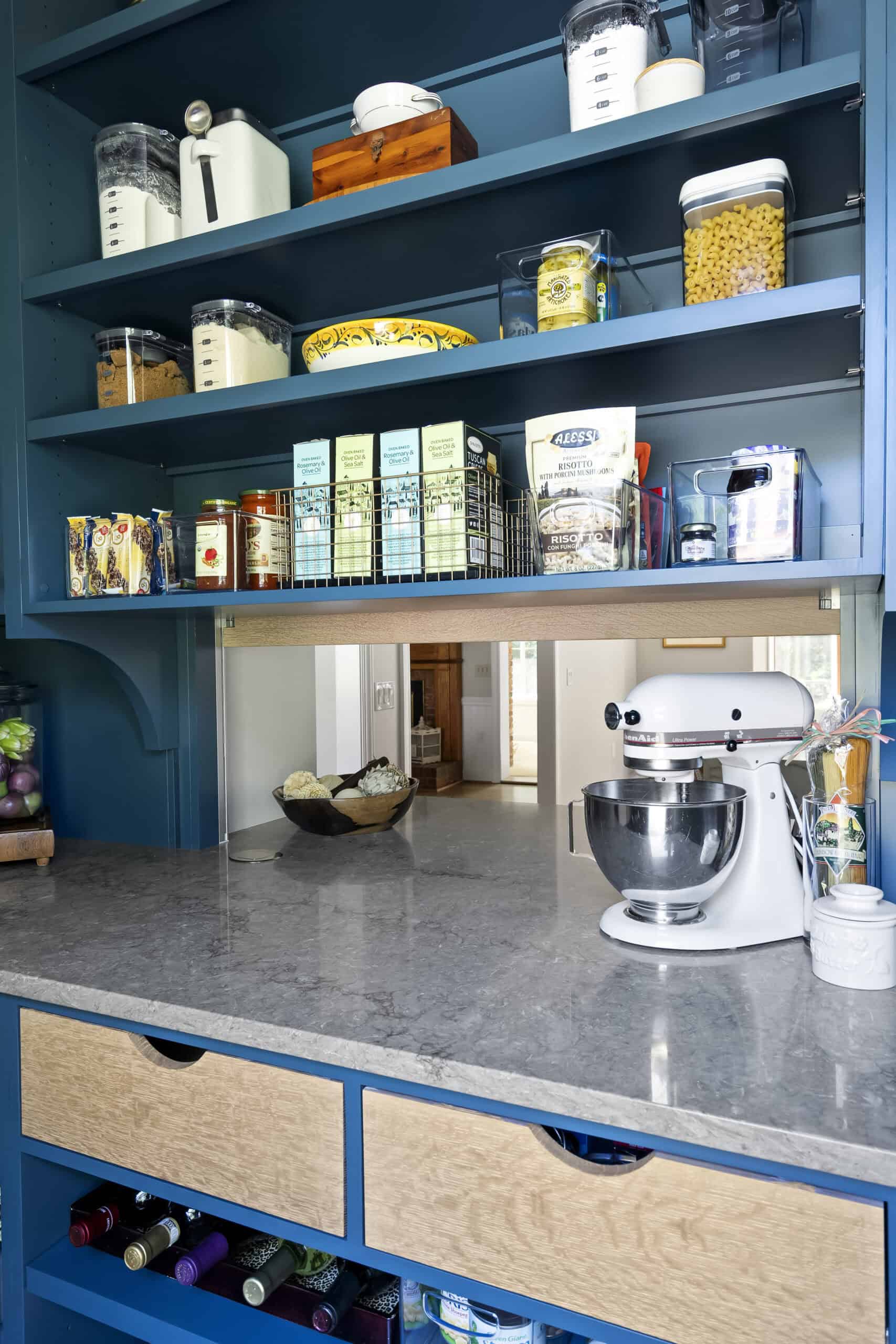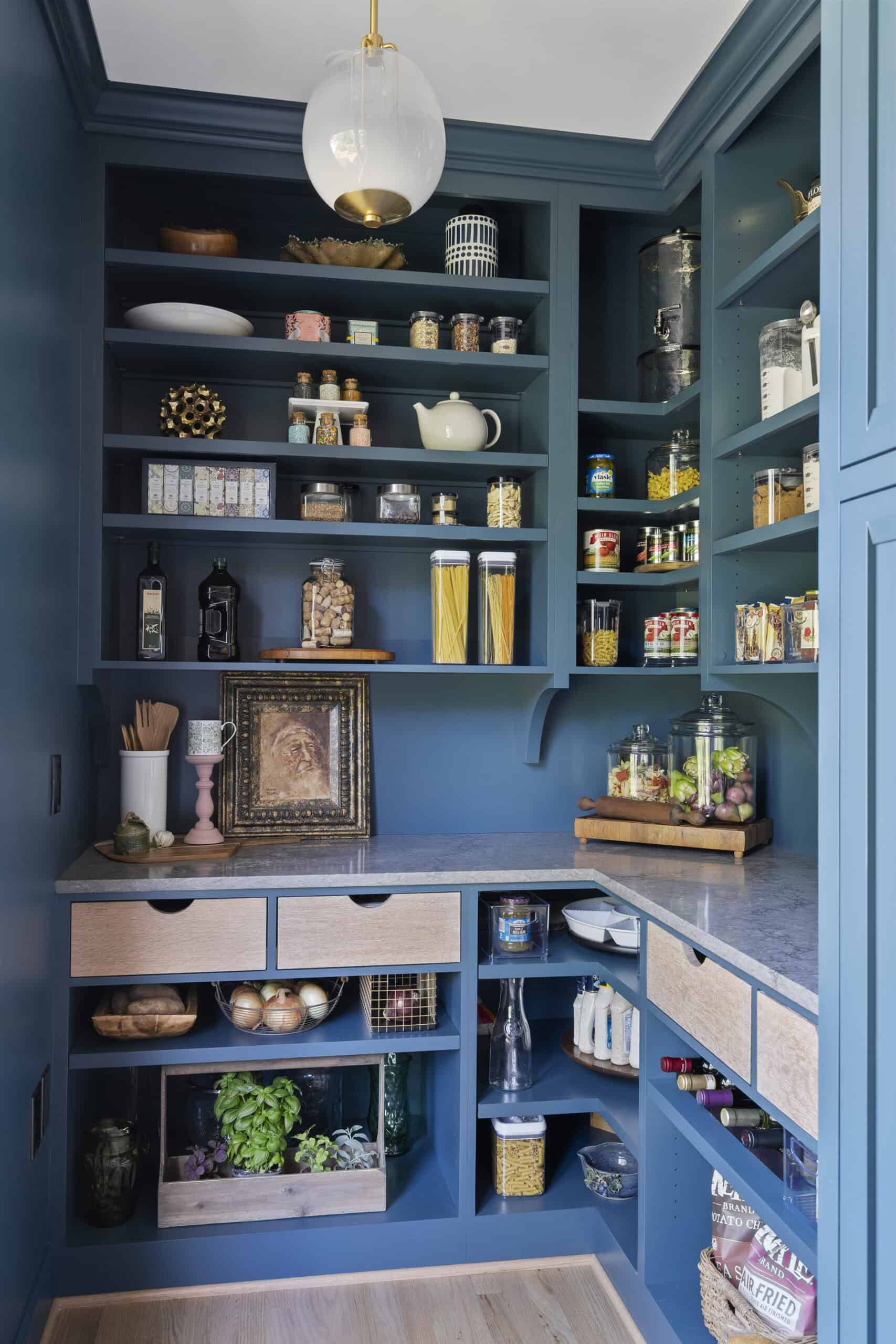 Beyond its surprising beauty, the pantry is also a mecca of storage with open shelving that allows for easy-to-find accessibility and endless customization. Thoughtful design details — like custom corbels, an ombré glass globe pendant light, and a specially designed backsplash that lifts into the wall above to provide a hidden pass-through to the main kitchen — make this so much more than a utilitarian space.