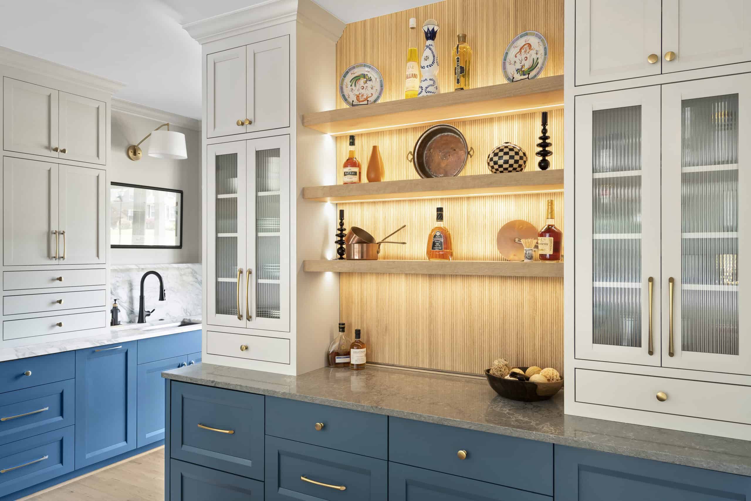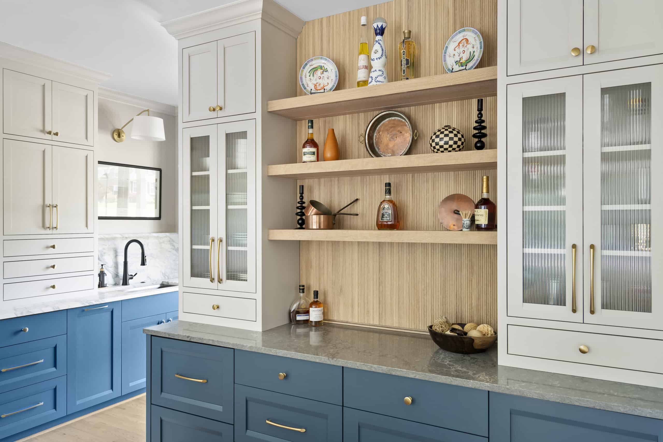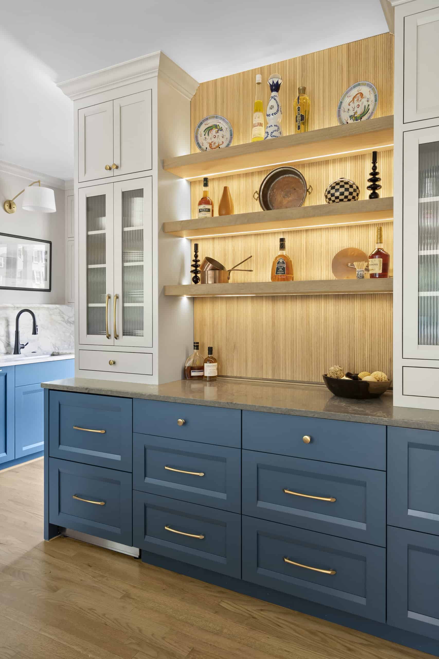 Beyond its surprising beauty, the pantry is also a mecca of storage with open shelving that allows for easy-to-find accessibility and endless customization. Thoughtful design details — like custom corbels, an ombré glass globe pendant light, and a specially designed backsplash that lifts into the wall above to provide a hidden pass-through to the main kitchen — make this so much more than a utilitarian space.