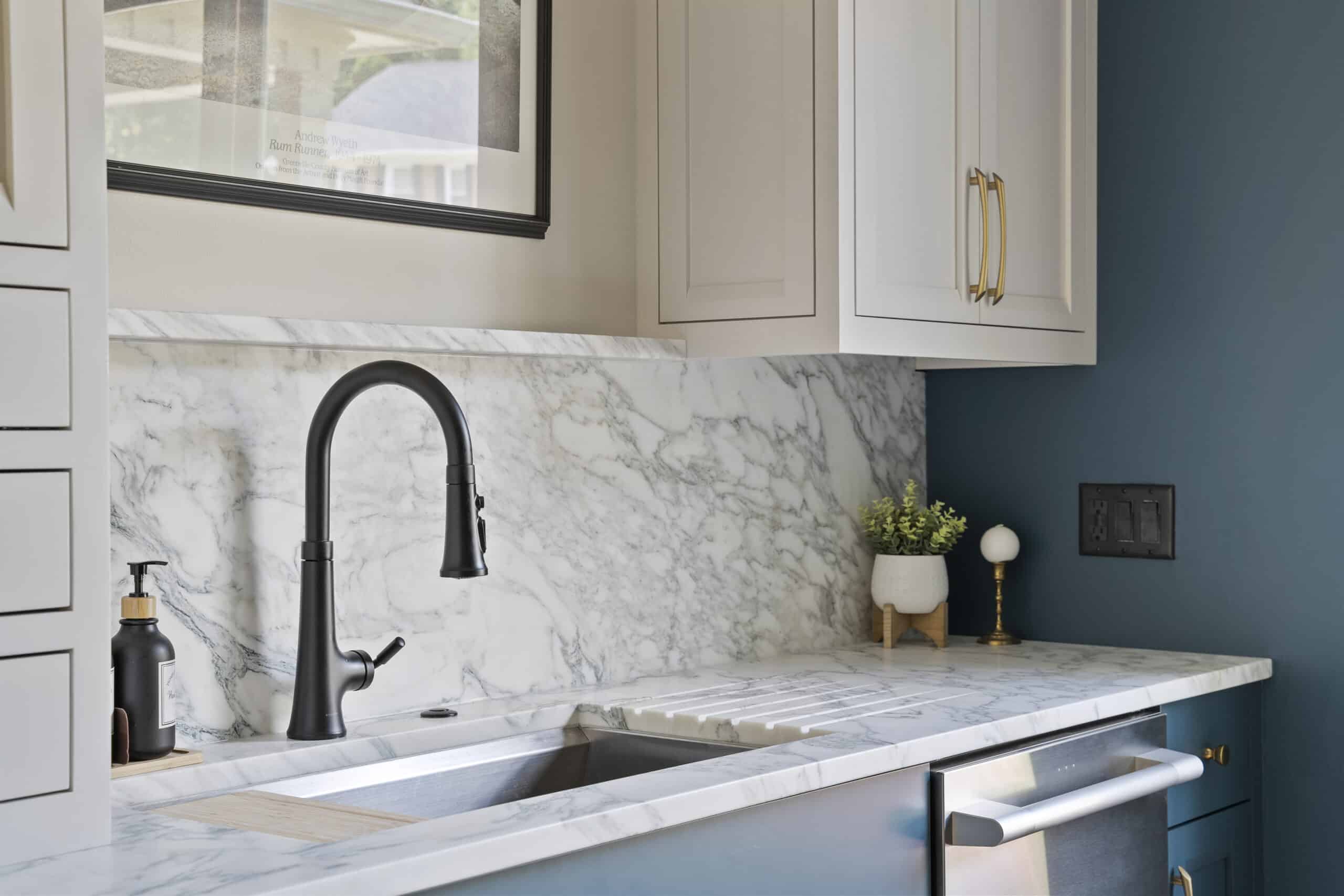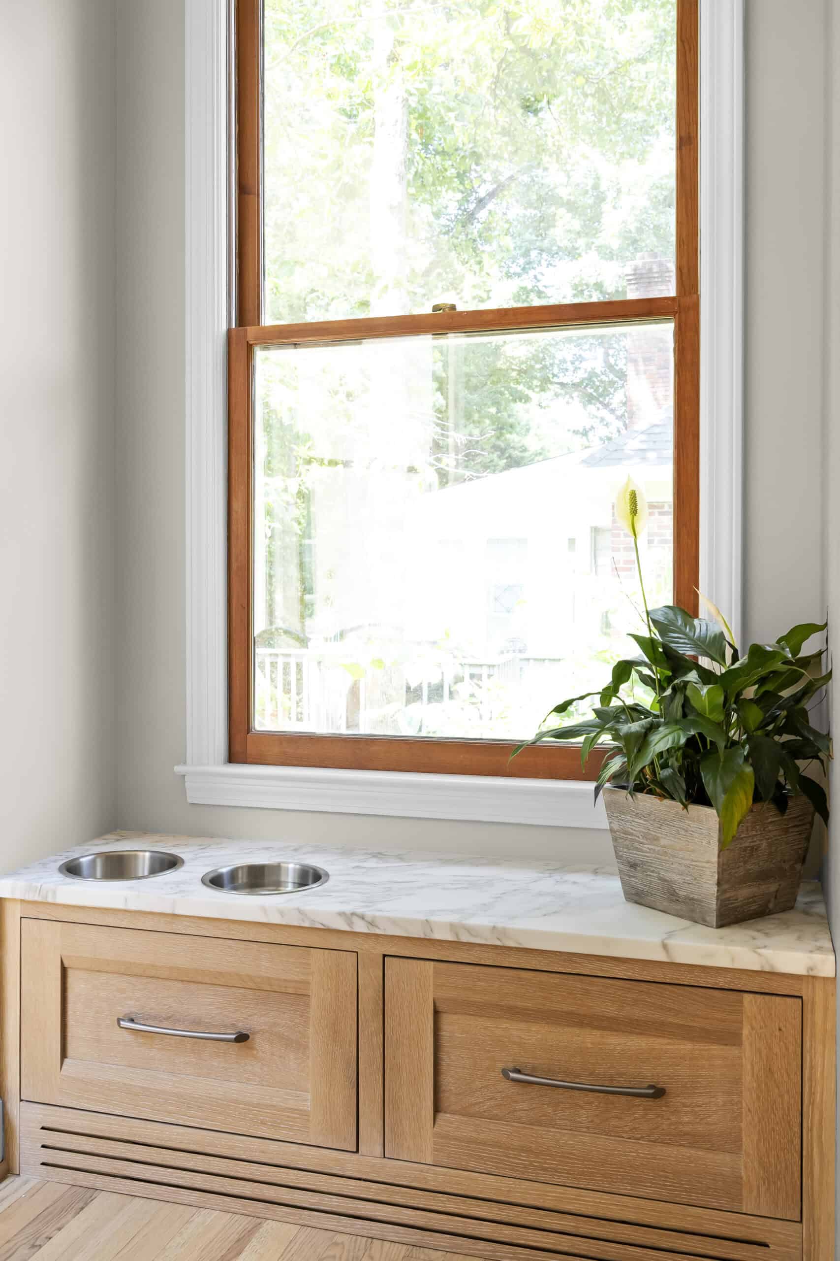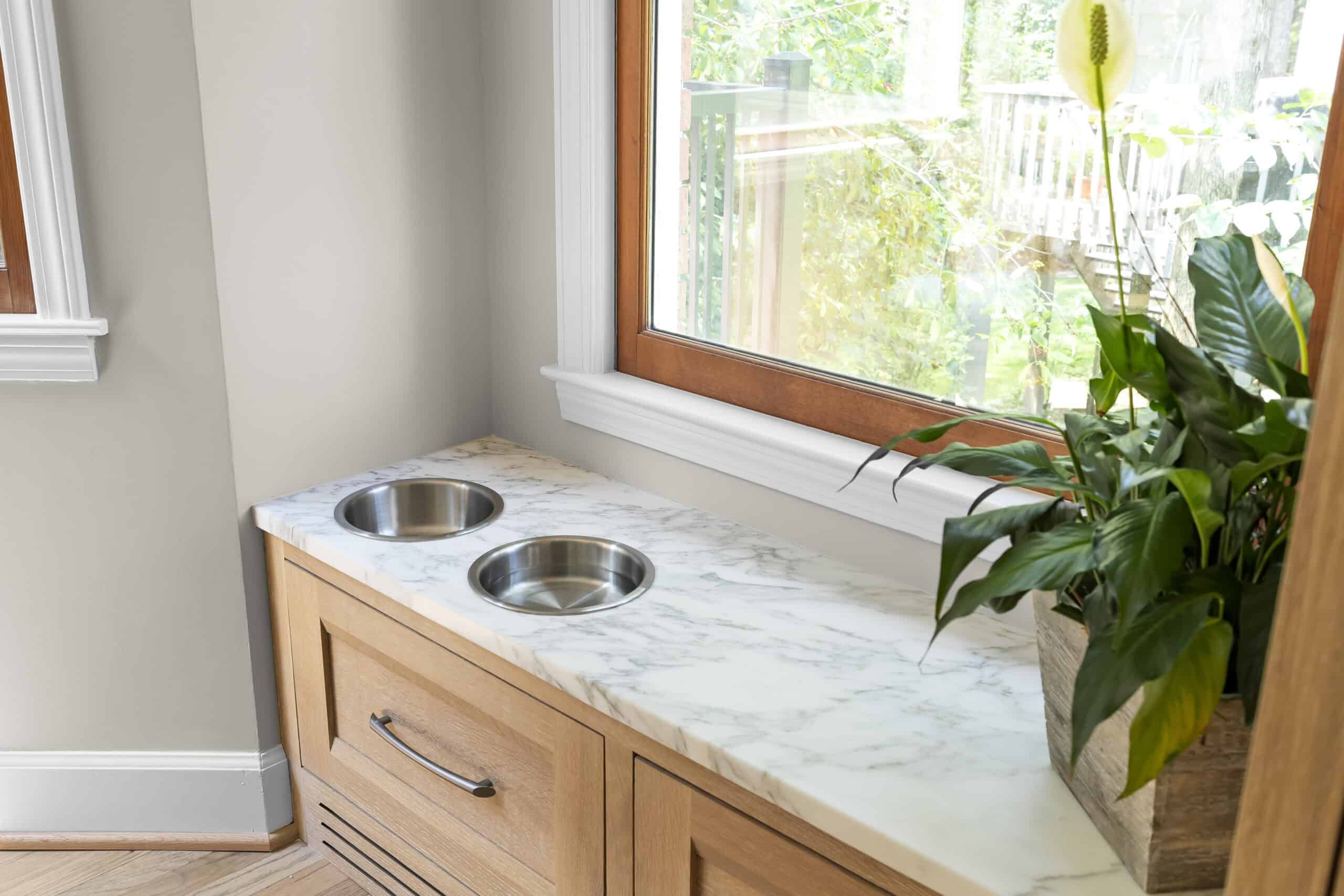 A prep sink, hidden waste containers, full marble backsplash with custom ledge, tiered spice drawers, fluted glass doors, pull-outs for utensils and knives, deep pot and pan drawers, and a pet feeding station for our dog make this kitchen a dream come true.