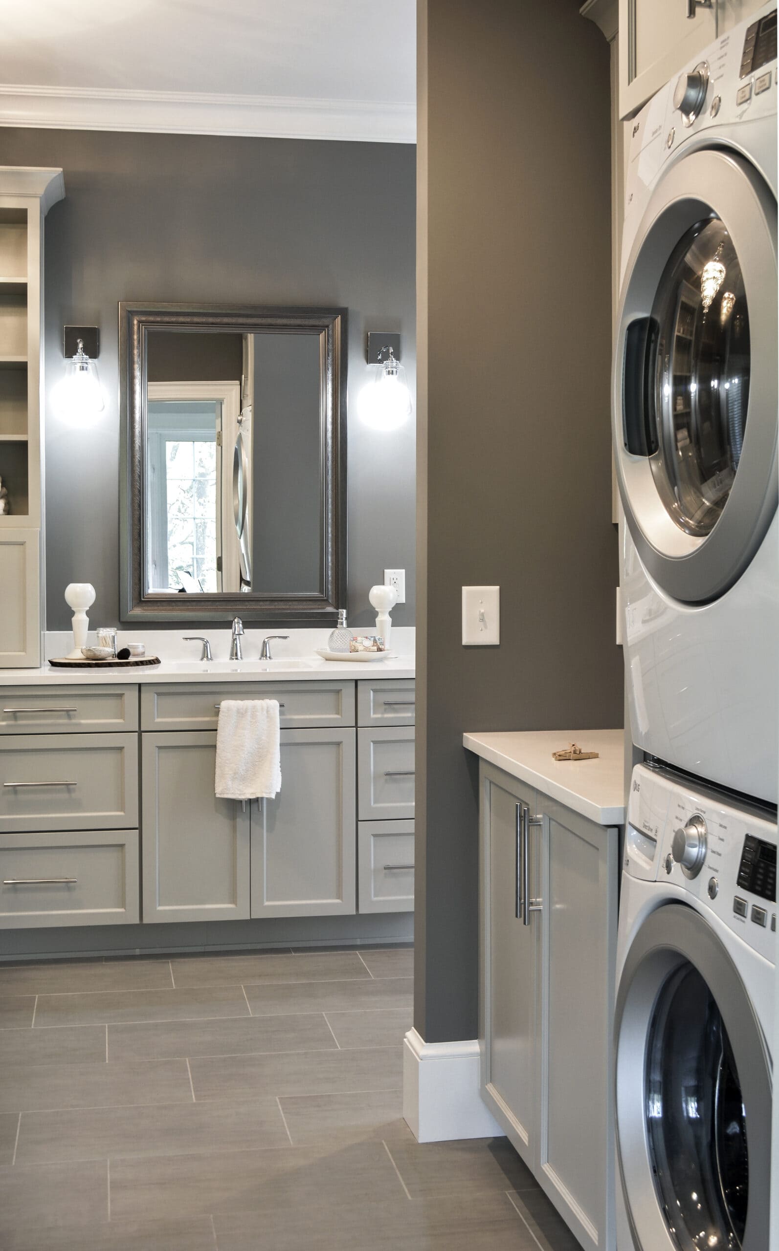 A compact laundry area with stacked washer, dryer, and folding station makes daily routines effortless. The bath’s secondary door connects to the home office for convenience, showcasing thoughtful space planning and design for modern living.