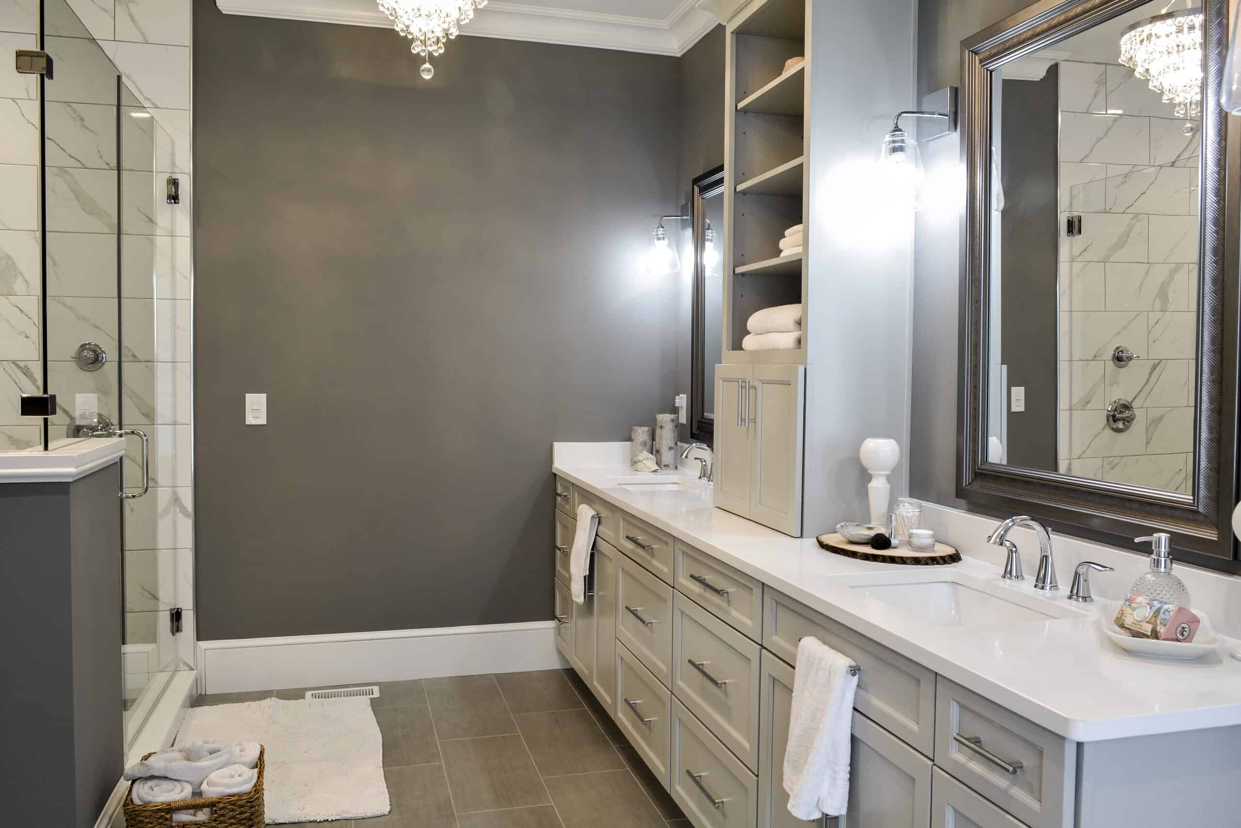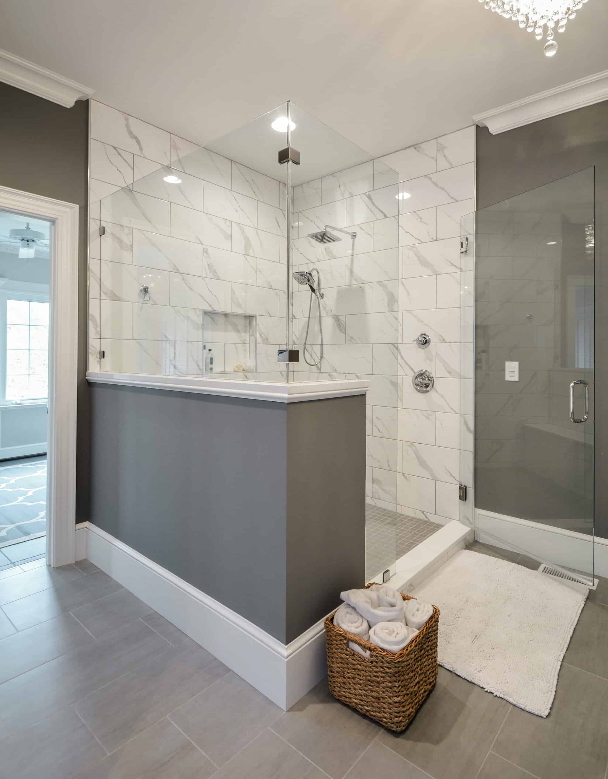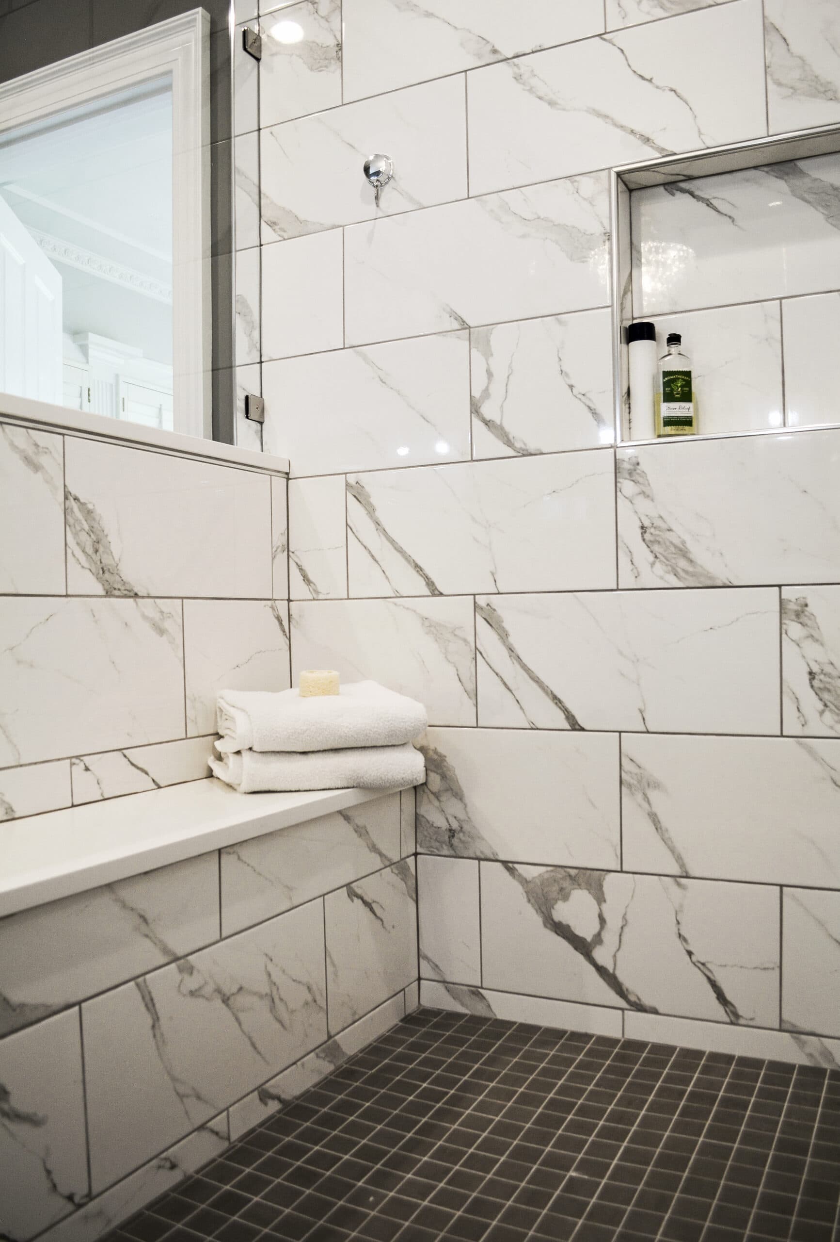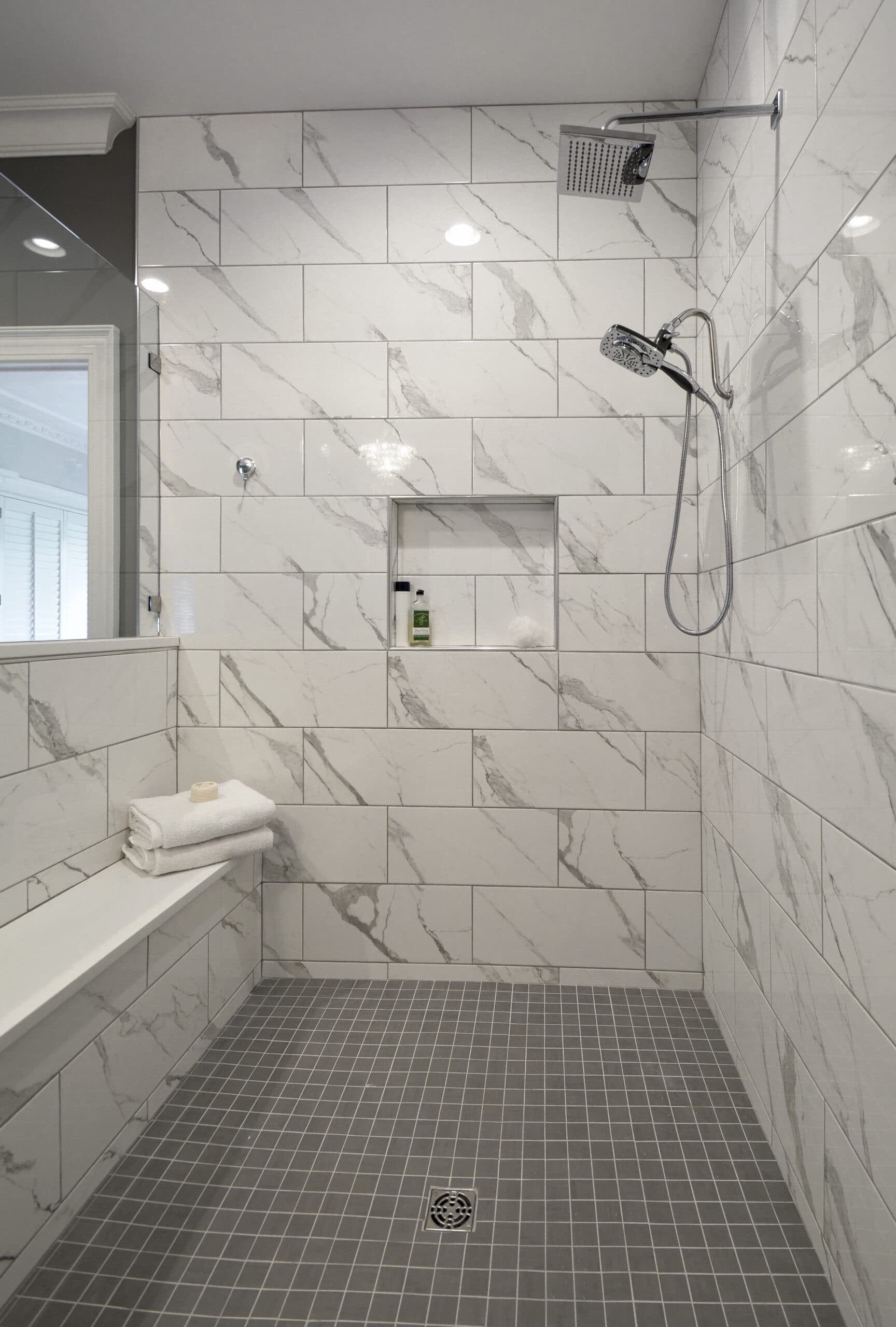 An oversized shower with a built-in bench, glass enclosure, and dual showerheads anchors the new bathroom. A double vanity with a central linen tower, custom cabinetry, and metallic mirrors adds timeless sophistication—reflecting Kerl Design’s expertise in residential bathroom remodeling.