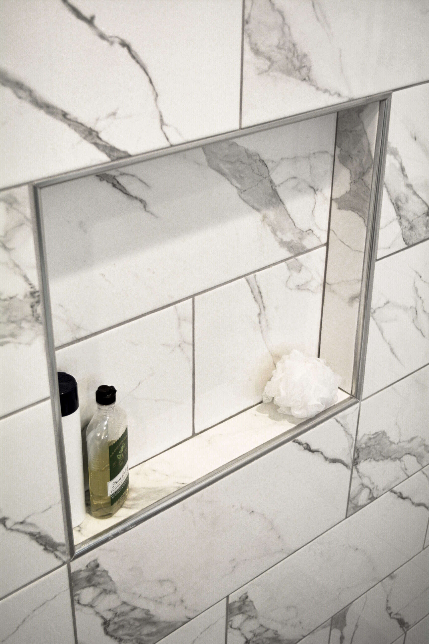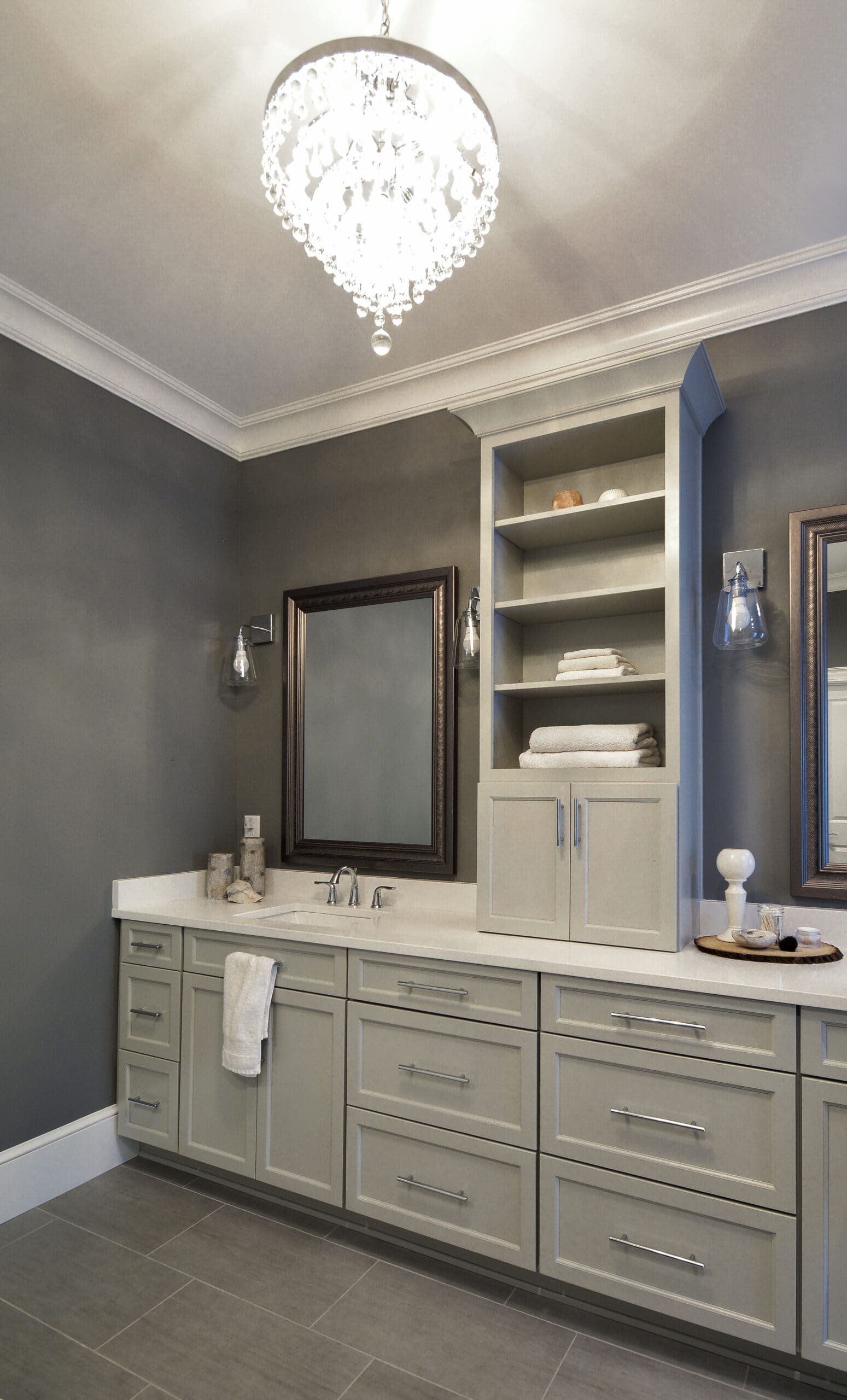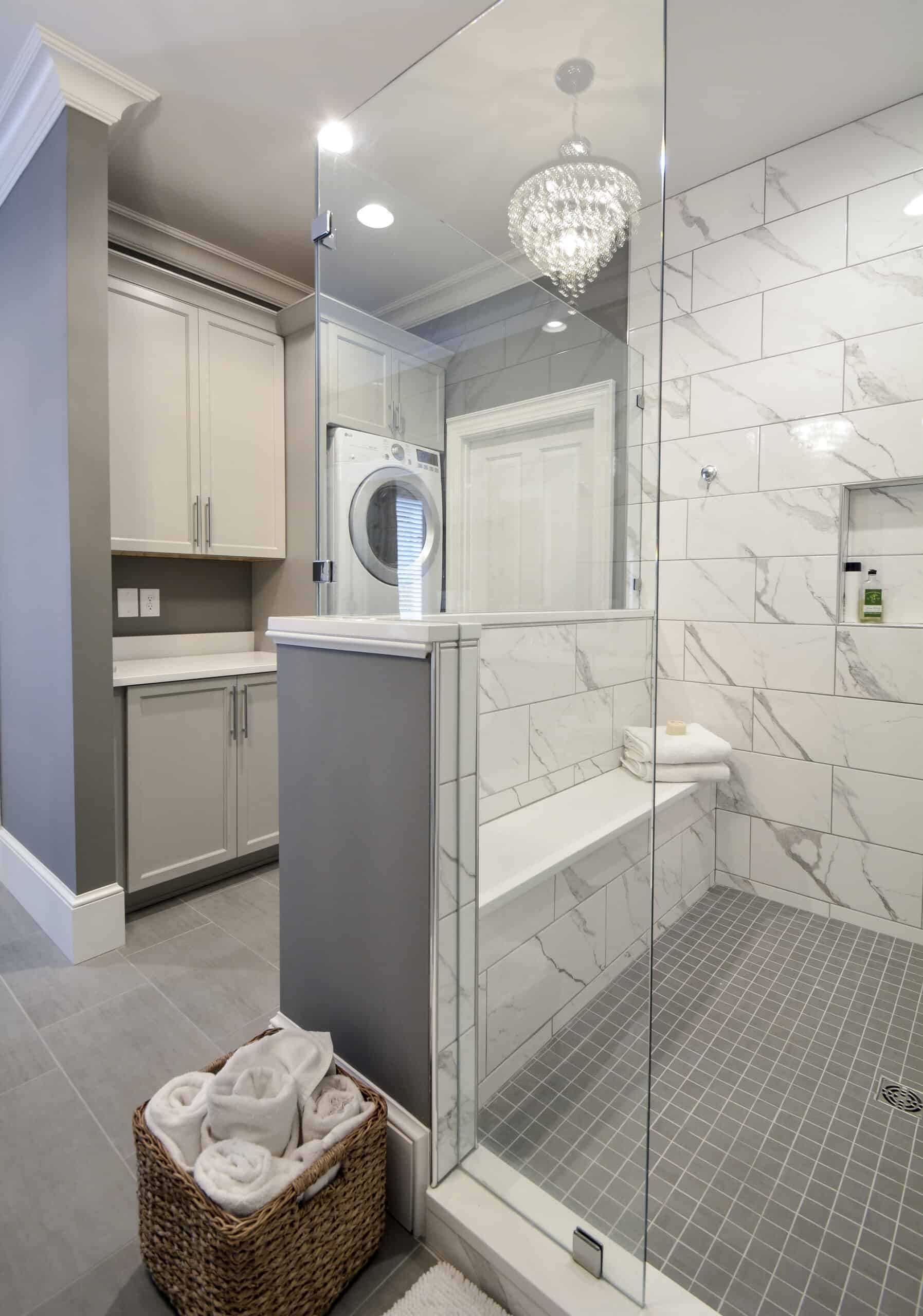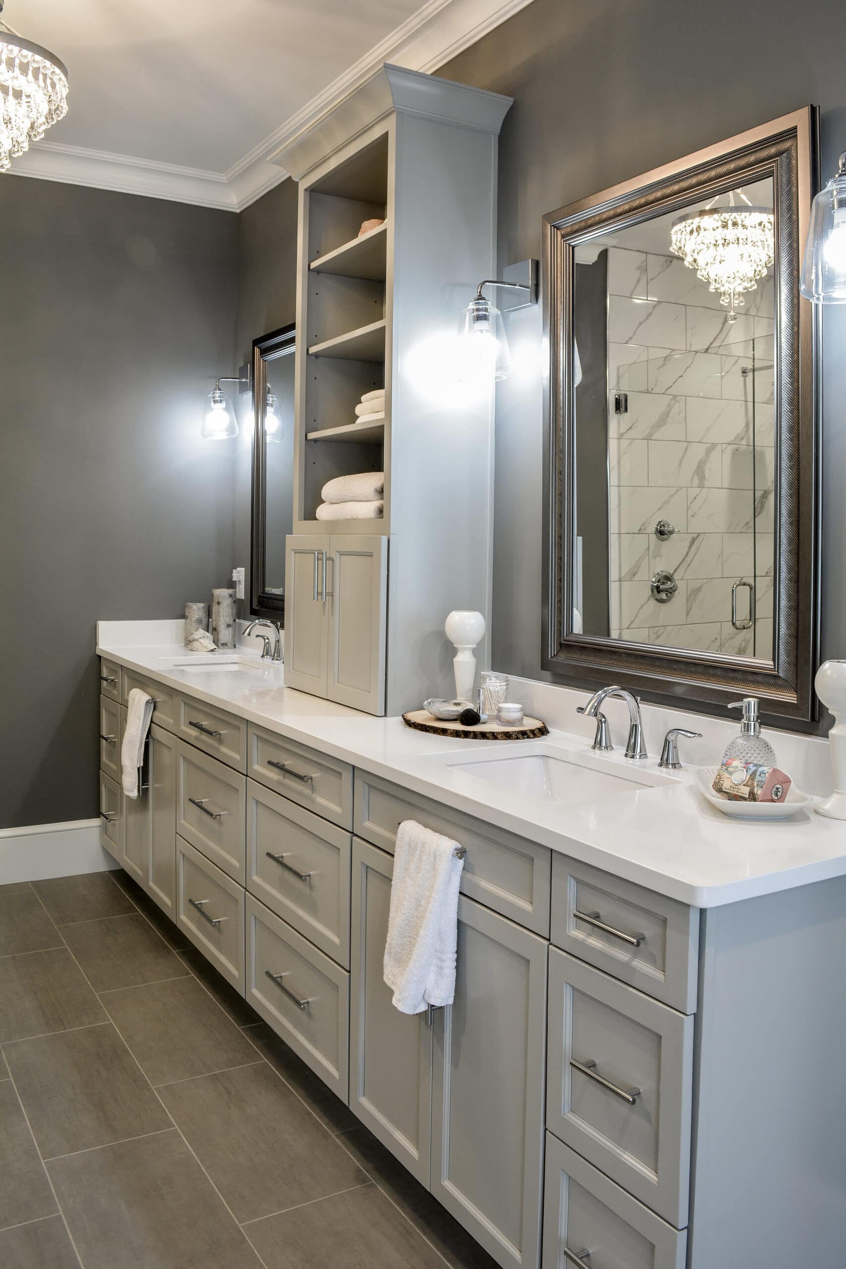 An oversized shower with a built-in bench, glass enclosure, and dual showerheads anchors the new bathroom. A double vanity with a central linen tower, custom cabinetry, and metallic mirrors adds timeless sophistication—reflecting Kerl Design’s expertise in residential bathroom remodeling.