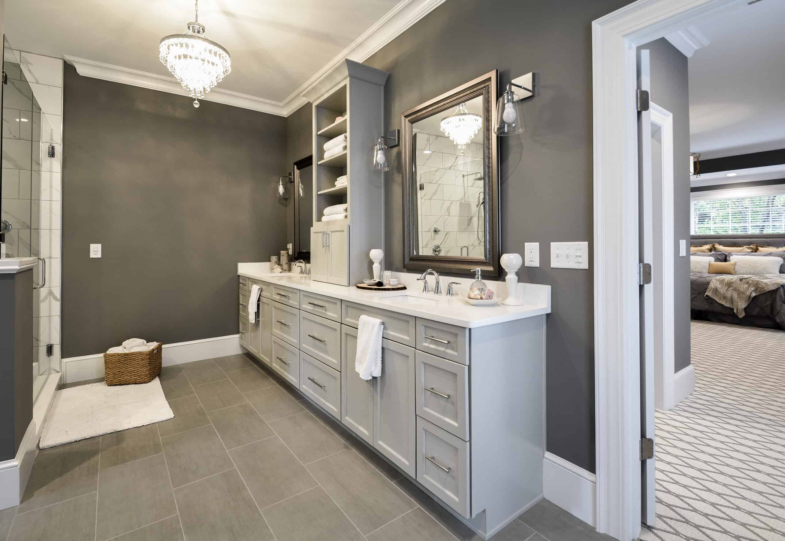 Warm greys and milky whites evoke tranquility. Quartz countertops, a private water closet, and direct closet access make this space both indulgent and efficient—a true example of Kerl Design’s elevated approach to bathroom design in Greenville.
